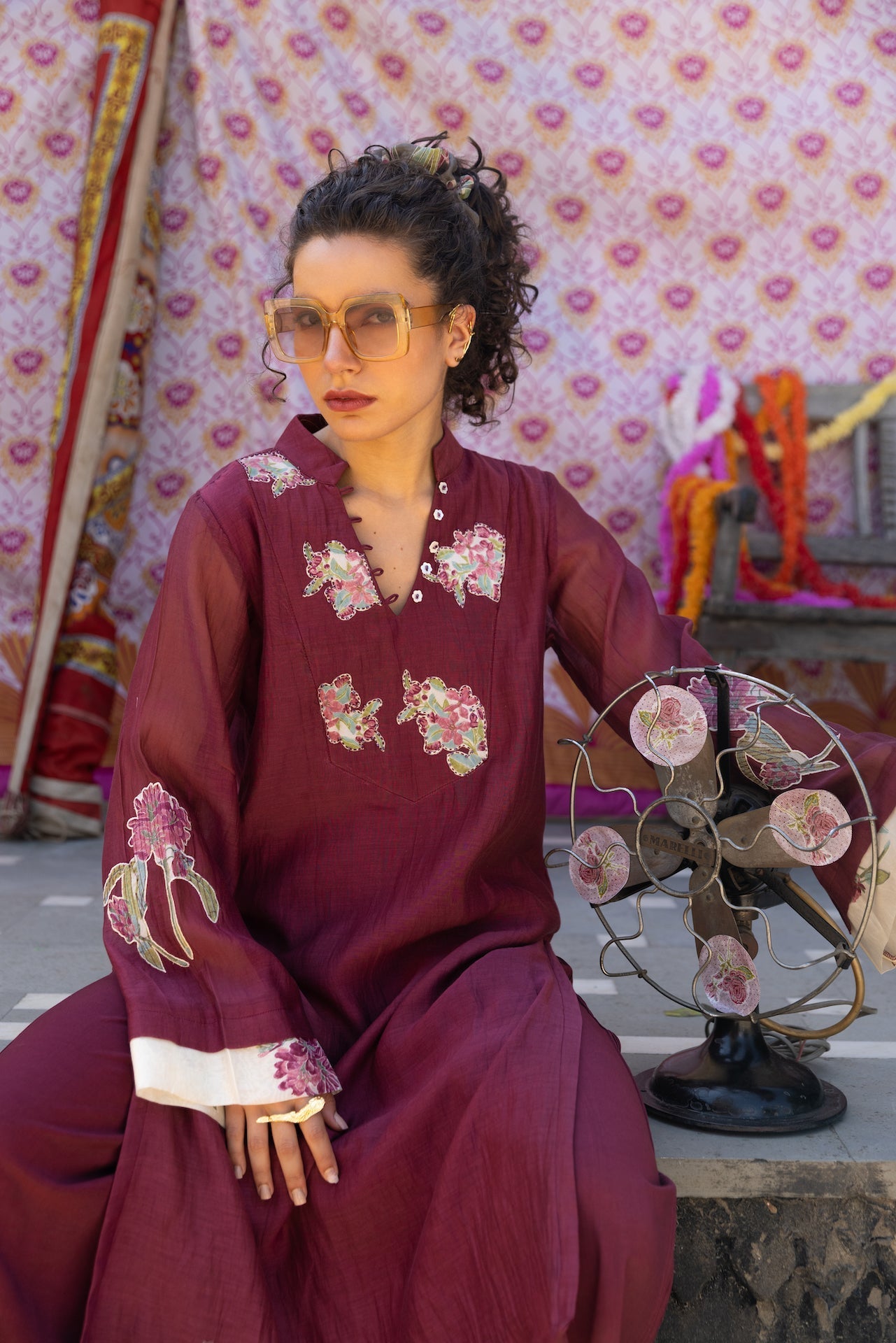 A split V-neck and full sleeves bring quiet structure to the Anya kurta’s fluid Wine Chanderi. Minimal detailing frames the rich color and airy drape. Elevated simplicity. Sleeves