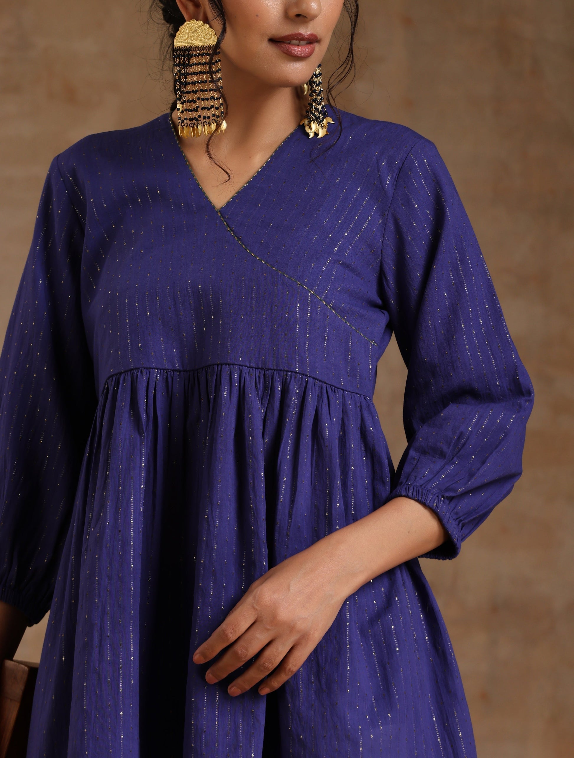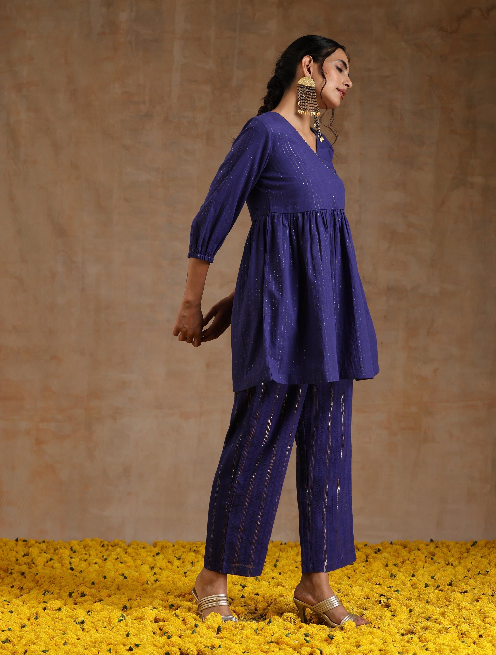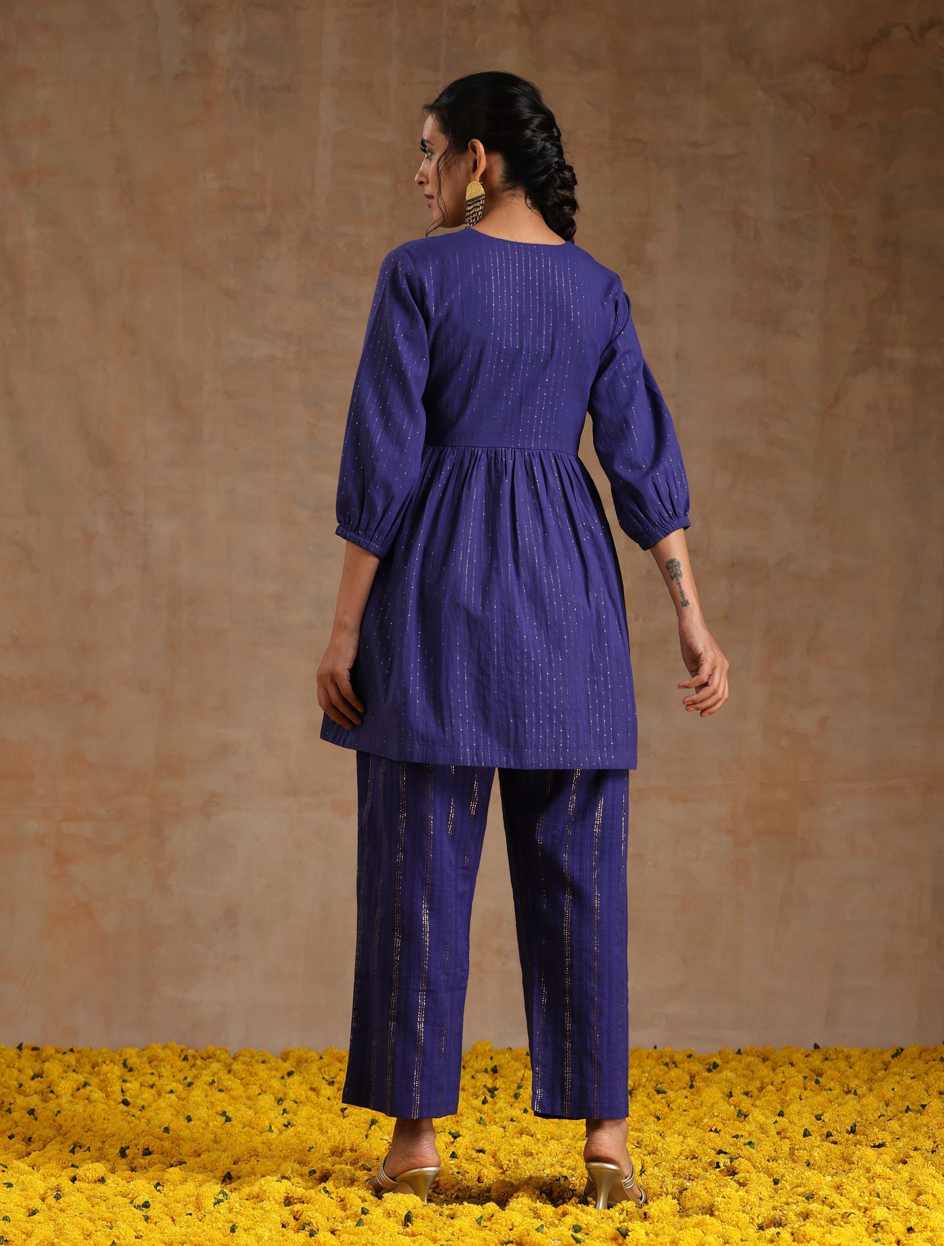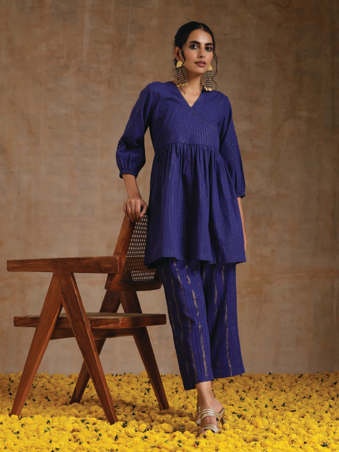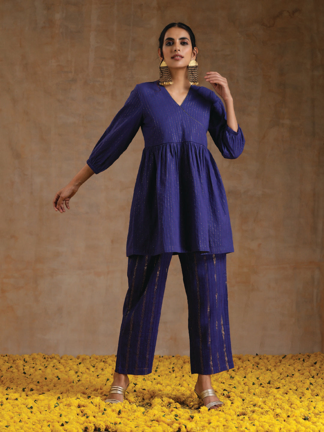- Cotton Lurex short co-ord set with overlap angrakha look. Paired with elasticated waist pant.