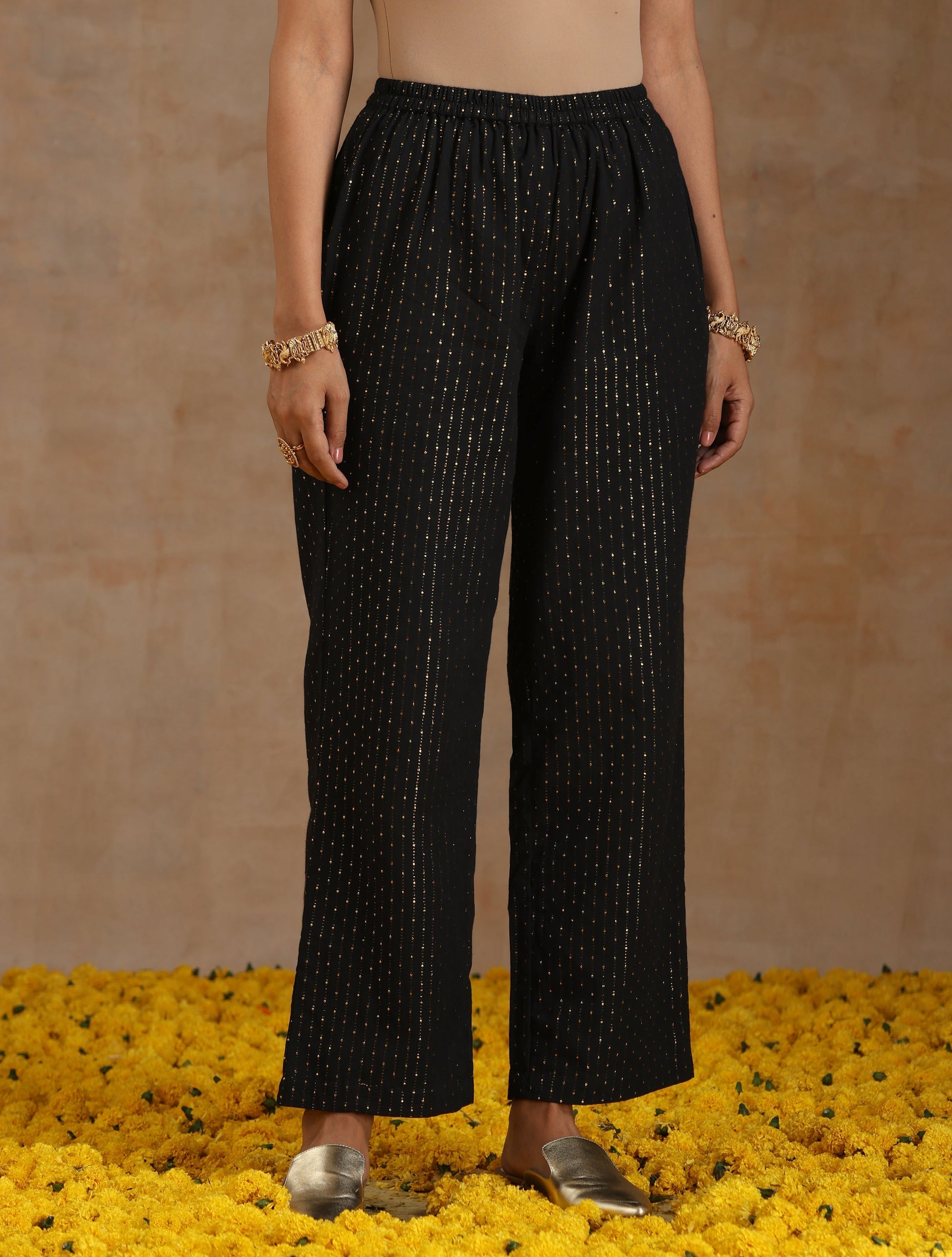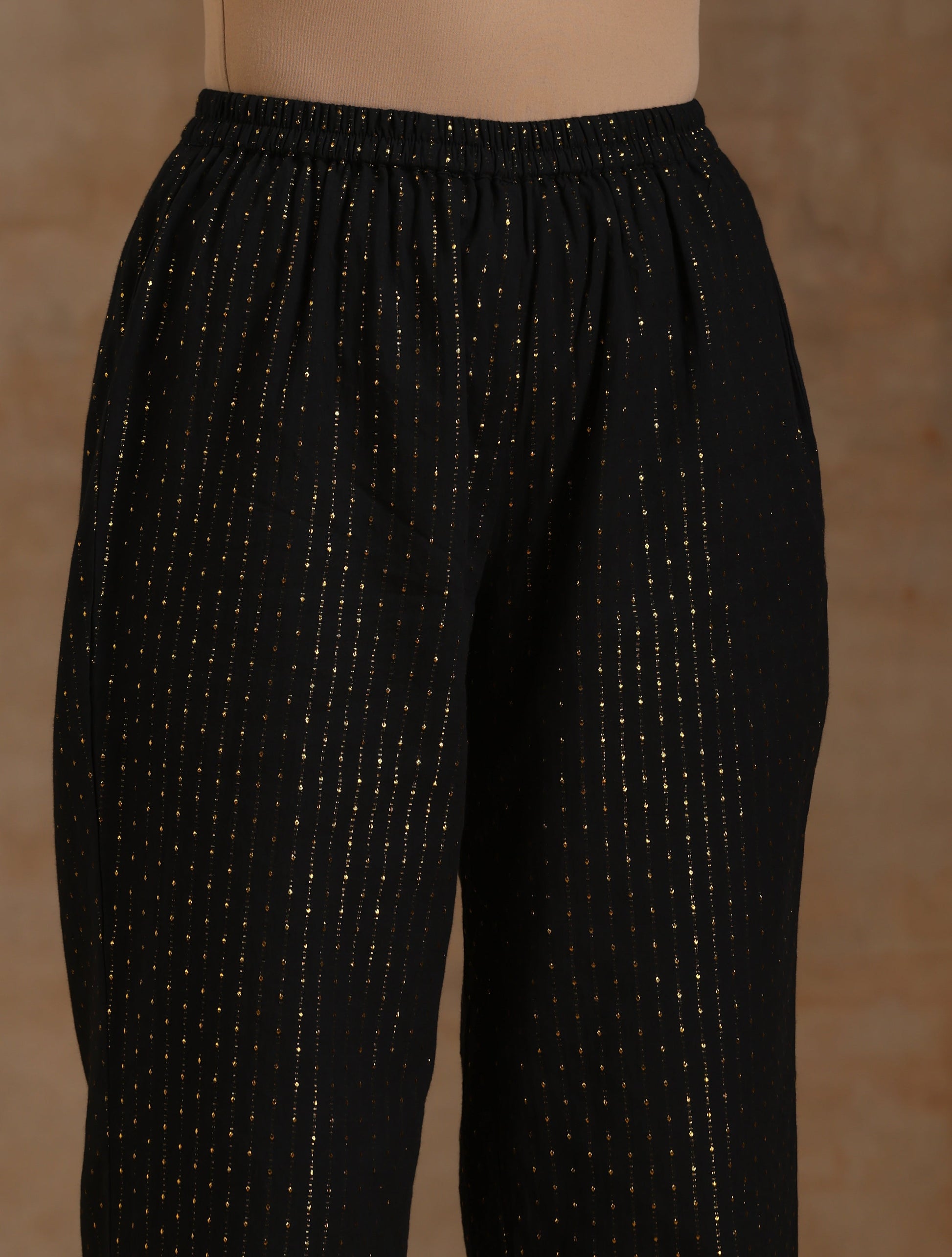 - Cotton Lurex kurta with overlap yoke and puff sleeve. It comes along with elasticated pants.