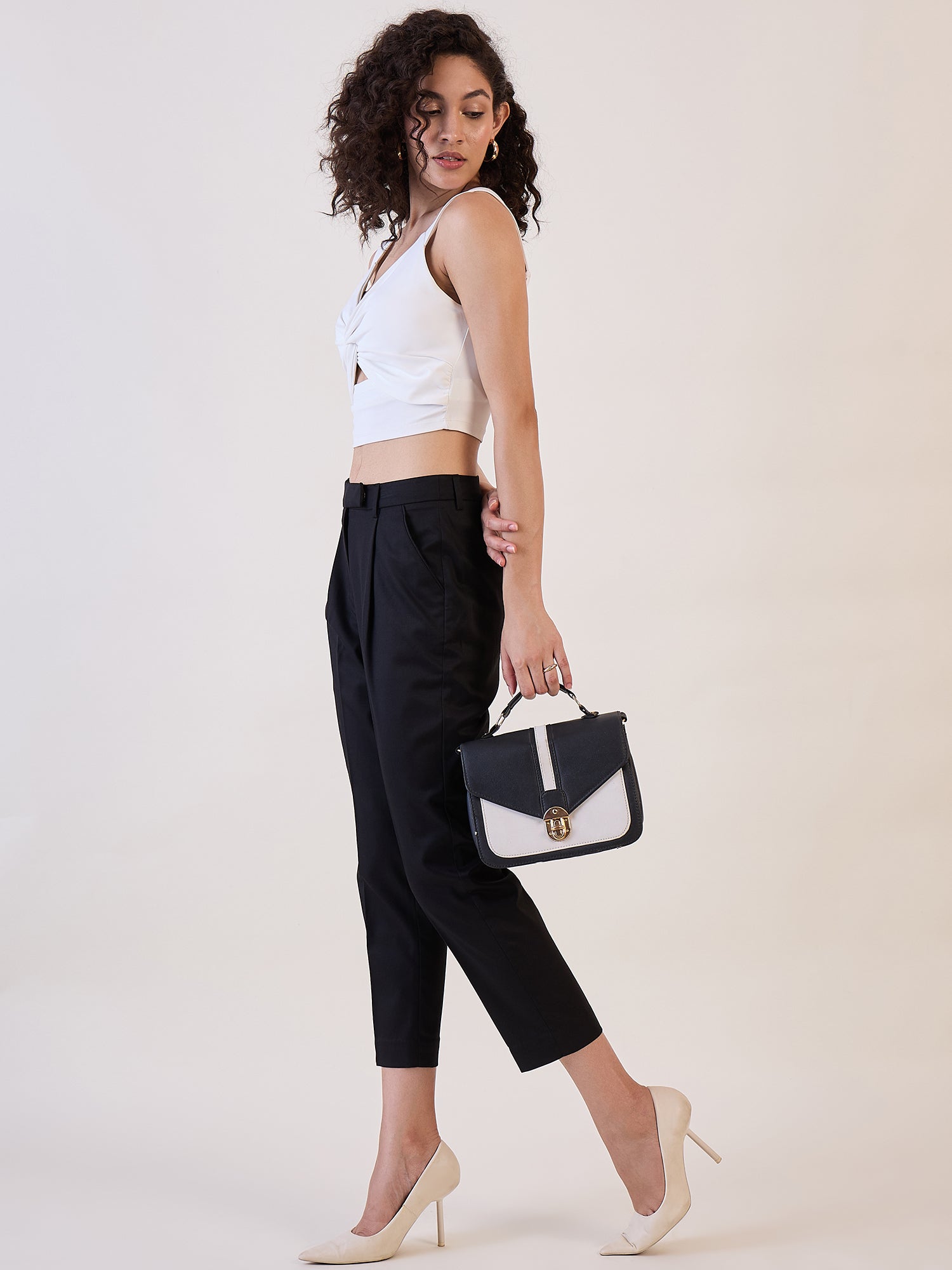 Slip into our premium Poly-Viscose blend black Pleated Tapered Hem Trousers tailored to offer the best comfort and style. Tapered leg stitch, distinctive pleats on the front and the elastic waistbands add just the right amount of elegance to your basic everyday look which is perfect for day-long wear in a chic and polished silhouette. Pair with our camel brown wrapped knitted top and heels for a sophisticated look.