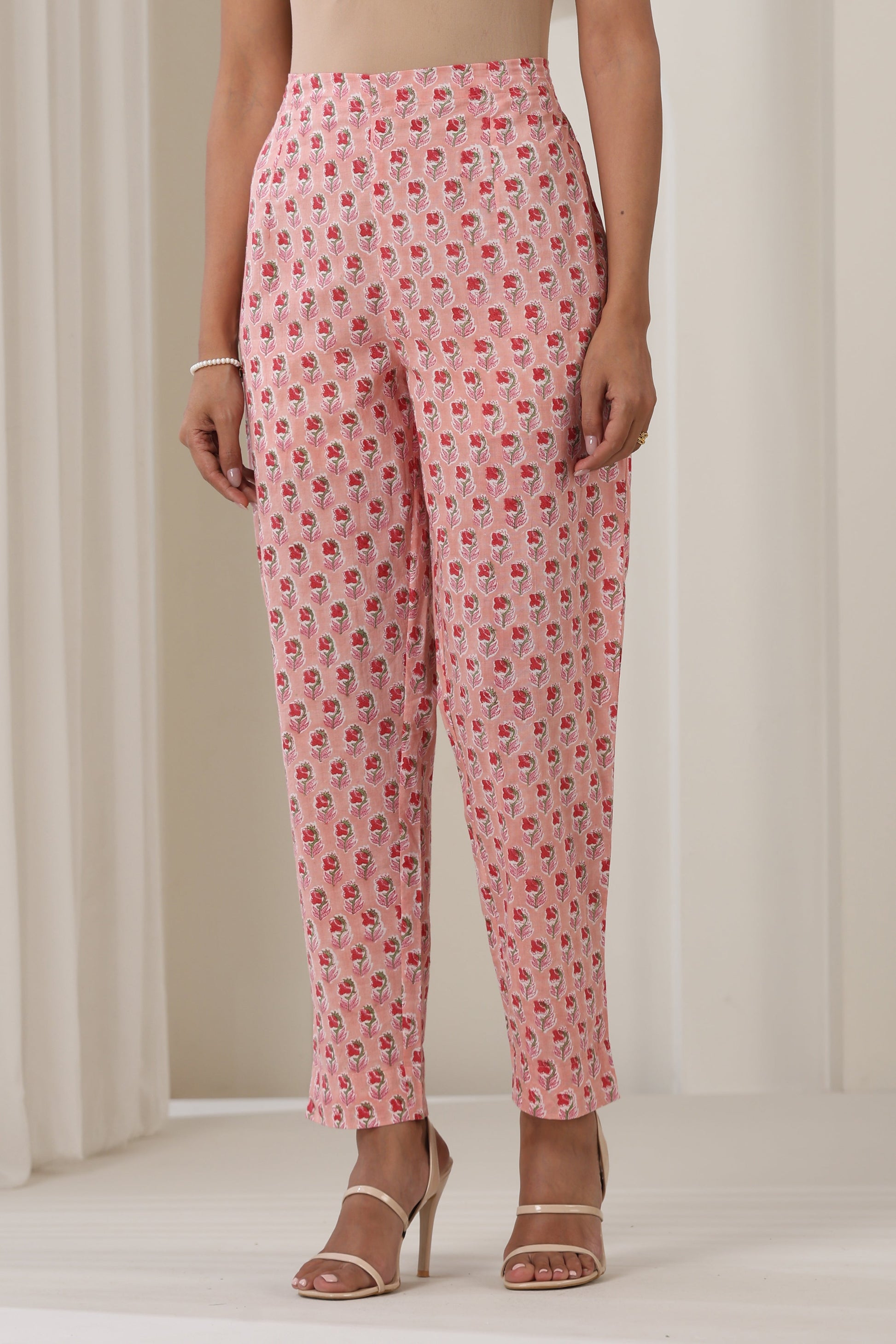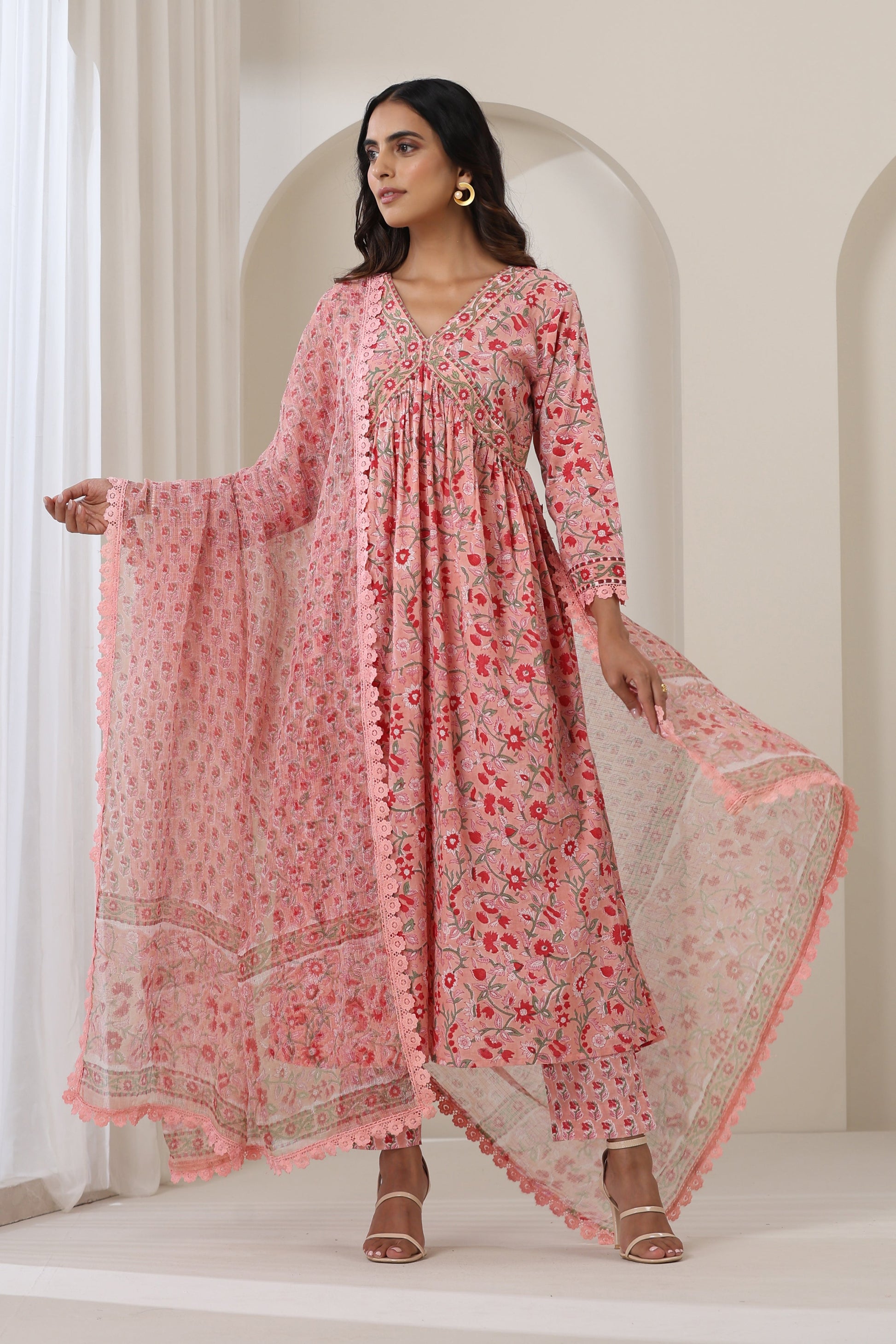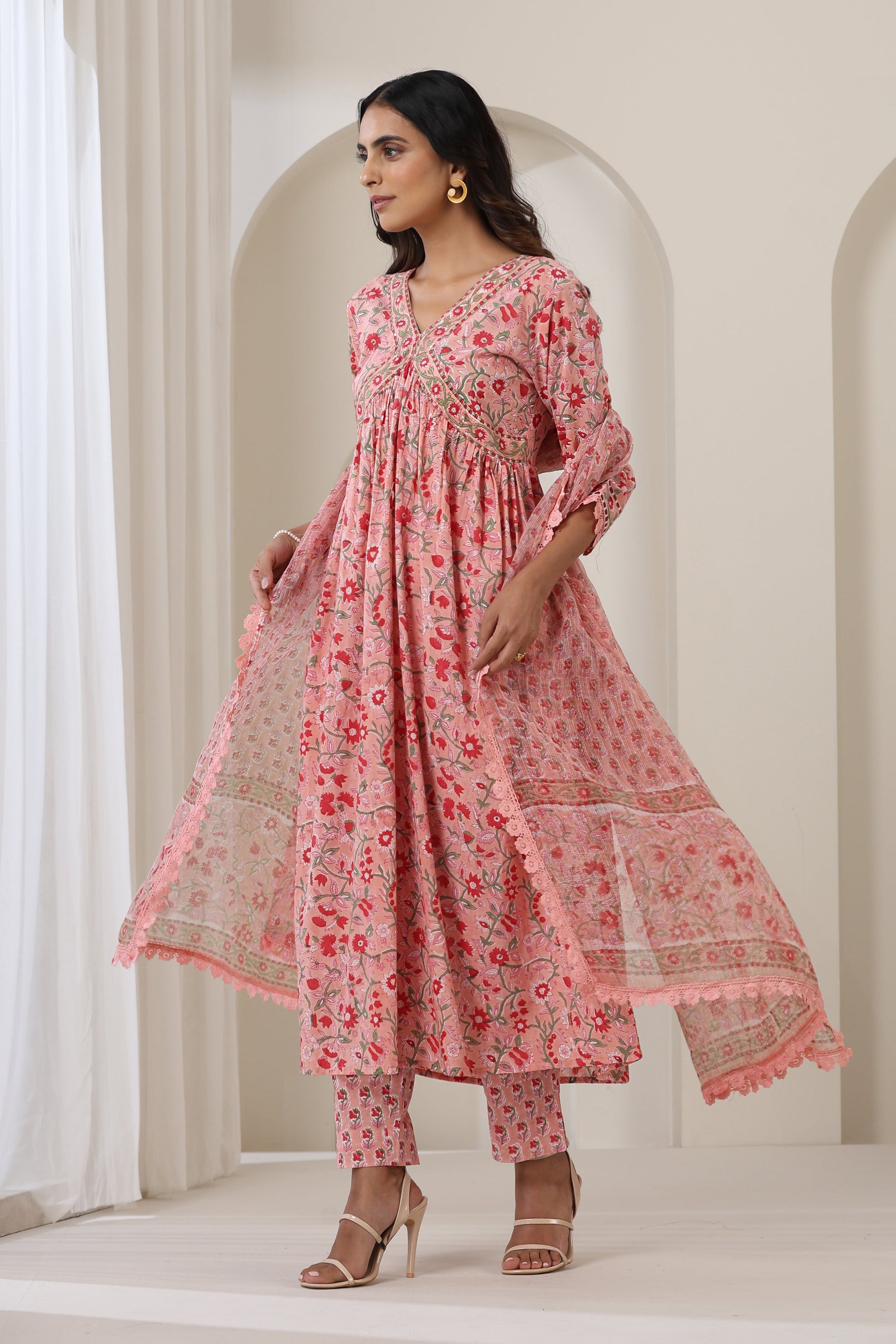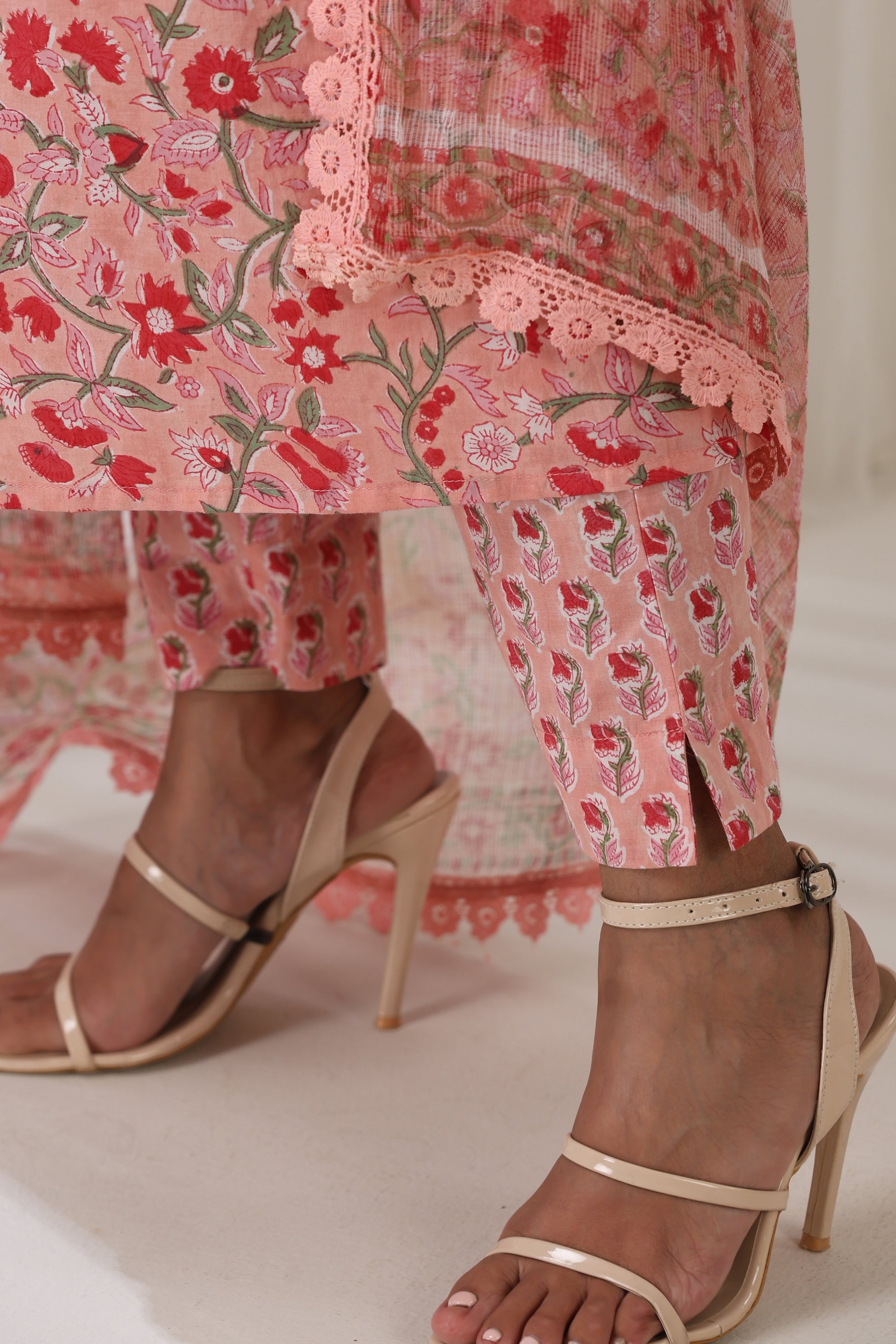 The Blooming Peach Gathered Kurta Set showcases a vibrant hand-block printed floral pattern against a striking peach colour, making it a great addition to your summer wardrobe. Expertly handcrafted in soft cotton fabric, it has a fitted bodice for a flattering feminine fit. Delicate floral lace detailing on the cuffs and all around the dupatta adds charm to the outfit. The look is completed with matching motif straight pants and a Kota Doria dupatta.