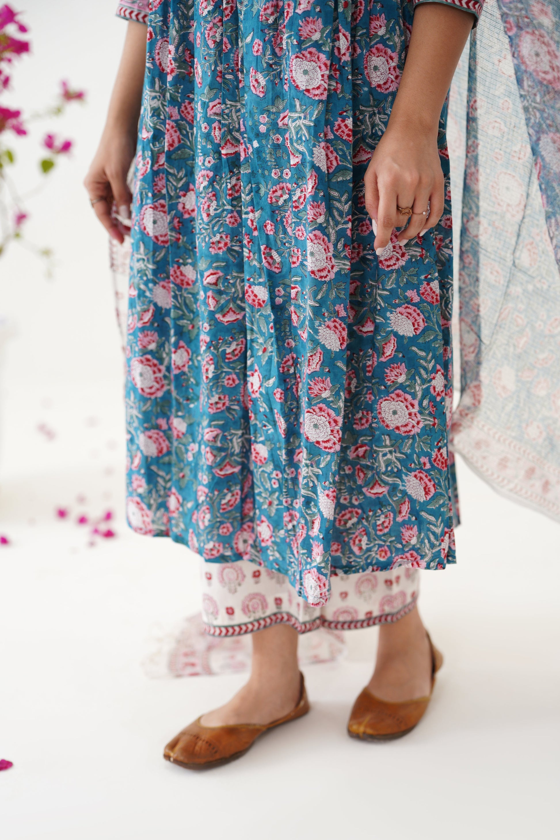 This graceful hand-block printed set comes with a blue floral gathered kurta with a fitted bodice for a flattering feminine fit. Charming pearl and sequin hand embroidery on the yoke and cuffs makes it a perfect addition to your spring-summer wardrobe. Complete your look with the contrasting motif palazzo pants and a whimsical kota doria dupatta.