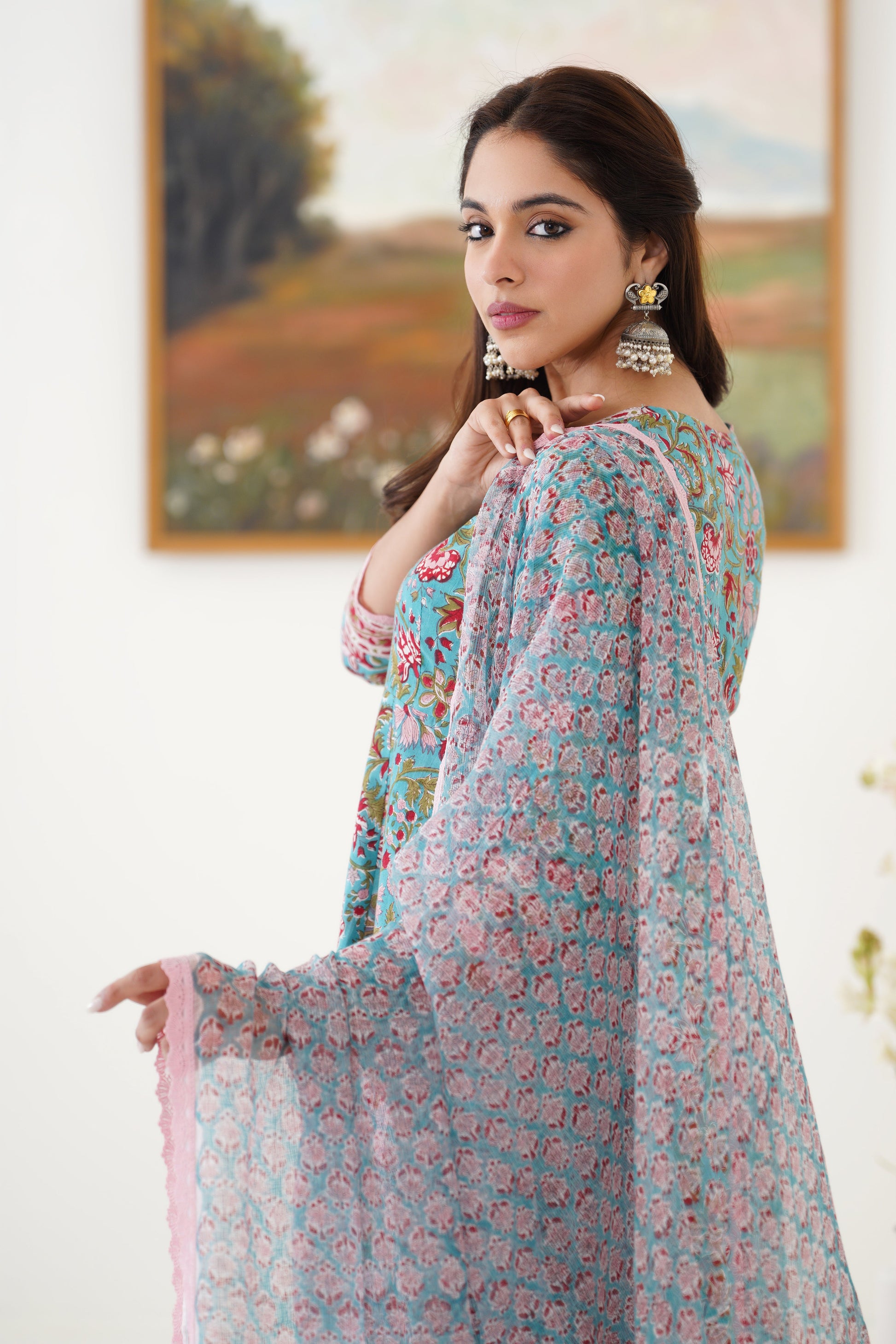 Our Blue Edith Anarkali Set comes with a striking hand-block printed blue floral jaal and is the perfect outfit to twirl in! It comes with a unique neckline, and the outfit is enhanced with charming pink lace on the cuffs and all around the dupatta, making it a perfect addition to your spring-summer wardrobe. Complete your look with matching palazzo pants and a whimsical Kota Doria dupatta.
