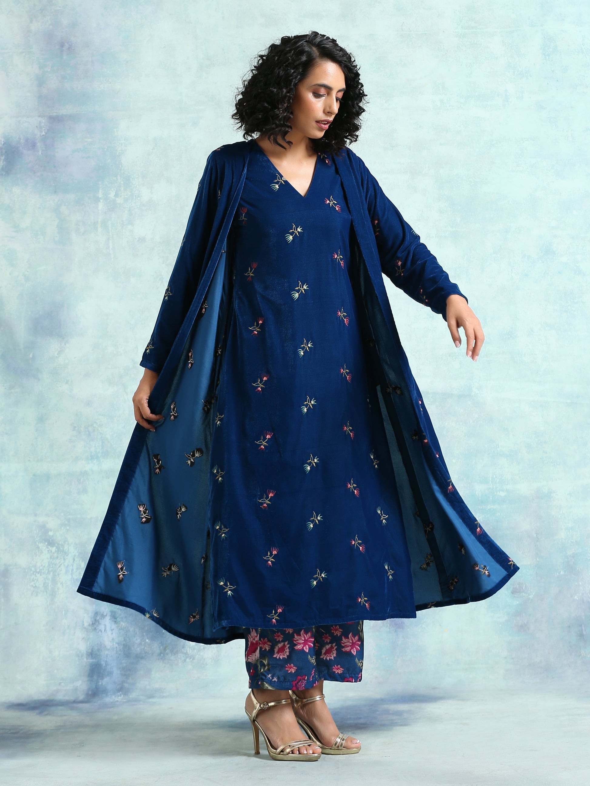 - Velvet embroidered overlay jacket with front open and full sleeves.
