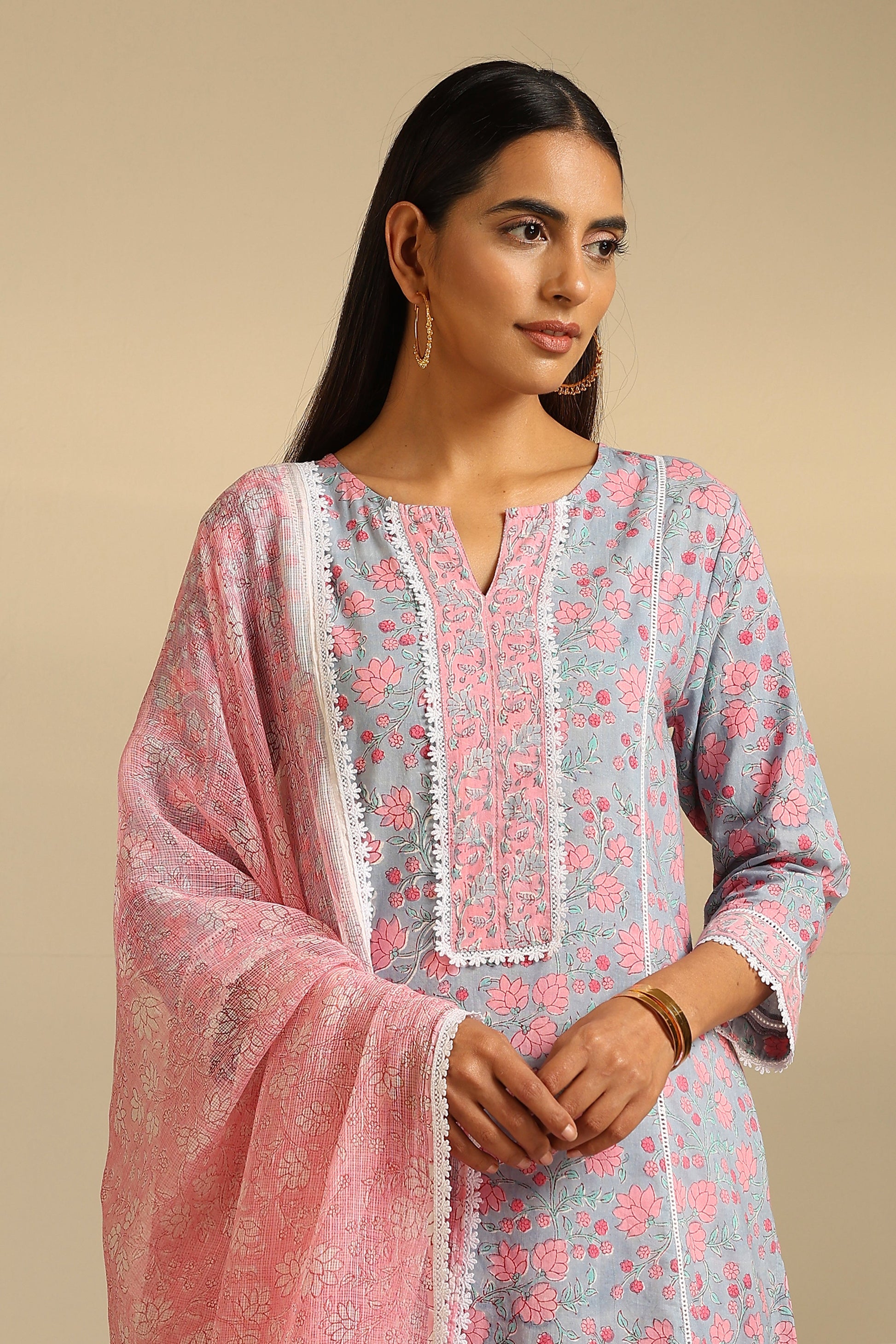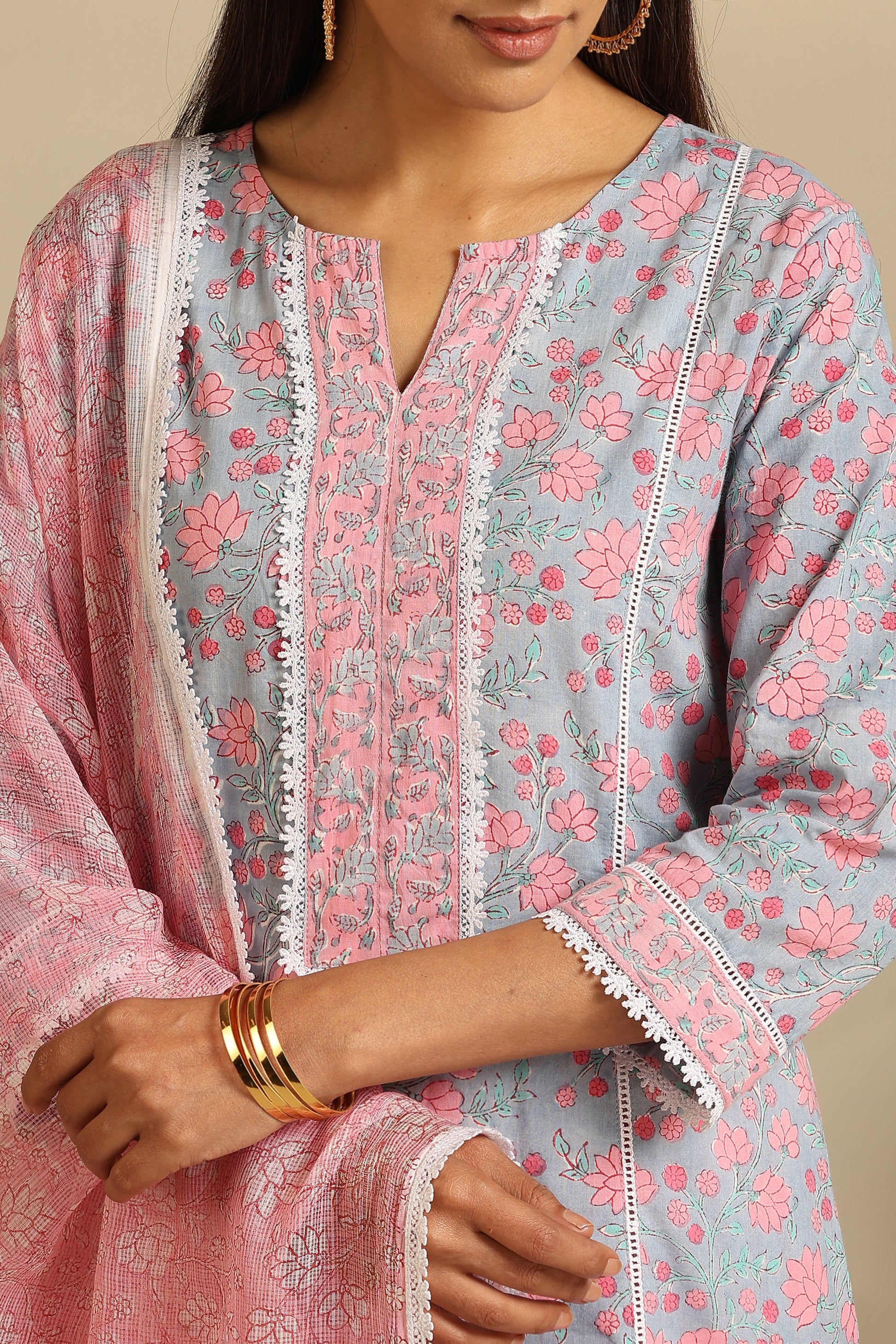 Our Blue Hyacinth Floral Kurta Set is graced with a pleasing hand-block printed floral pattern against a soothing blue color. The outfit is adorned with delicate summery lace on the neckline, hem, cuffs, and pants, making it a sure-shot headturner! It is teamed with a contrasting pink Kota doria dupatta with matching lace to complete the look.