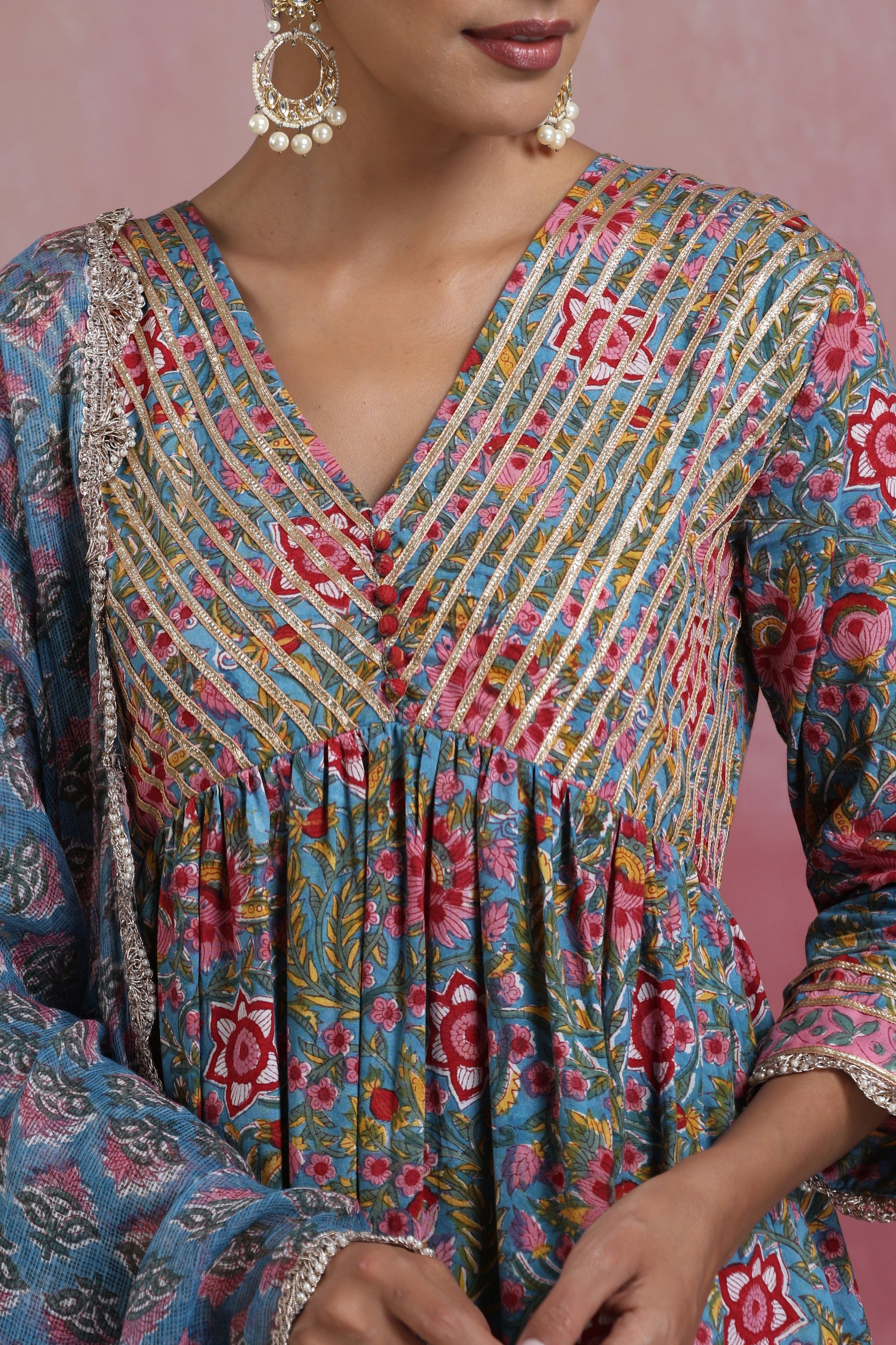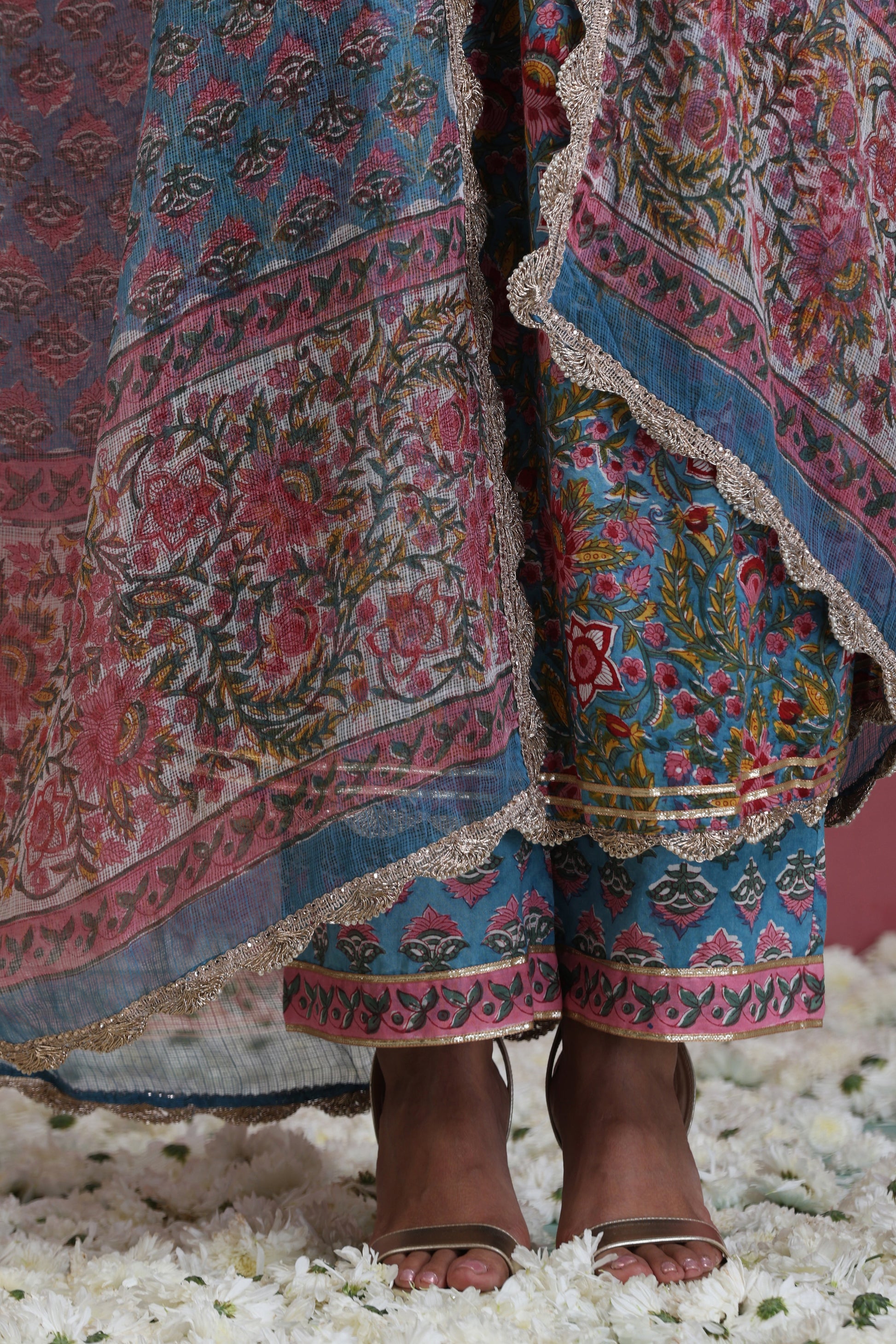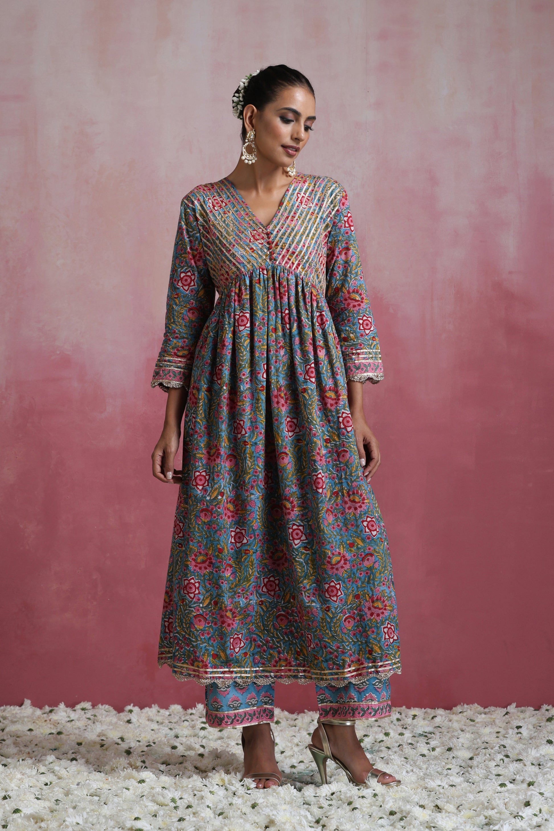 Our Blue Inaya Floral Anarkali Set is graced with a pleasing hand-block printed floral multicoloured pattern against a striking blue colour, making it an ideal outfit for the upcoming festive season. Adorned with charming gold gota detailing on the bodice and scallop lace on the hem and dupatta, this set is a sure-shot head-turner! The look is completed with matching pants with gota detailing.