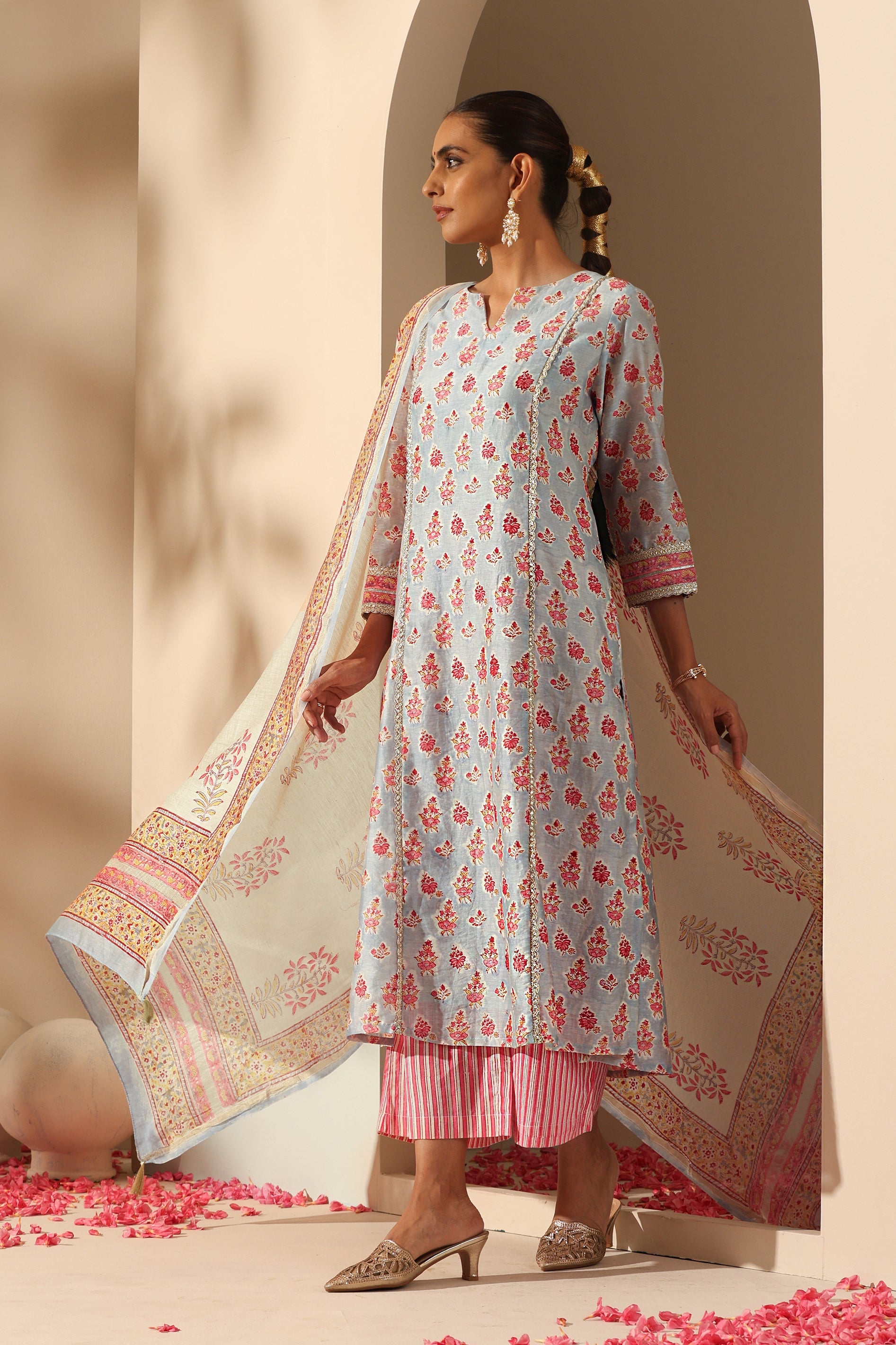 Our Calla Blue Chanderi Kurta Set is graced with pleasing hand-block printed floral motifs against a serene blue colour on lush Chanderi fabric. The A line kurta is lined and is adorned with charming gold lace along the length and cuffs. It is teamed with the comfiest cotton palazzos and a striking Chanderi dupatta enhanced with gold tassels!