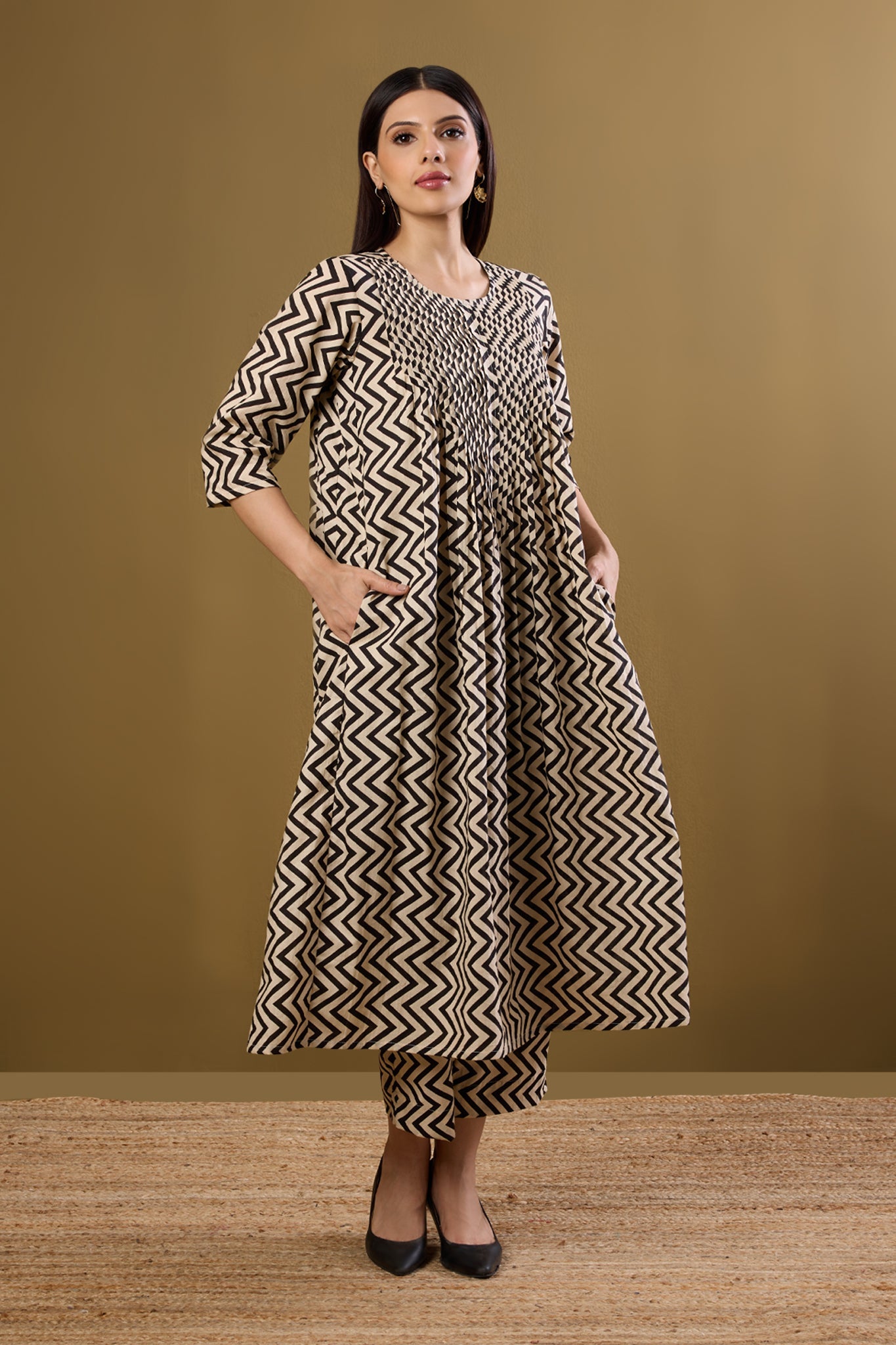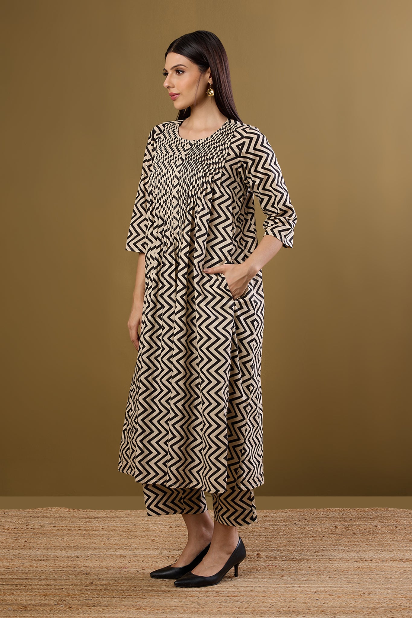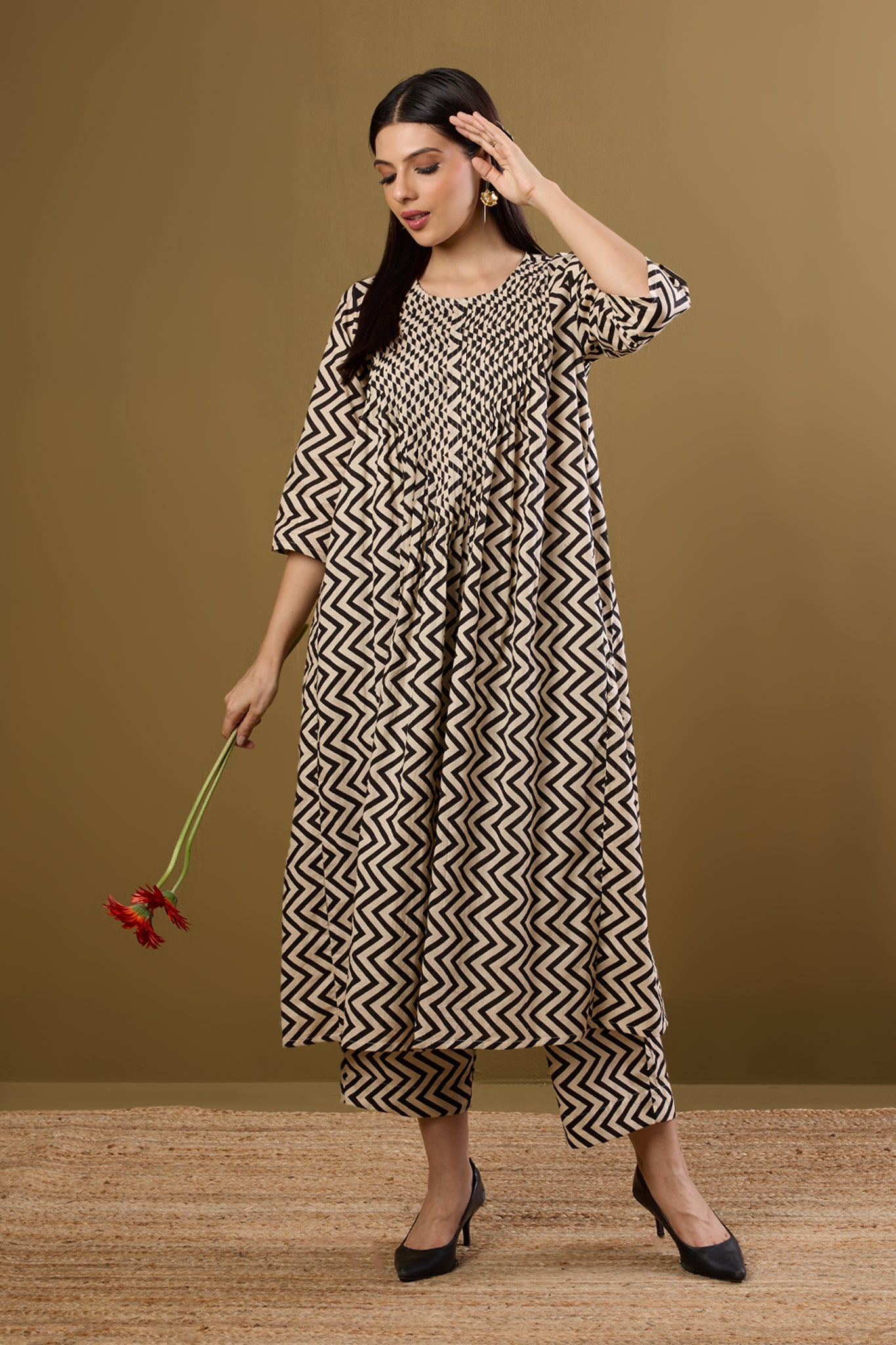 Maati Craft Co-ord Set Bold Noir Chevron Pintuck Long Dress & Pants