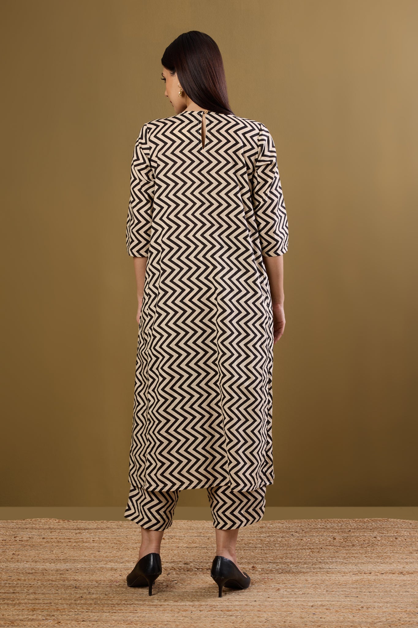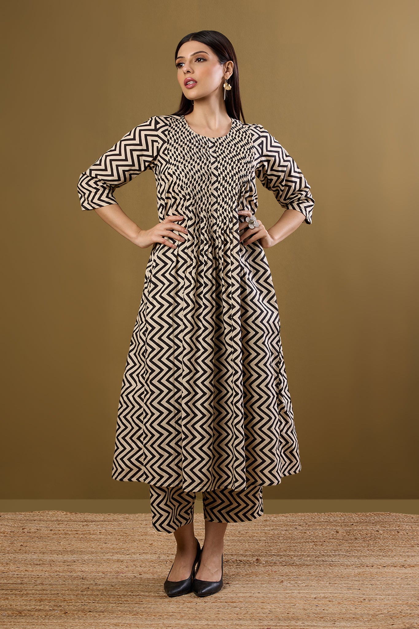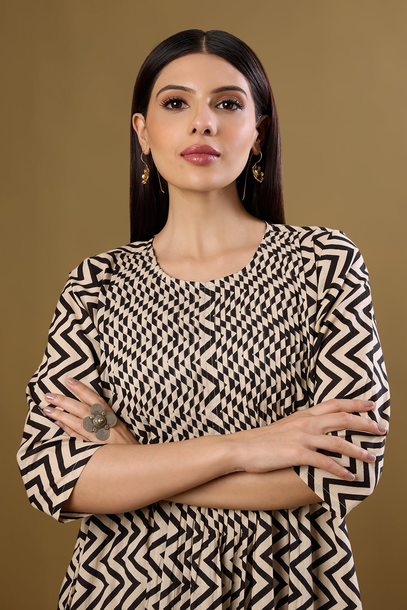 Maati Craft Co-ord Set Bold Noir Chevron Pintuck Long Dress & Pants