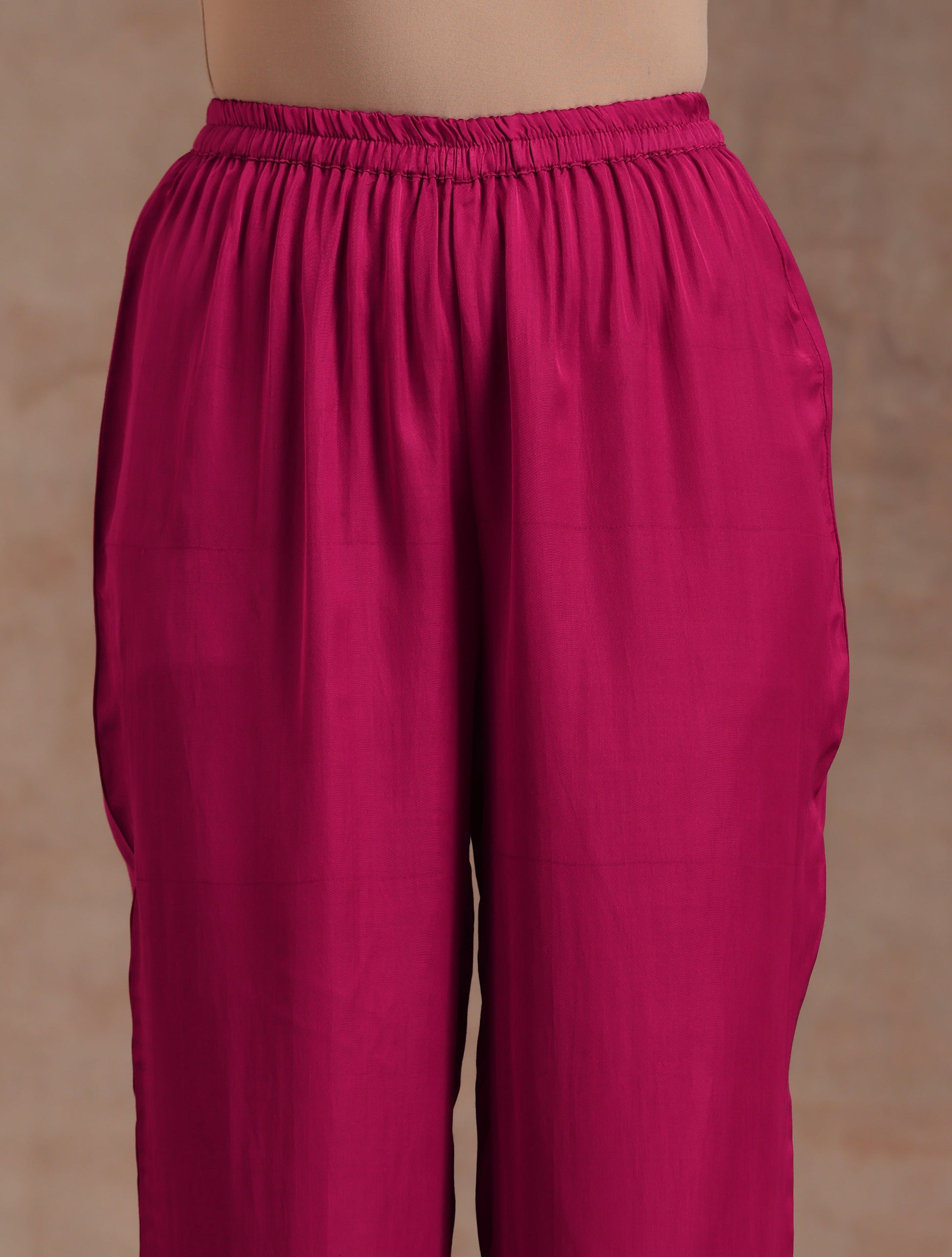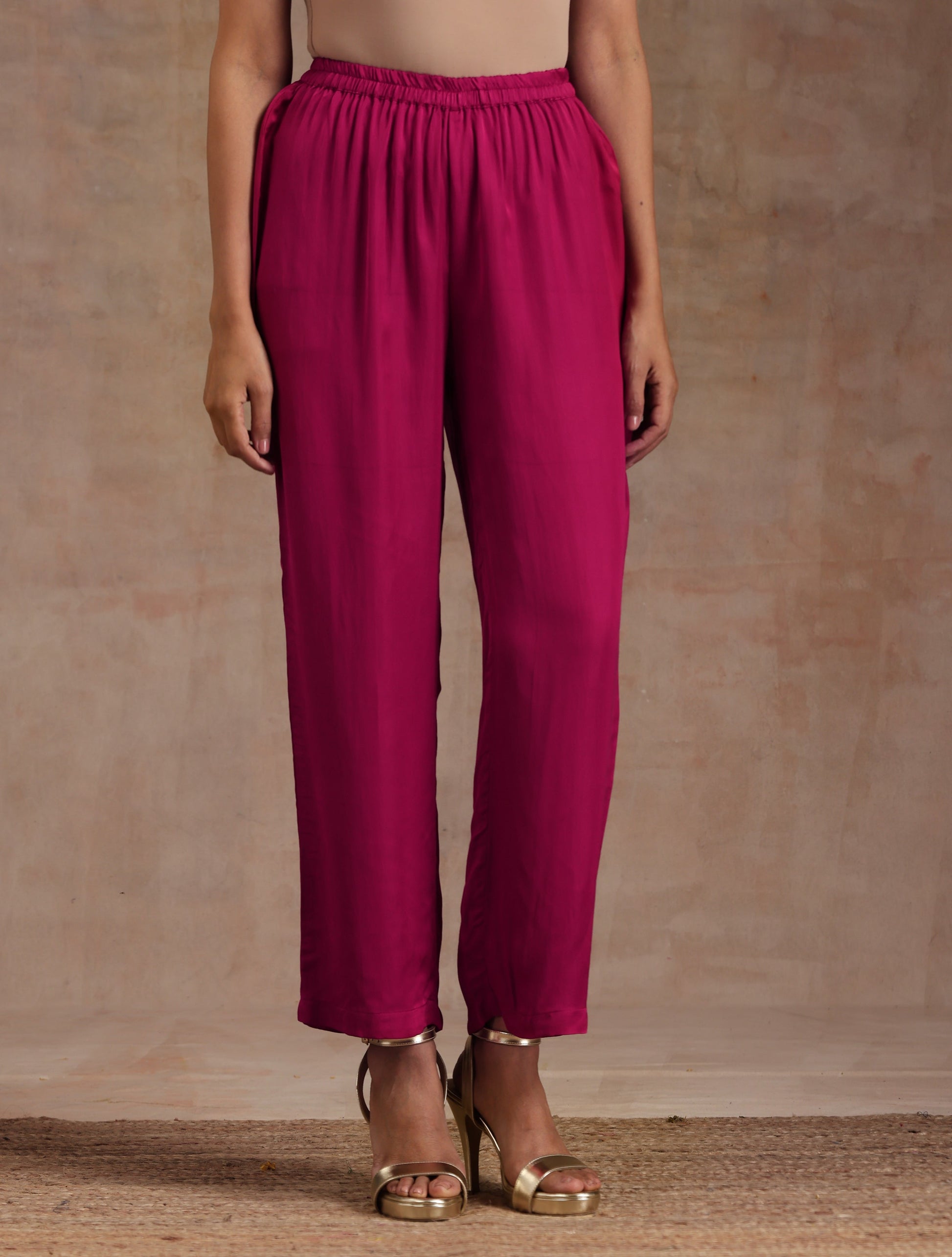 - Modal satin kurta with neck pleat detail. Paired with elasticated waist contrast pant. Style with pair of mules to complete the look.