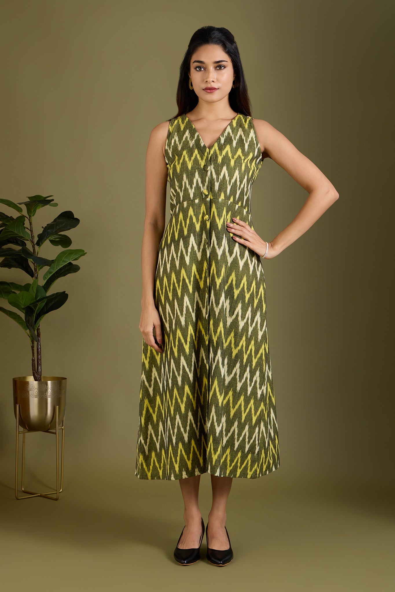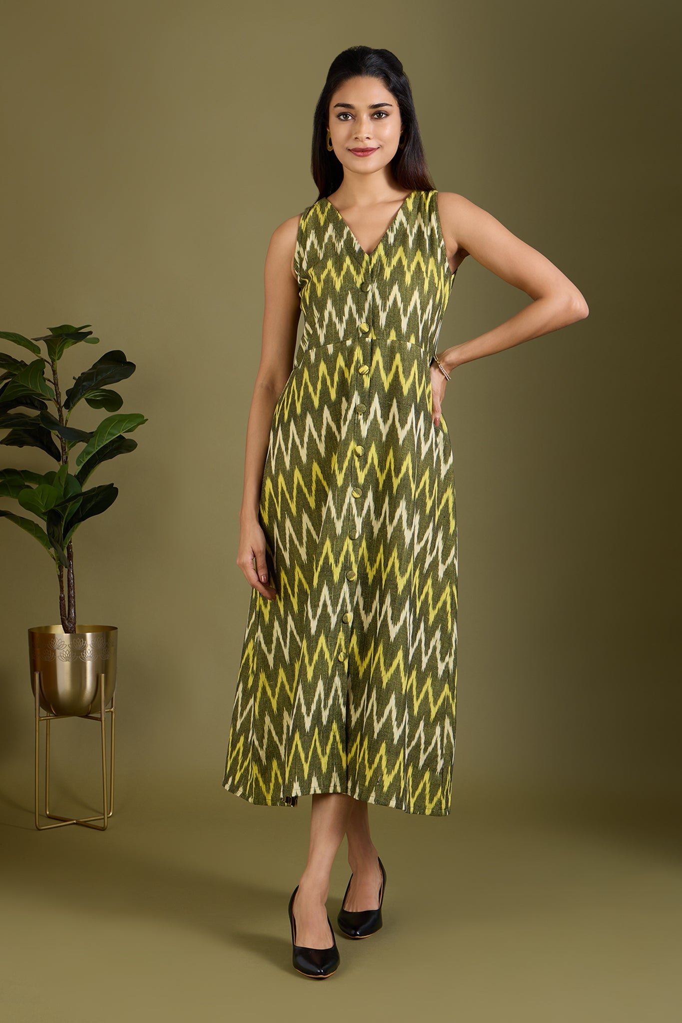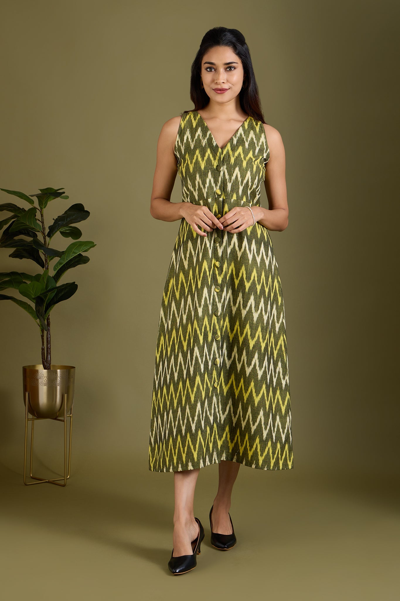 Maati Craft Earthy Zigzag Glow V-neck Button Down Dress