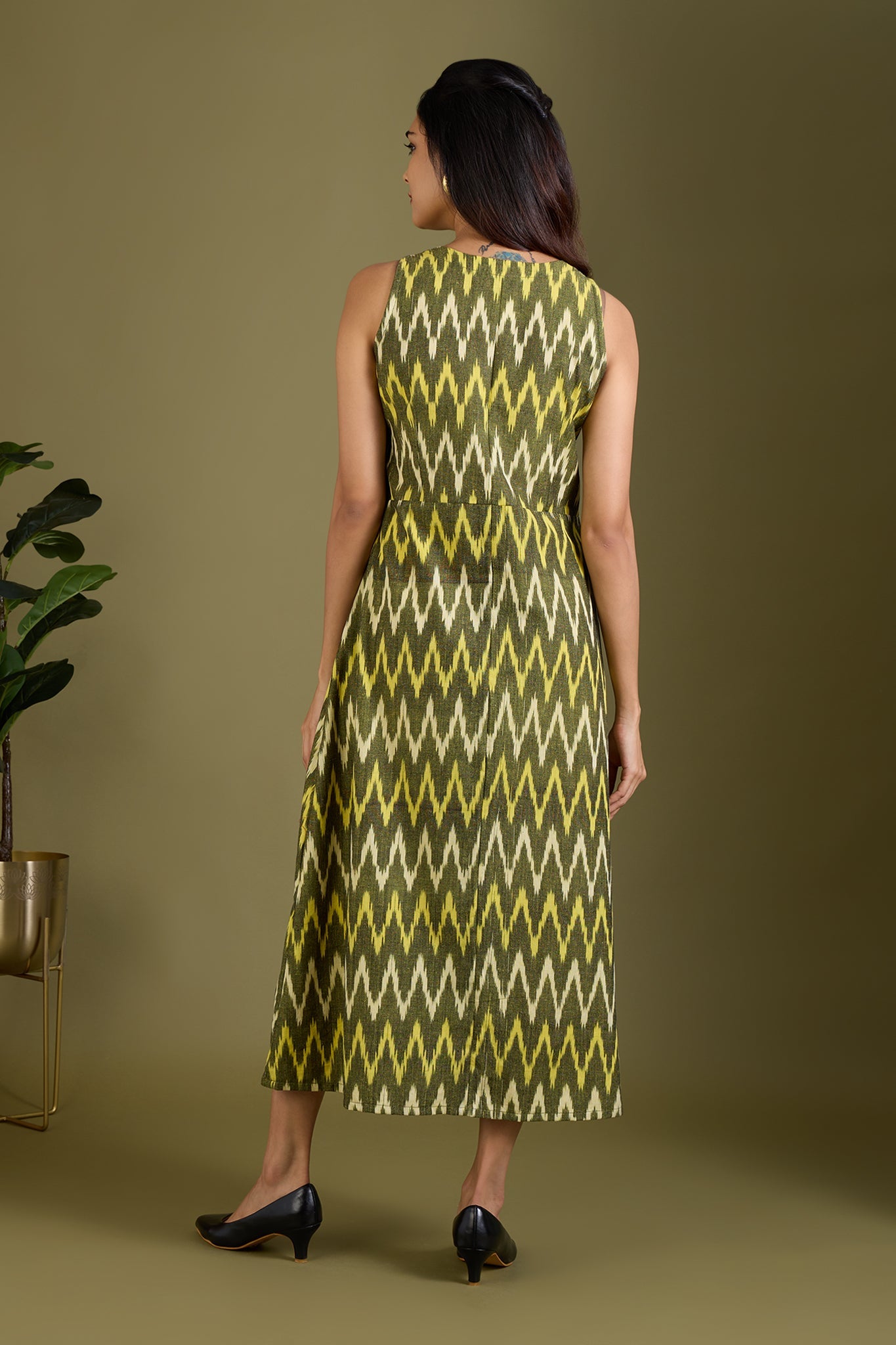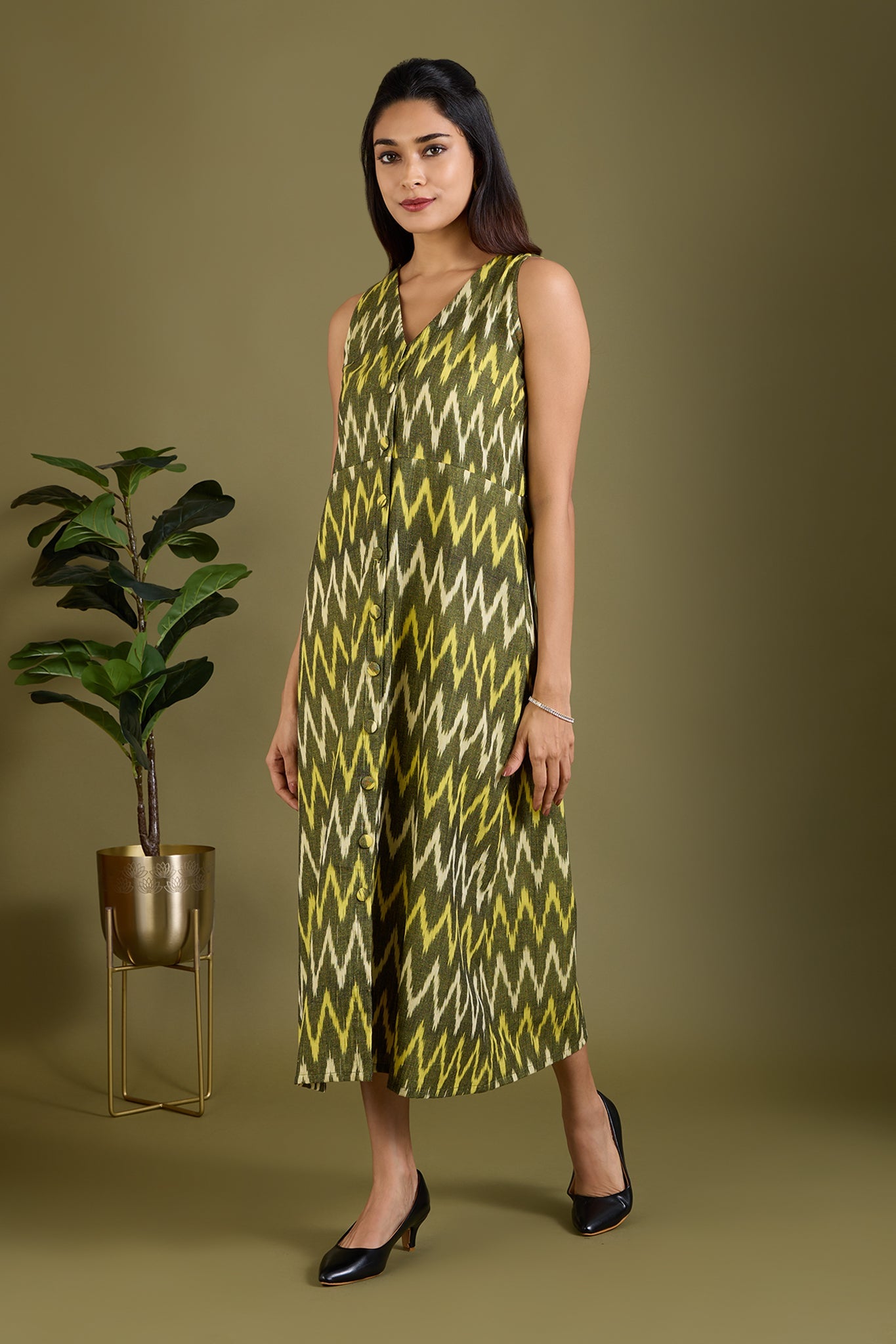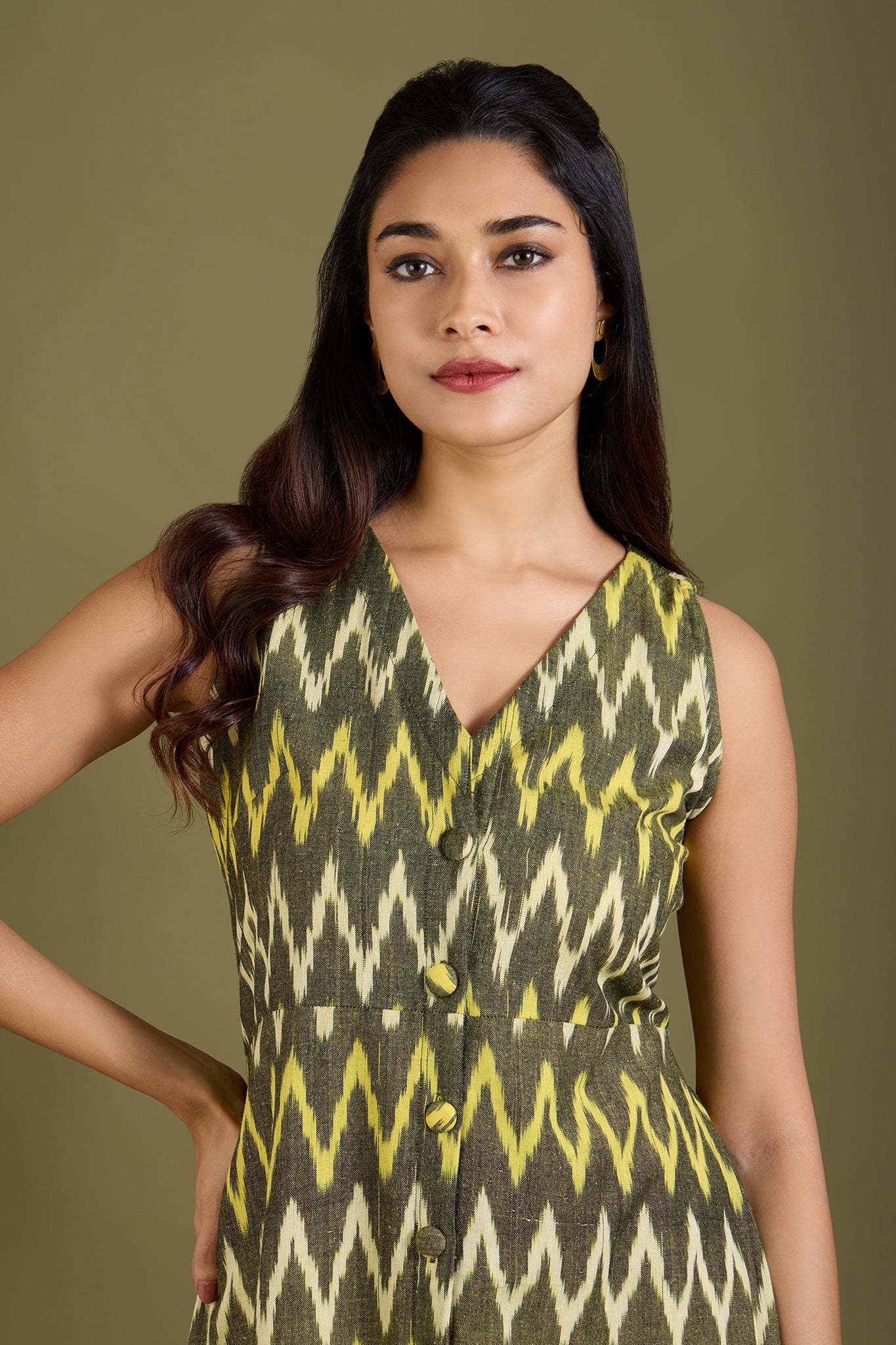 Maati Craft Earthy Zigzag Glow V-neck Button Down Dress