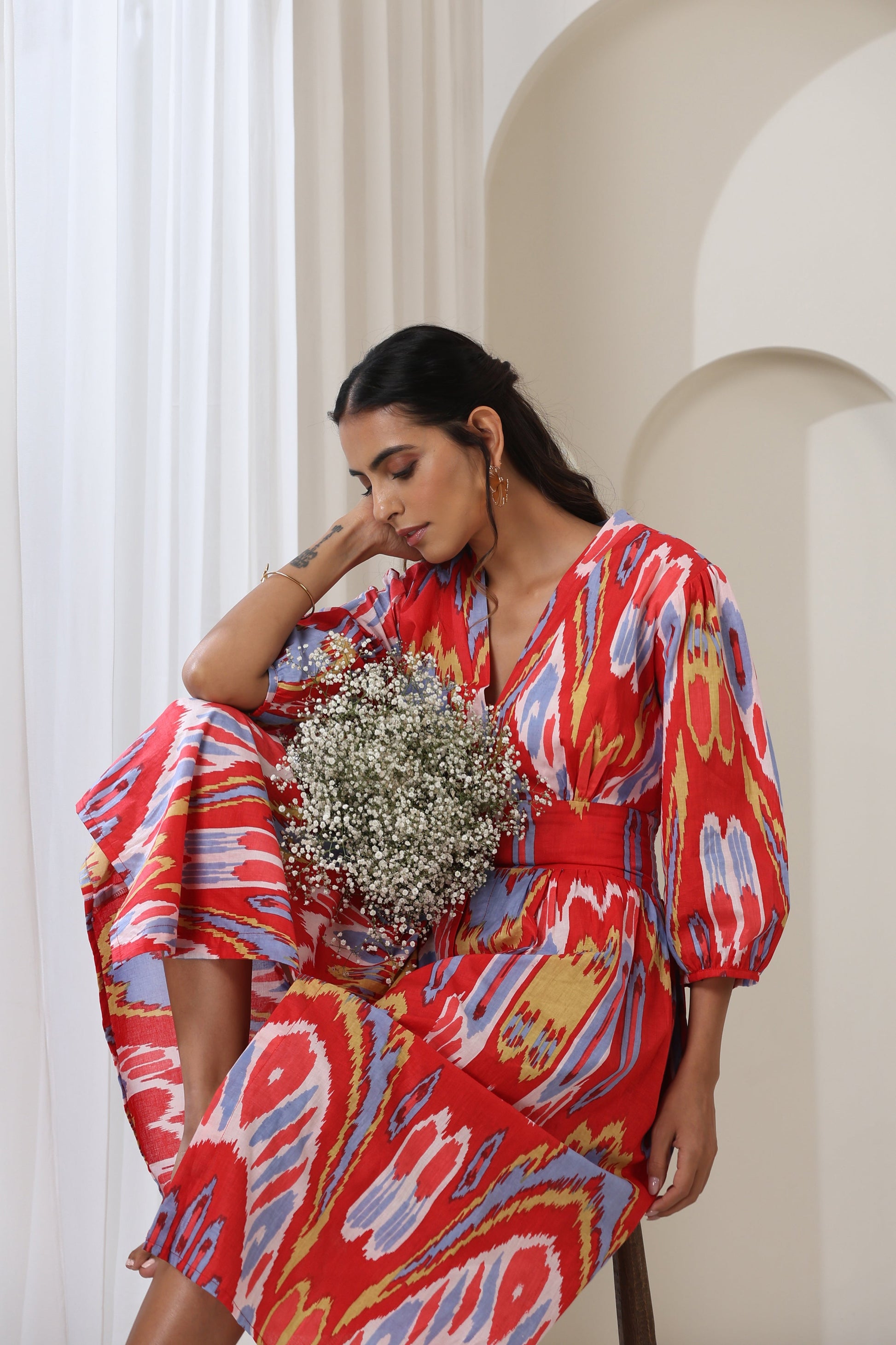 The Ella Red Midi Dress is handcrafted in the softest cotton and comes in the most figure flattering feminine silhouette. It has a midi length, balloon sleeves and pockets for comfort, while the smocking on the back helps with achieving a desirable fit. Cute floral pearl buttons on the waist add to the charm of the outfit. The dress is partially lined.