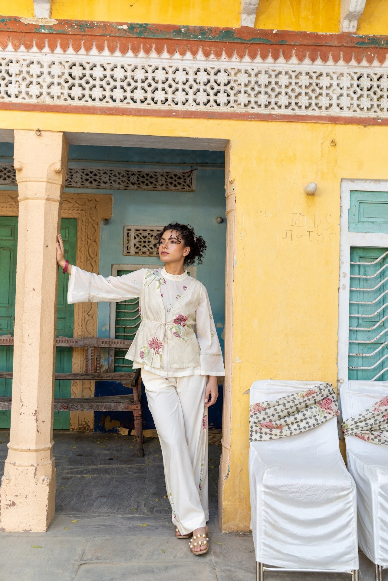 Soft bell sleeves and a round neck define the Elma set’s feminine Chanderi top, paired with easy cotton pants. Ivory tones and delicate print keep it modern yet celebratory. Finish with stacked bangles. Sleeves
