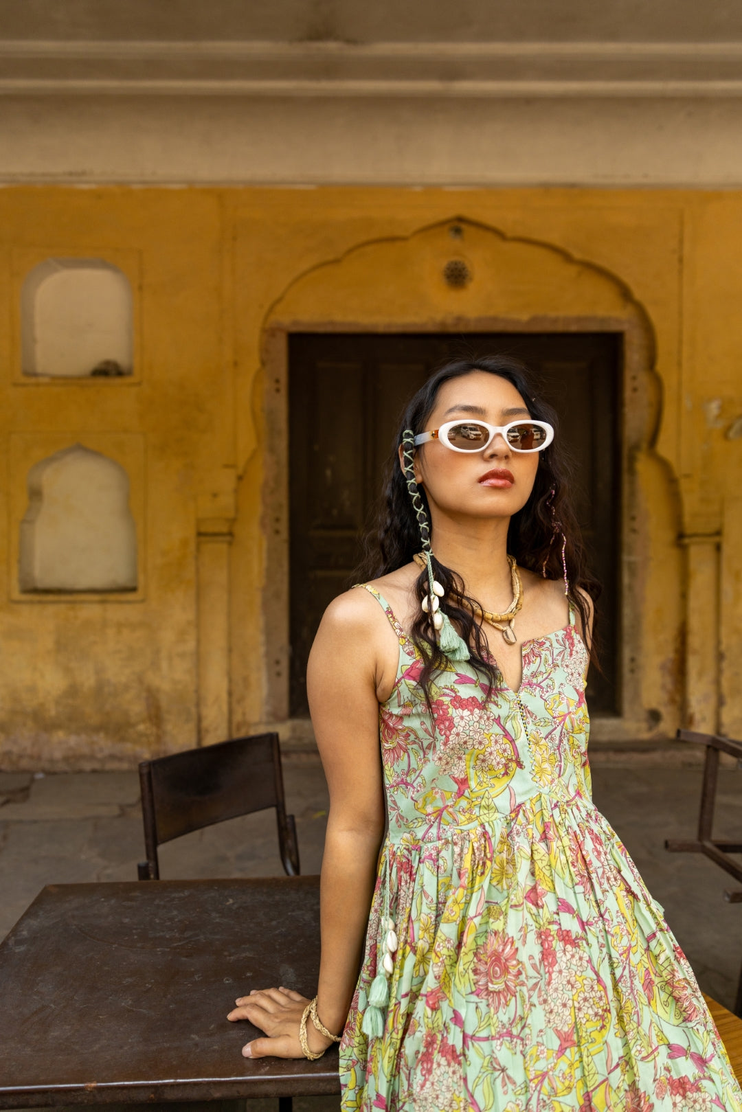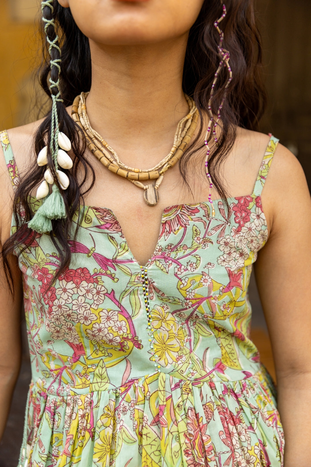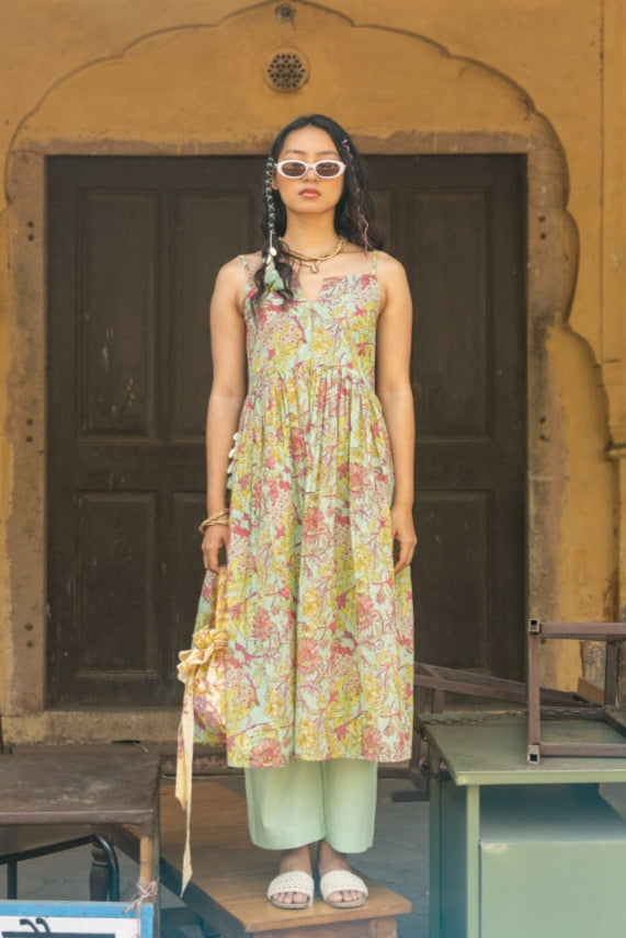 Effortlessly elegant and breezy, this strappy flowy kurta is crafted in a beautiful hand block printed fabric, exuding charm and grace. The blue turquoise hue adds a refreshing touch, while the intricate hand embroidery on the front and sideselevates its artisanal appeal.