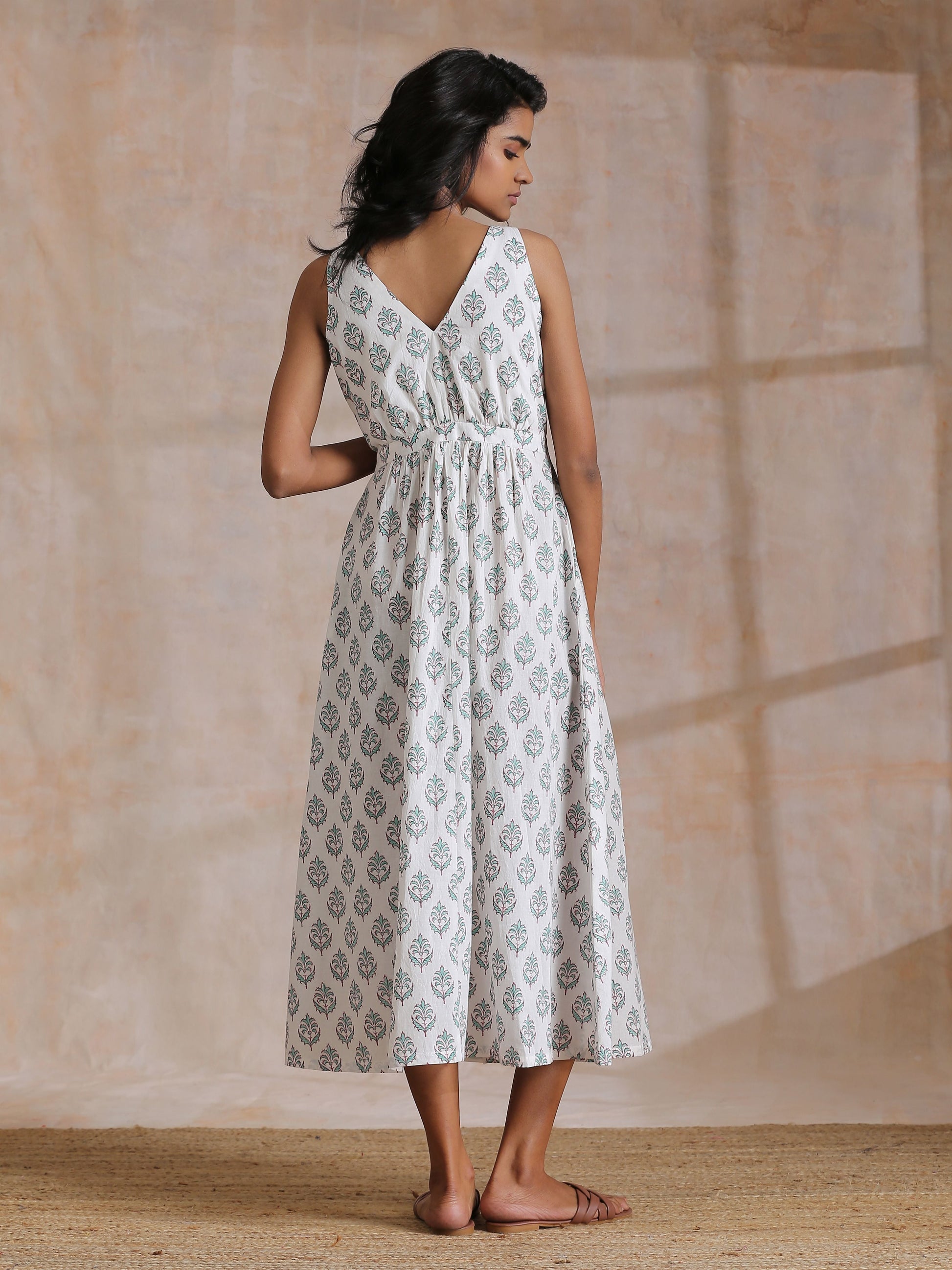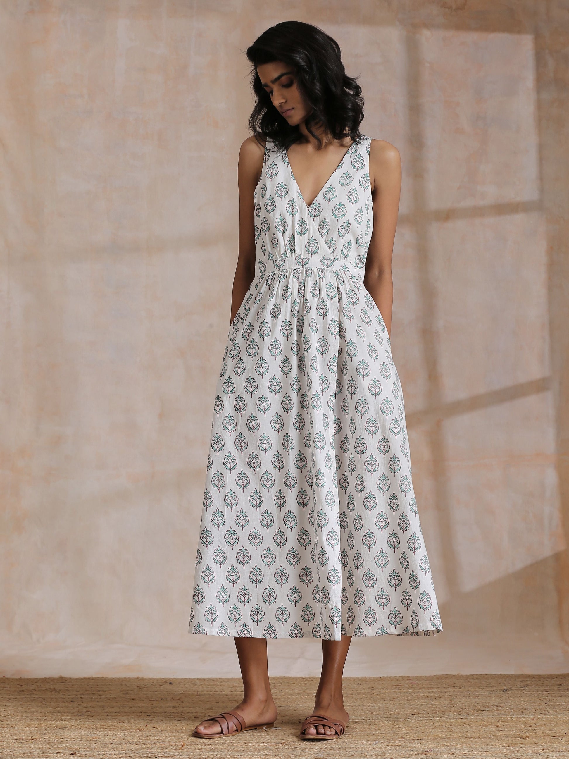 Green Buta On White Block Print Cotton Sleeveless Wrap Dress