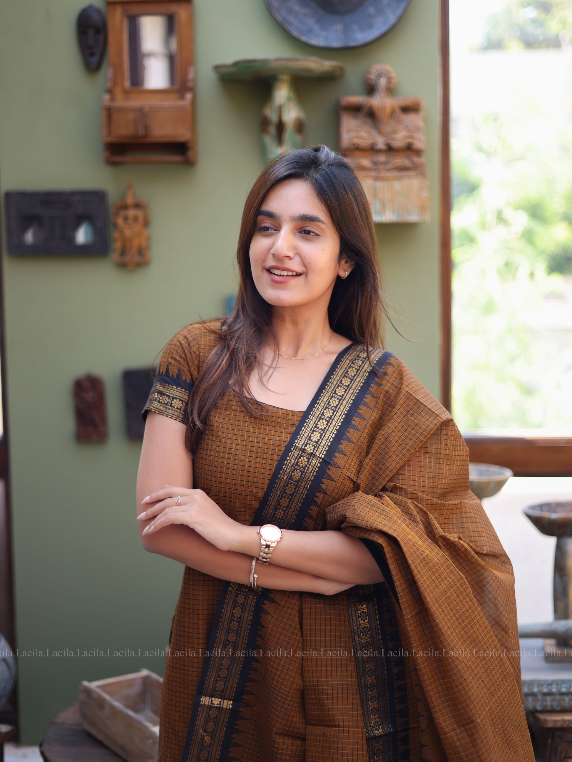 Studio Brown Checked & Black Border Kanchi Cotton Top & Dupatta