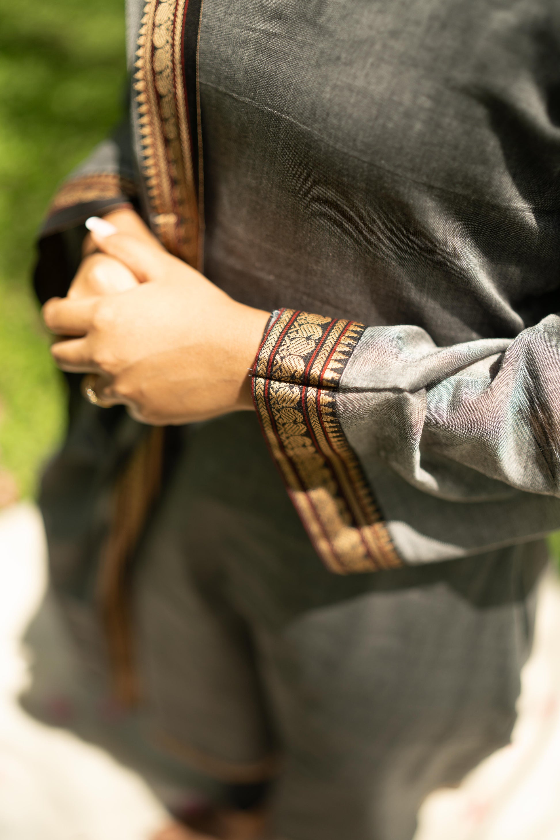 Crafted from authentic Narayanpet cotton, these grey Malar pants offer breathable comfort and durability. With a traditional weave known for its strength and subtle texture, they provide an elegant yet practical option for everyday wear. Designed exclusively as bottoms, they pair effortlessly with various tops for a versatile wardrobe addition. Perfect for those seeking quality craftsmanship combined with classic style.