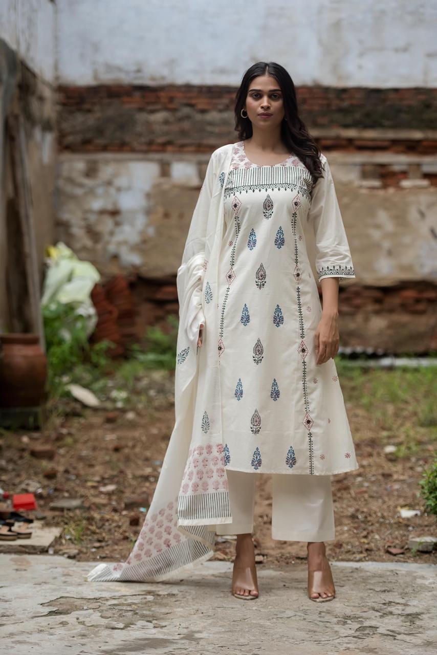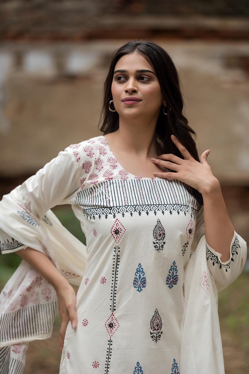 Hand Block -3 PC Set - Fabric Cotton - Hand Block Print Kurta and Dupatta - Cotton Lining in Kurta - Dry Clean Only