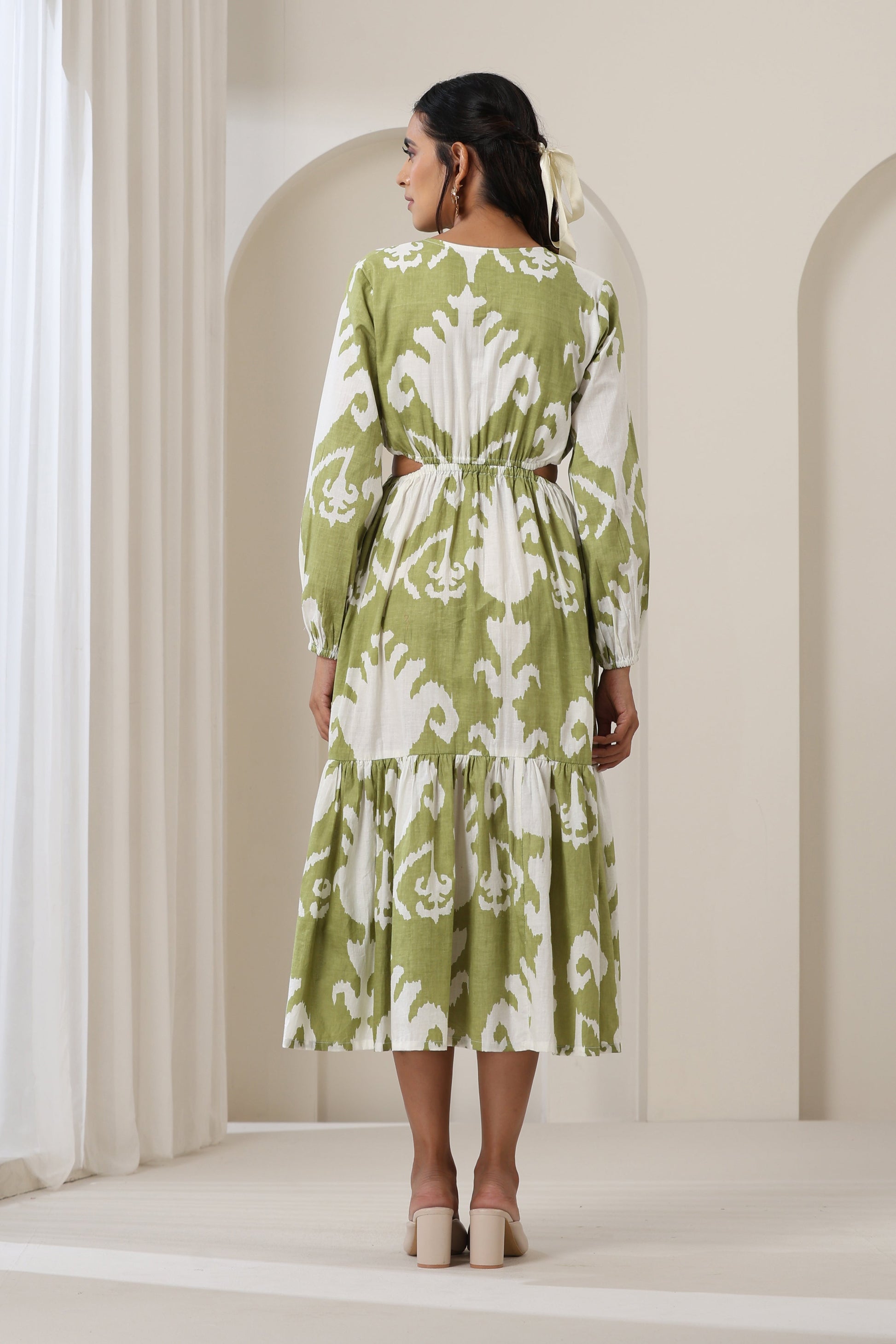 The Hannah Green Midi Dress is handcrafted in the softest cotton and comes in a tiered silhouette with an elasticated waist. The balloon sleeves and cutouts on the waist add a touch of femineity to the look. Team it with nude sandals and statement earrings to complete the look. The dress is partially lined.