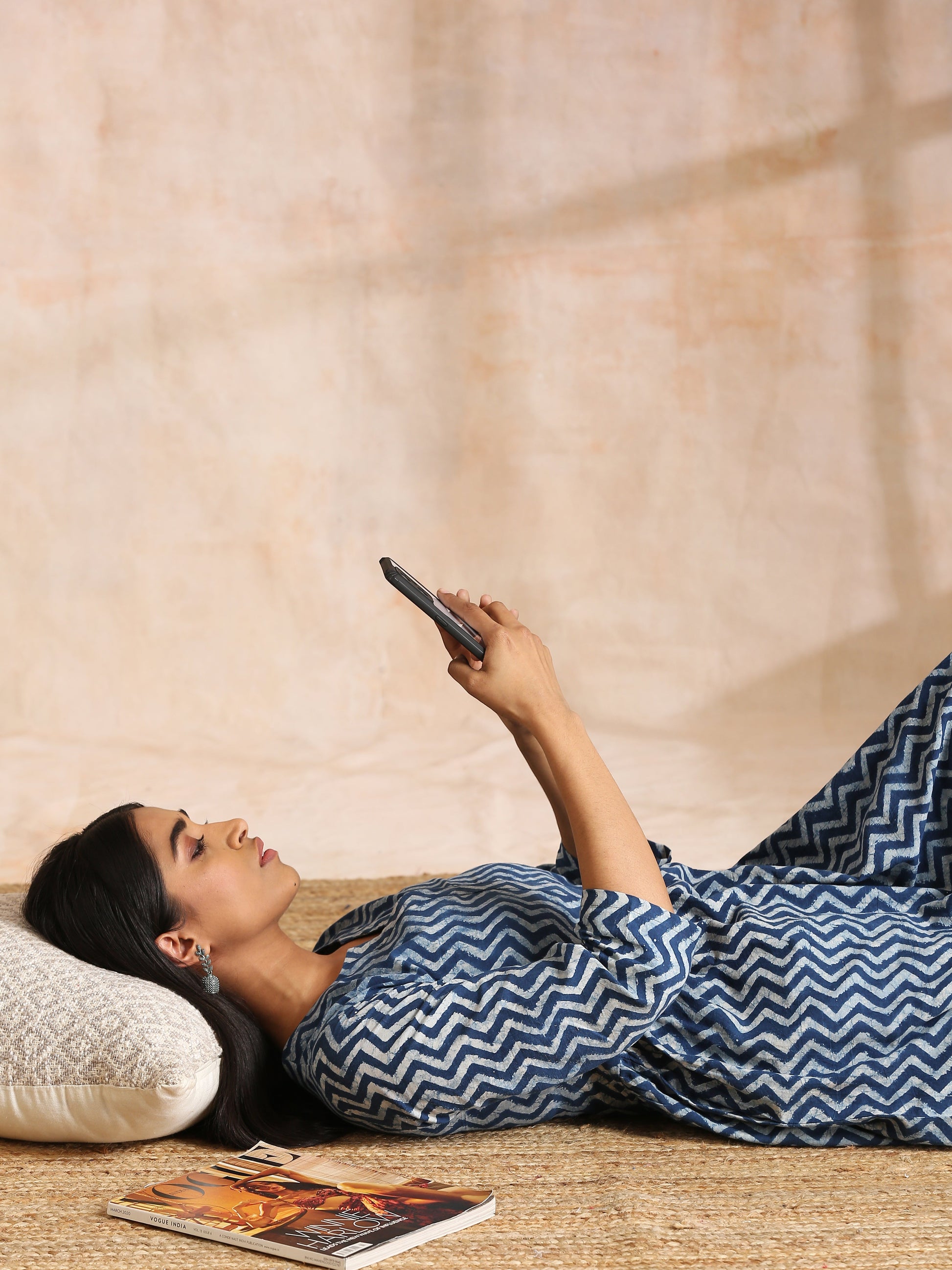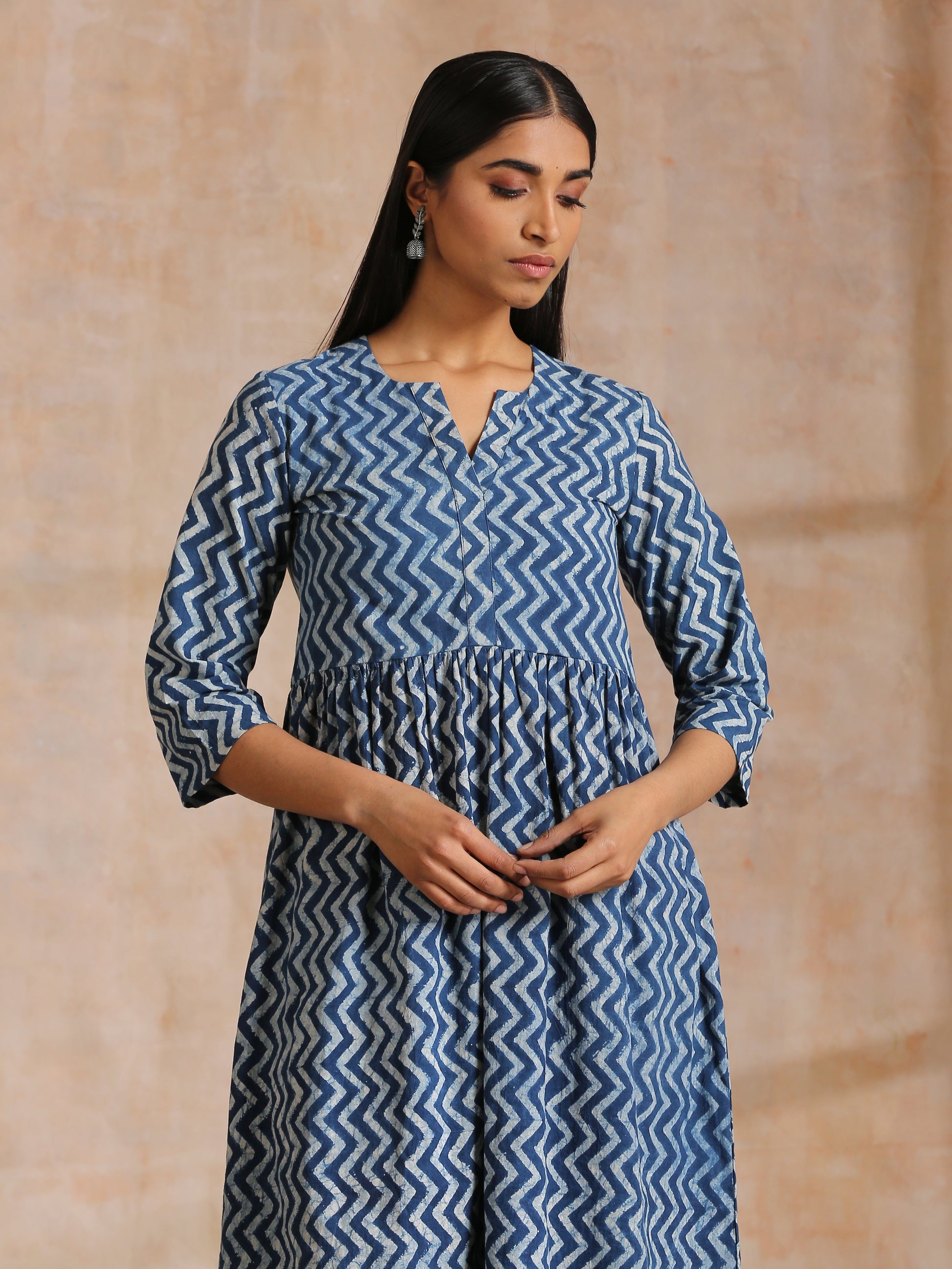 Indigo Dabu Zig-Zag Lines Print Cotton Flared Kurta Pant Set