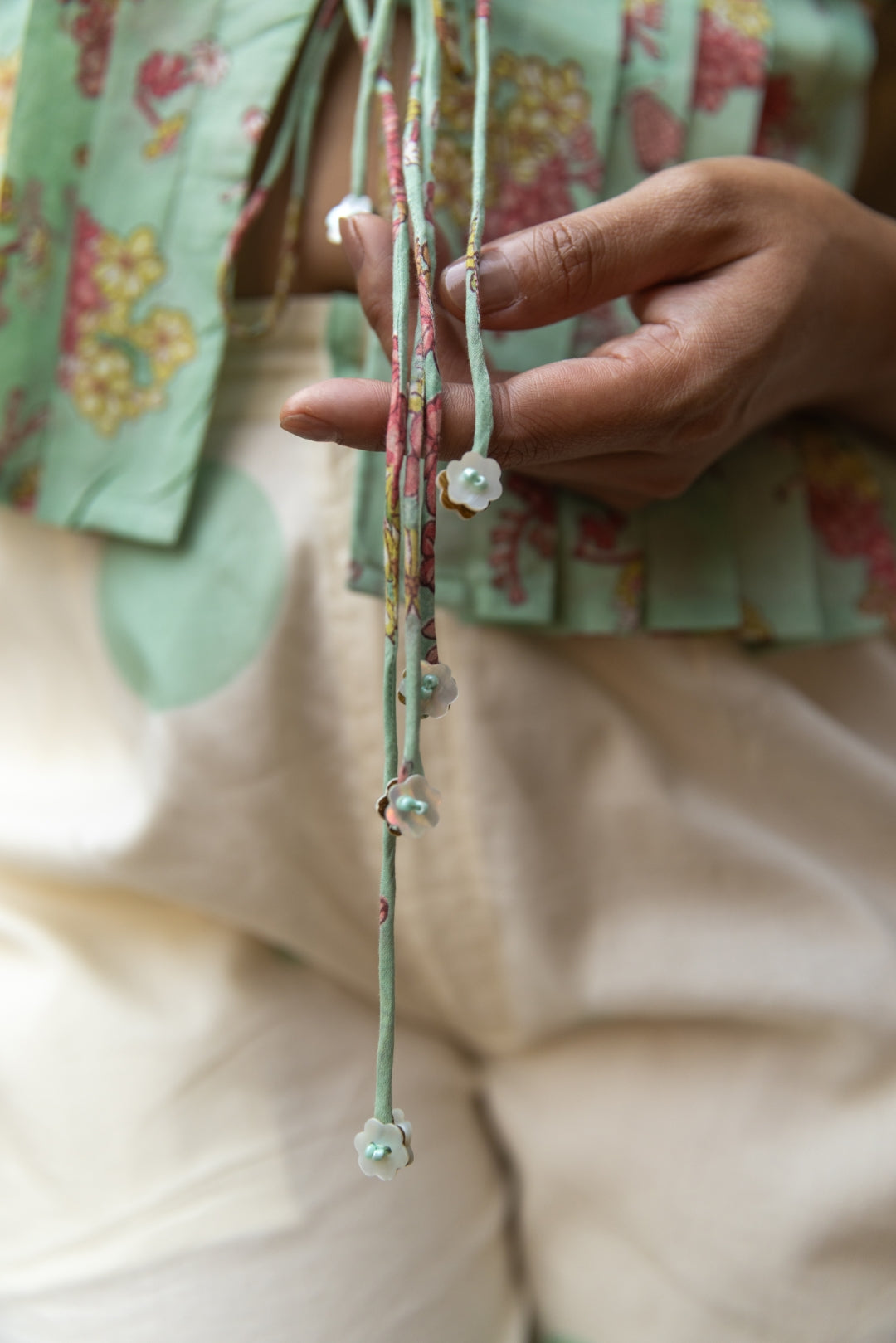 Playful yet effortlessly chic, this top is a statement in style and comfort. The front tie-up top adds a flirty touch. Paired with polka dot pants, the contrast of prints and textures creates a fun, eye-catching ensemble.