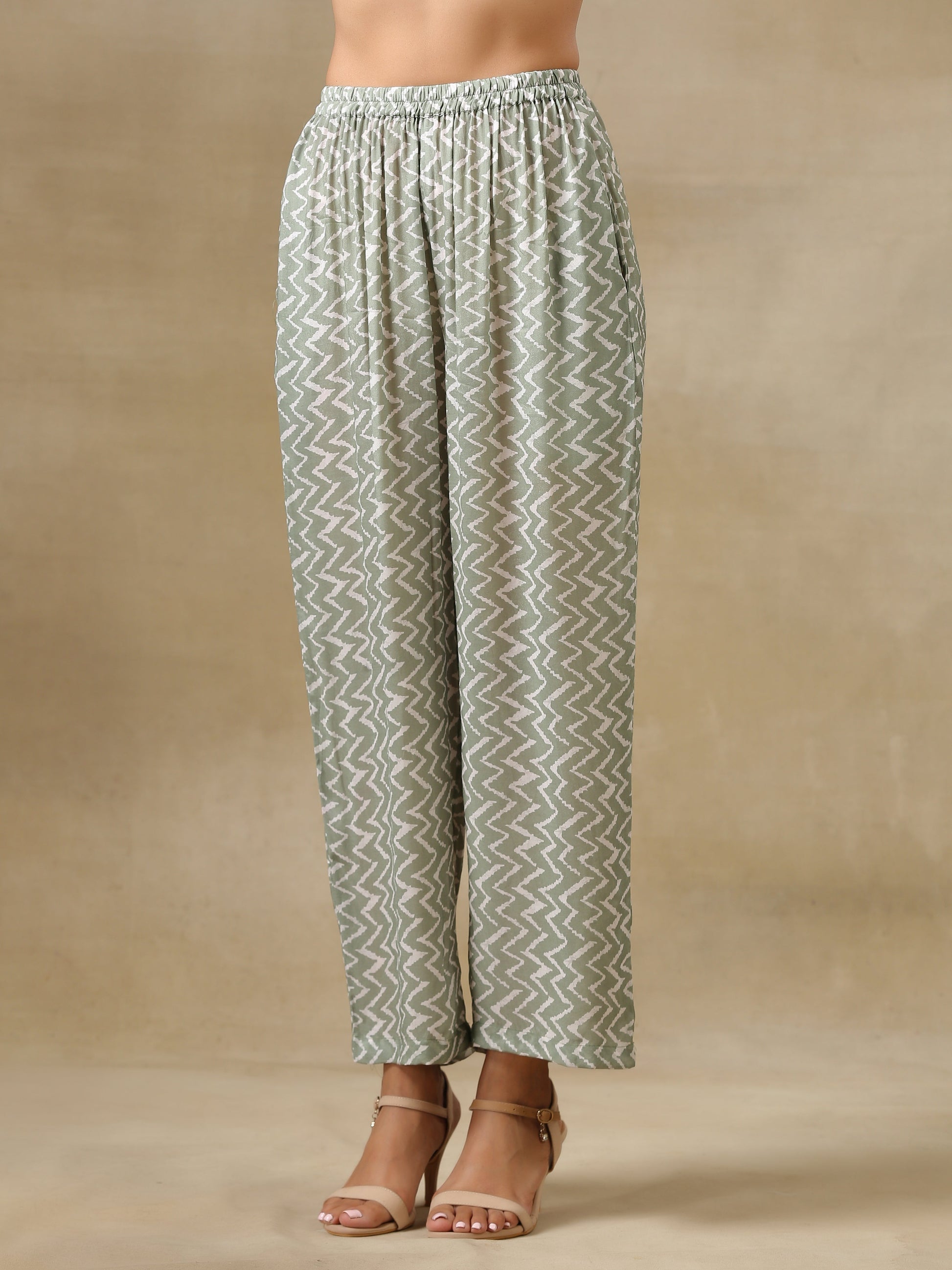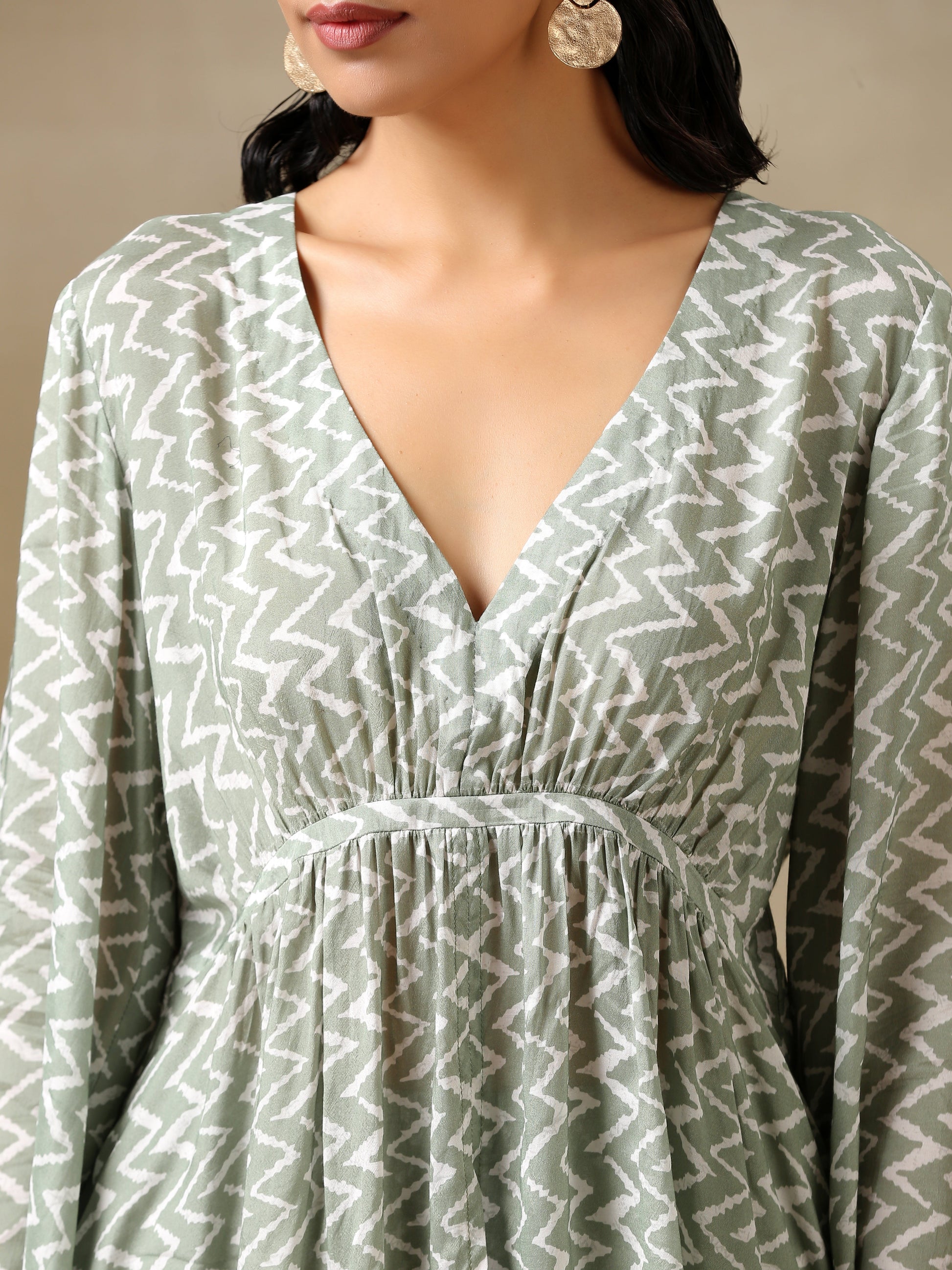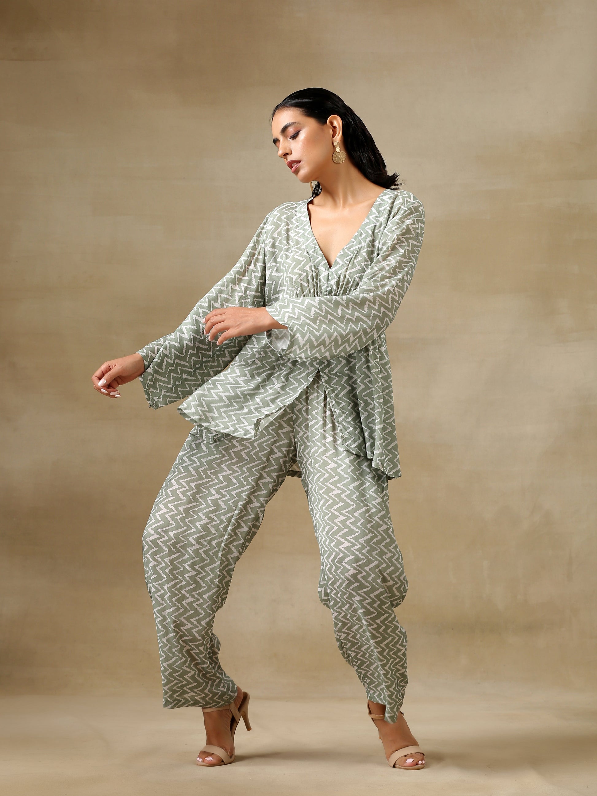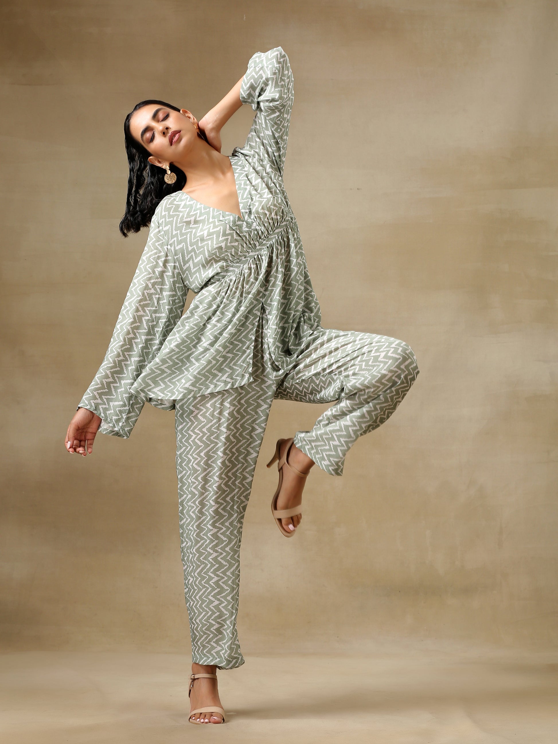 - Light green zig- zag printed deep V-neck co-ord set with front slit and gathers around the waist.