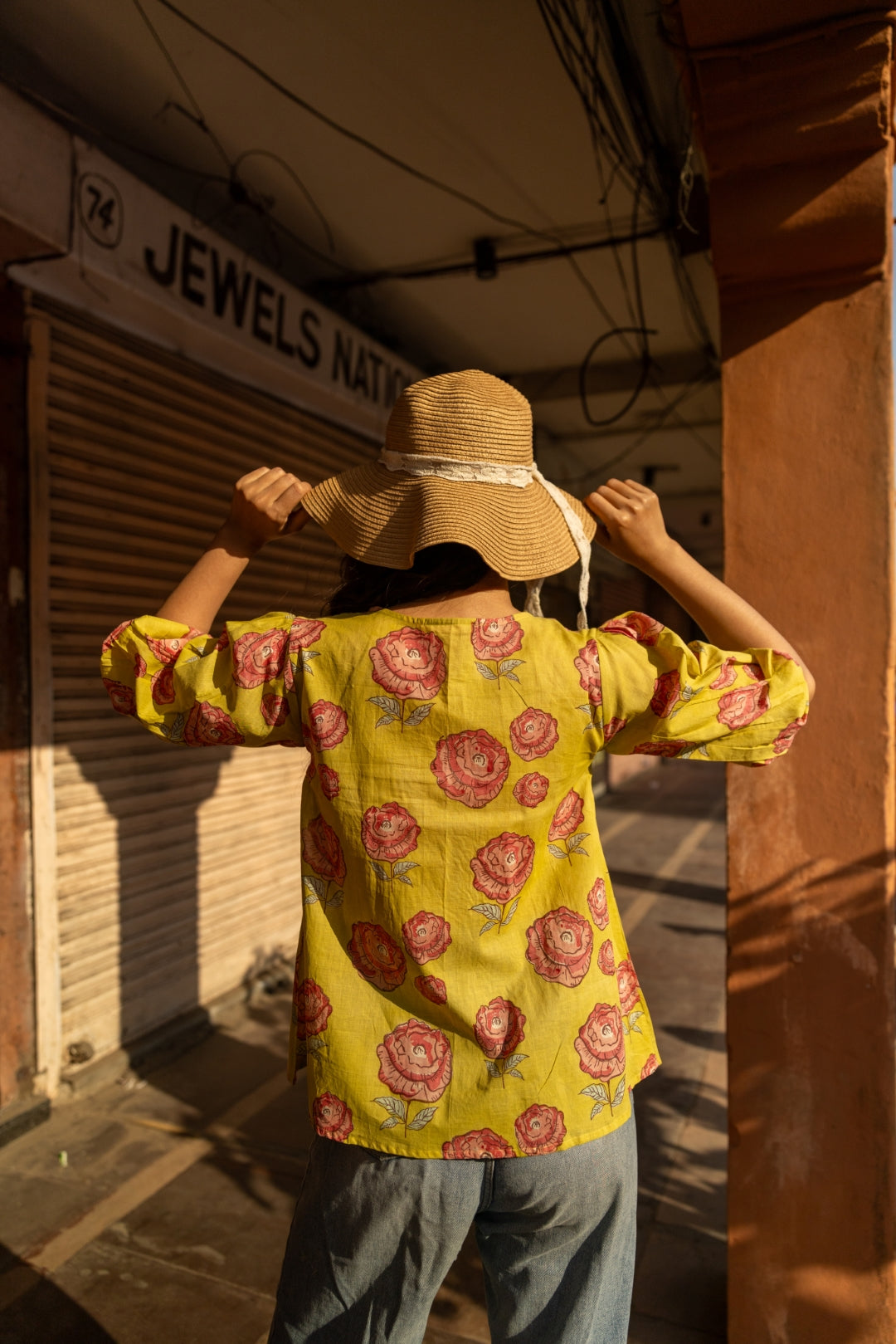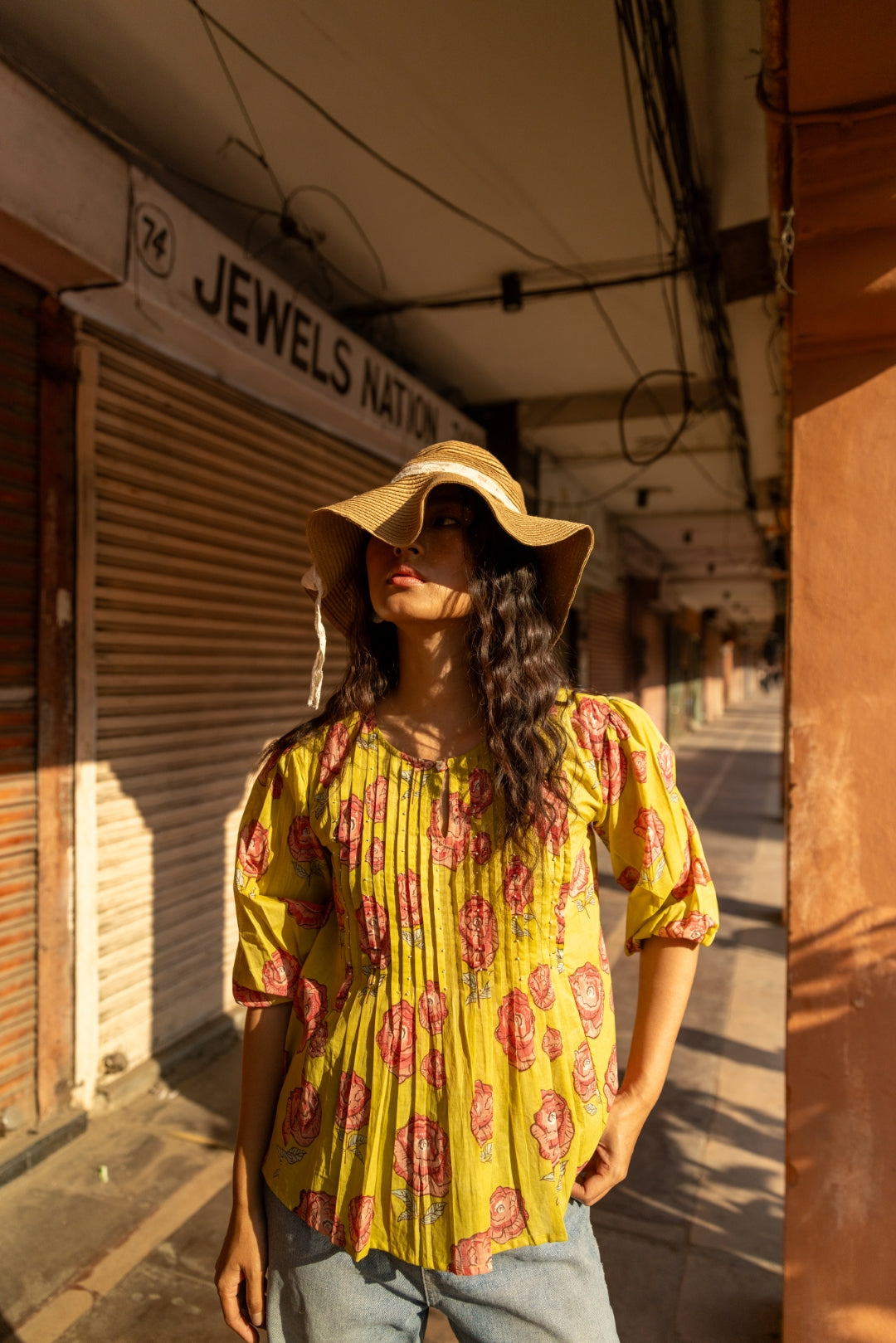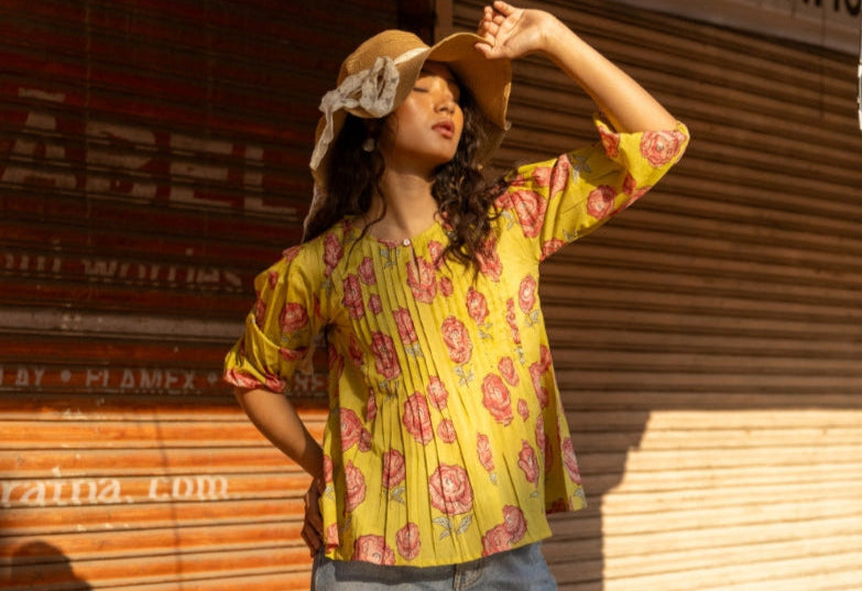 Effortlessly elegant and easy to wear, this green hand-block printed top is a perfect blend of tradition and modern comfort. Delicate pleats on the front add subtle texture and structure, while the relaxed fit ensures all-day ease. Designed with 3/4th sleeves for a timeless appeal, this top is versatile enough to be styled for both casual and refined looks. A breezy staple that celebrates artisanal craftsmanship with effortless charm.