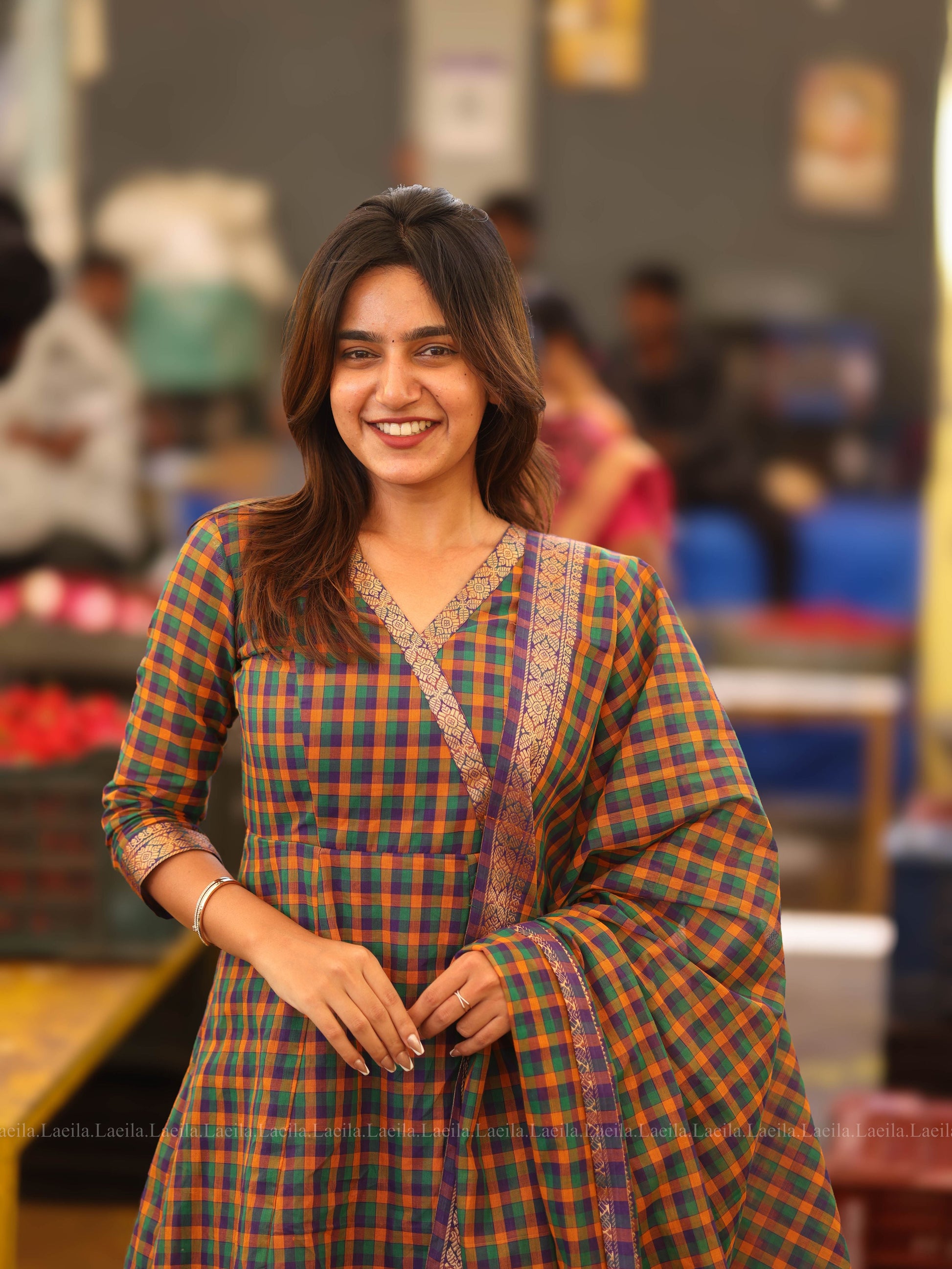 This Madras Checks Anarkali Two Piece Set features a classic checked pattern in a comfortable, breathable fabric. The Anarkali silhouette offers a flattering fit and elegant drape, making it suitable for both casual and semi-formal occasions. Paired with a complementary bottom, this set delivers timeless style with practical comfort.