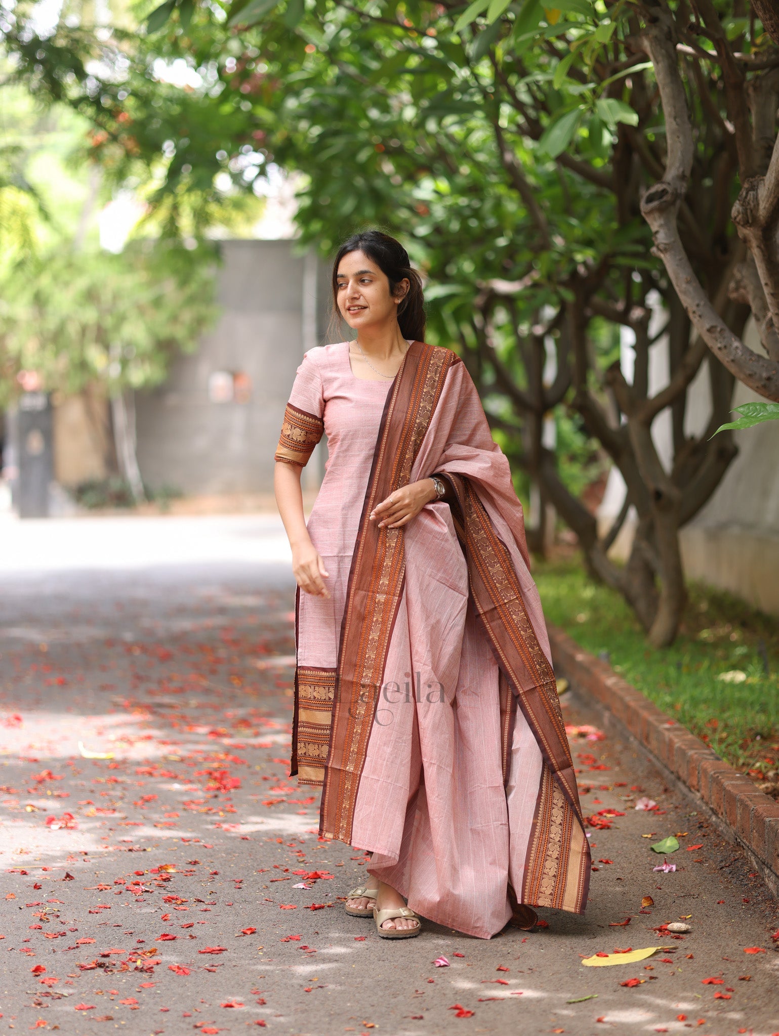 Expertly crafted with pure kanchi cotton, the Pink Meenakshi set features a stunning pink and maroon border design on the top and duppata. Experience the softness and elegance of kanchi cotton while making a statement with this timeless set.