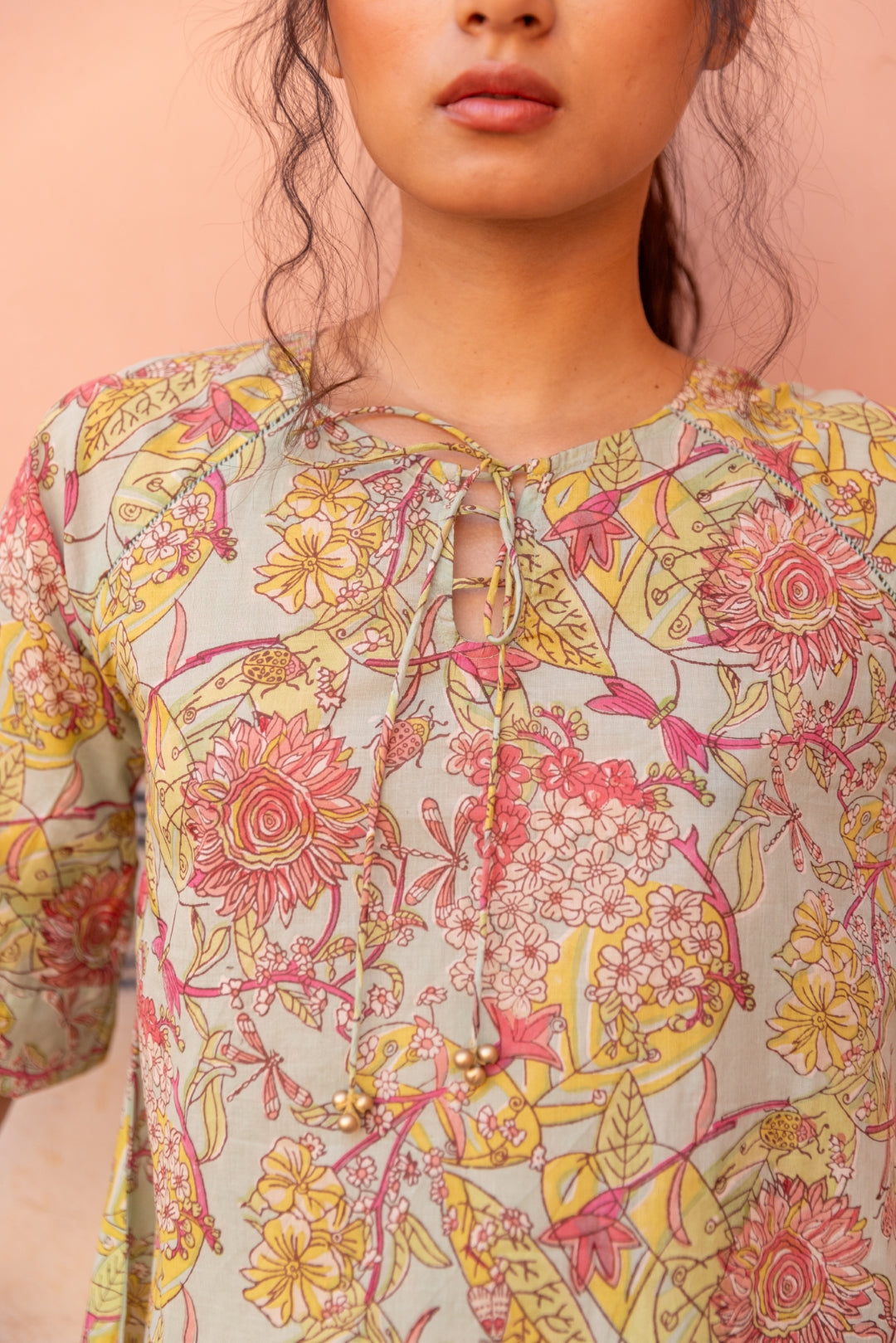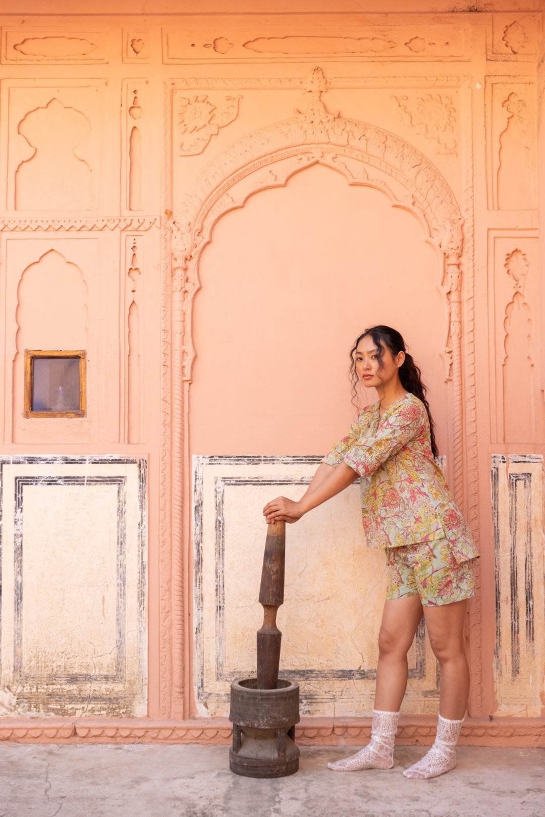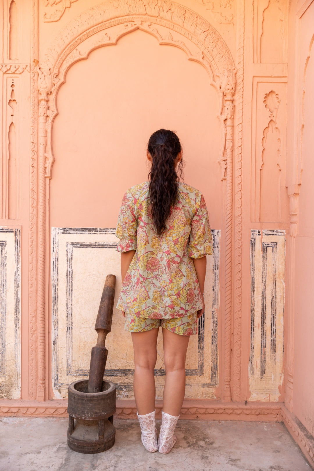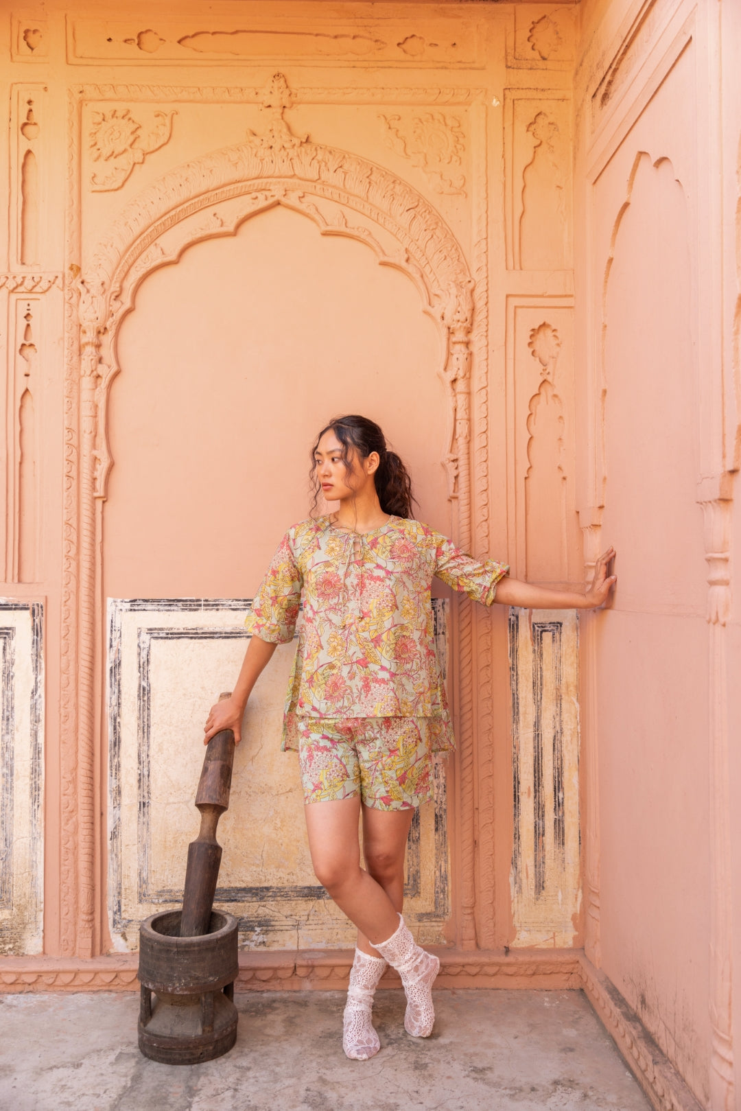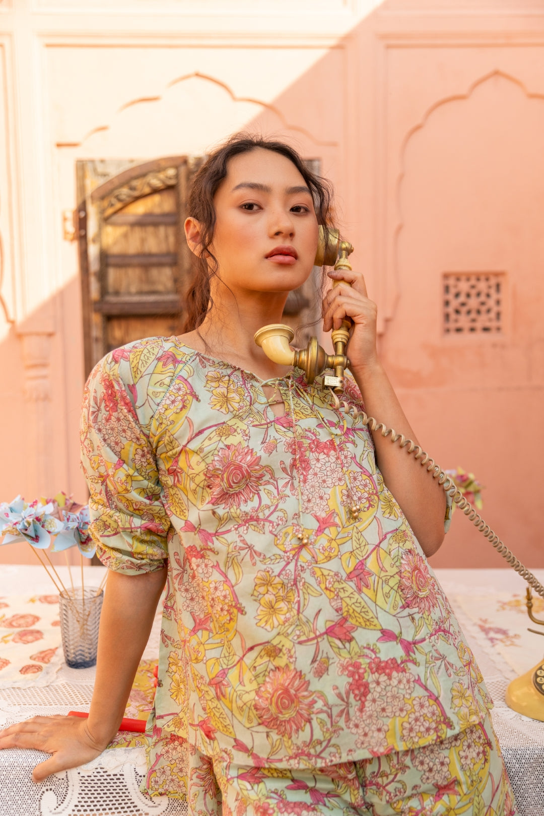 Playful yet effortlessly chic, this printed co-ord set is designed for a statement look. The oversized high-low top features dramatic puff sleeves and a neck tie-up detail, adding a touch of elegance to its breezy silhouette. Paired with matching printed shorts, this set offers both comfort and style, making it perfect for vacations, brunches, or casual outings. Style it with minimal accessories and strappy sandals for a bold yet relaxed vibe.