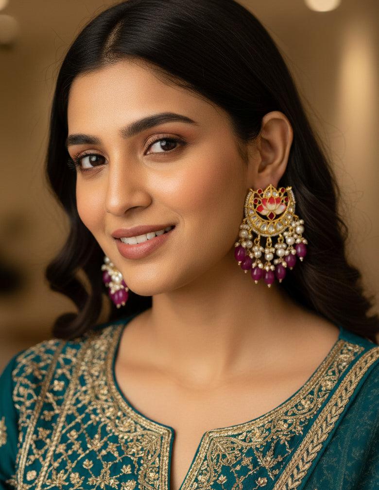 Crafted to celebrate the iconic crescent moon silhouette, Moon Chandbali Earrings feature a gracefully curved base that mimics the elegant arc of the moon. Dangling elements — including delicate beads, glistening stones, or pearlescent accents — sway gently with movement, adding dynamic charm and eye-catching sparkle to every step you take. Iconic Crescent Moon Shape: Symbolic and timeless — reflects elegance rooted in cultural heritage.