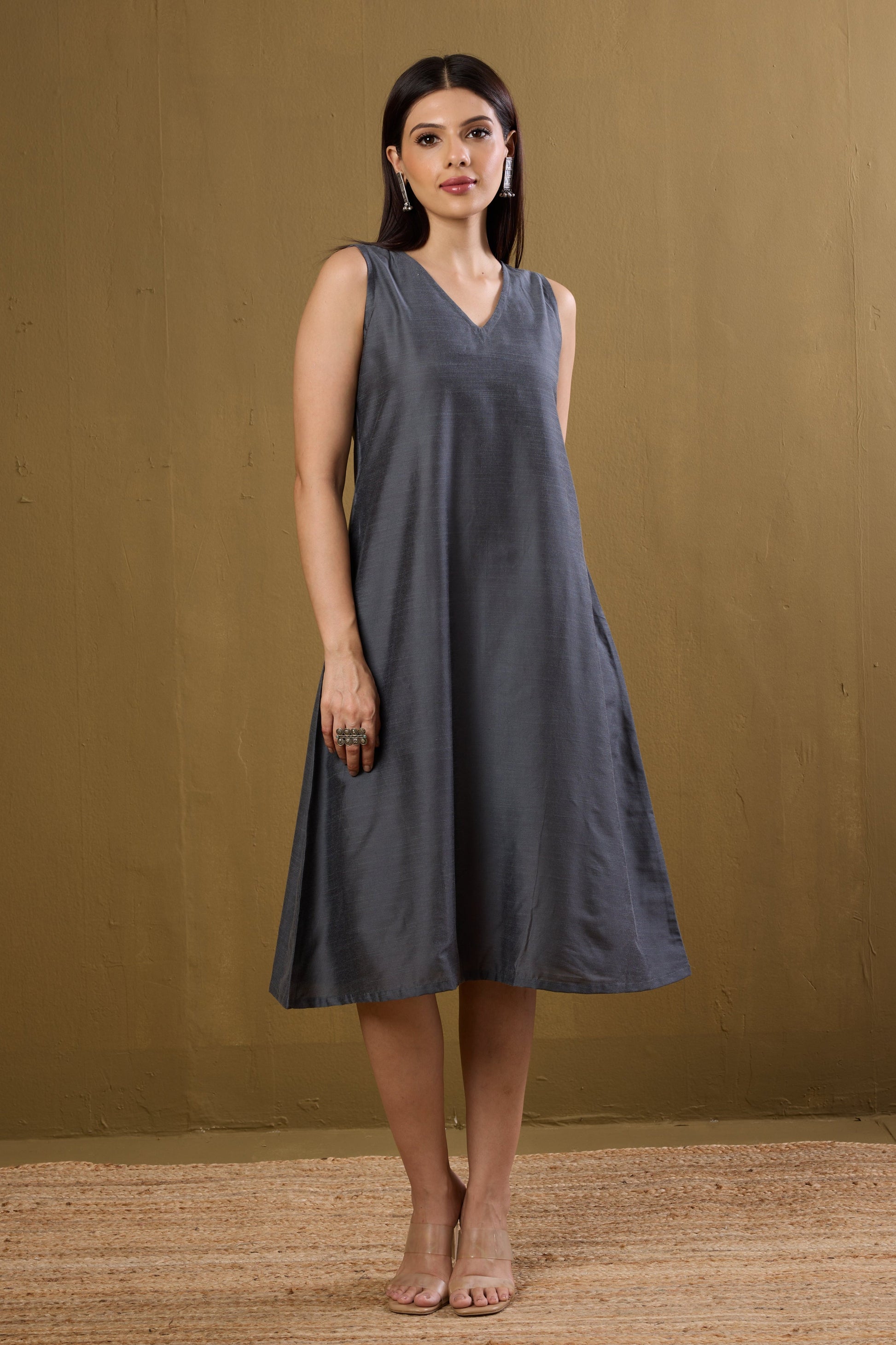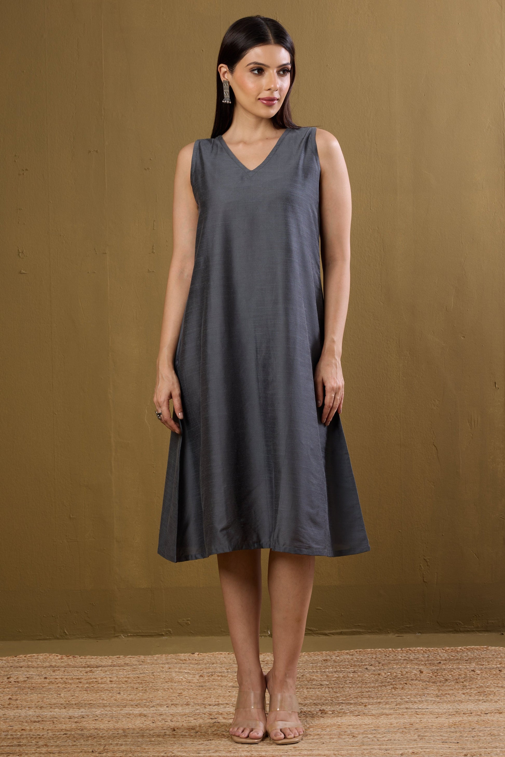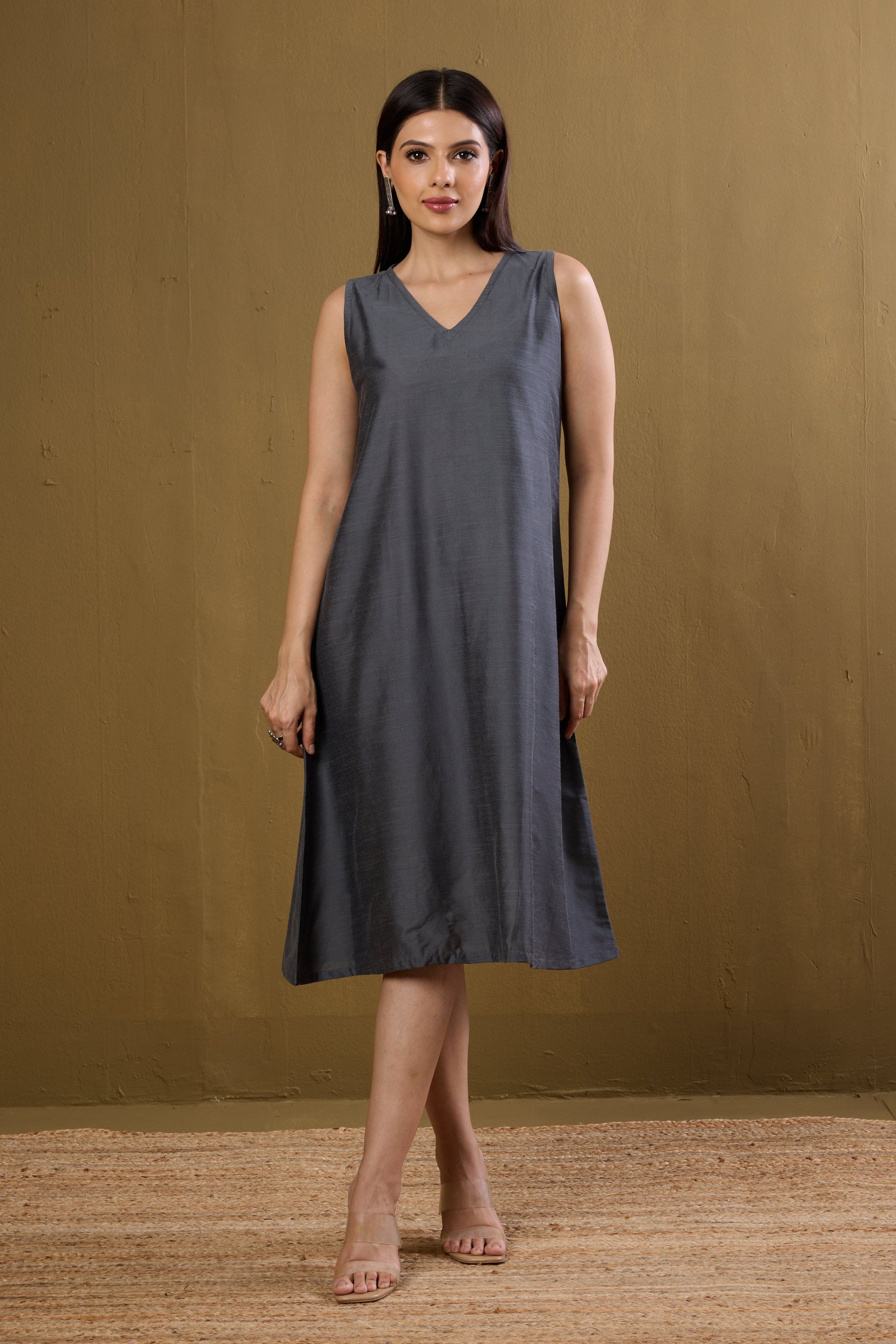 Maati Craft Gulabi Moonlit Grey Silk Slub Sleeveless V-Neck Dress