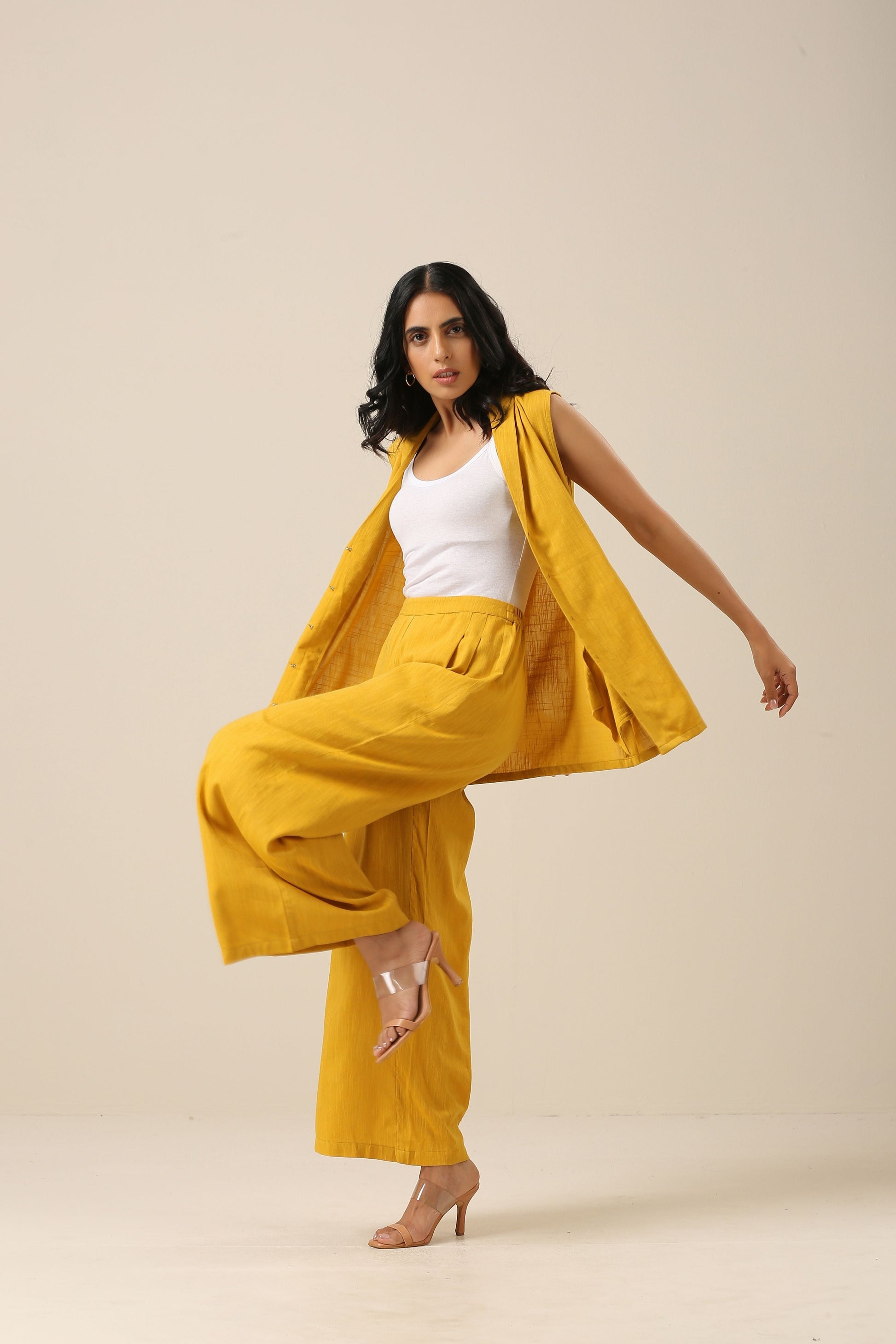 Mustard Yellow Slub Texture Sleevesless Jacket Pant Set