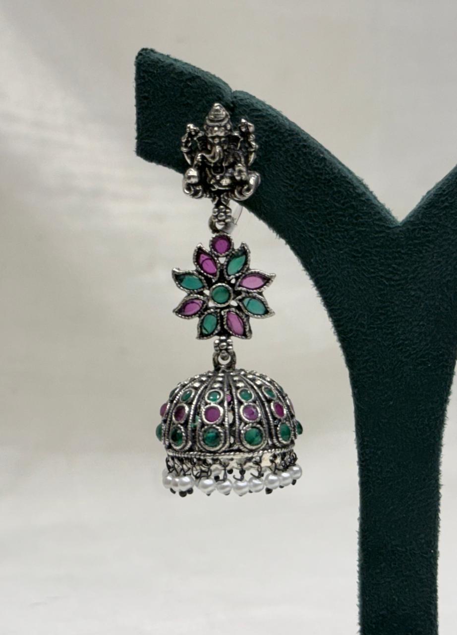 Add a touch of timeless elegance to your look with these beautifully crafted oxidized silver jhumka earrings. Featuring a detailed floral stud adorned with vibrant turquoise and pink stones, these earrings flow into a classic dome-shaped jhumka embellished with intricate metalwork and delicate bead accents. Perfect for festive occasions, weddings, and traditional celebrations, these statement earrings effortlessly complement ethnic outfits like sarees, lehengas, and salwar suits. Lightweight yet eye-catching, they bring together heritage design and contemporary charm for a truly graceful finish.