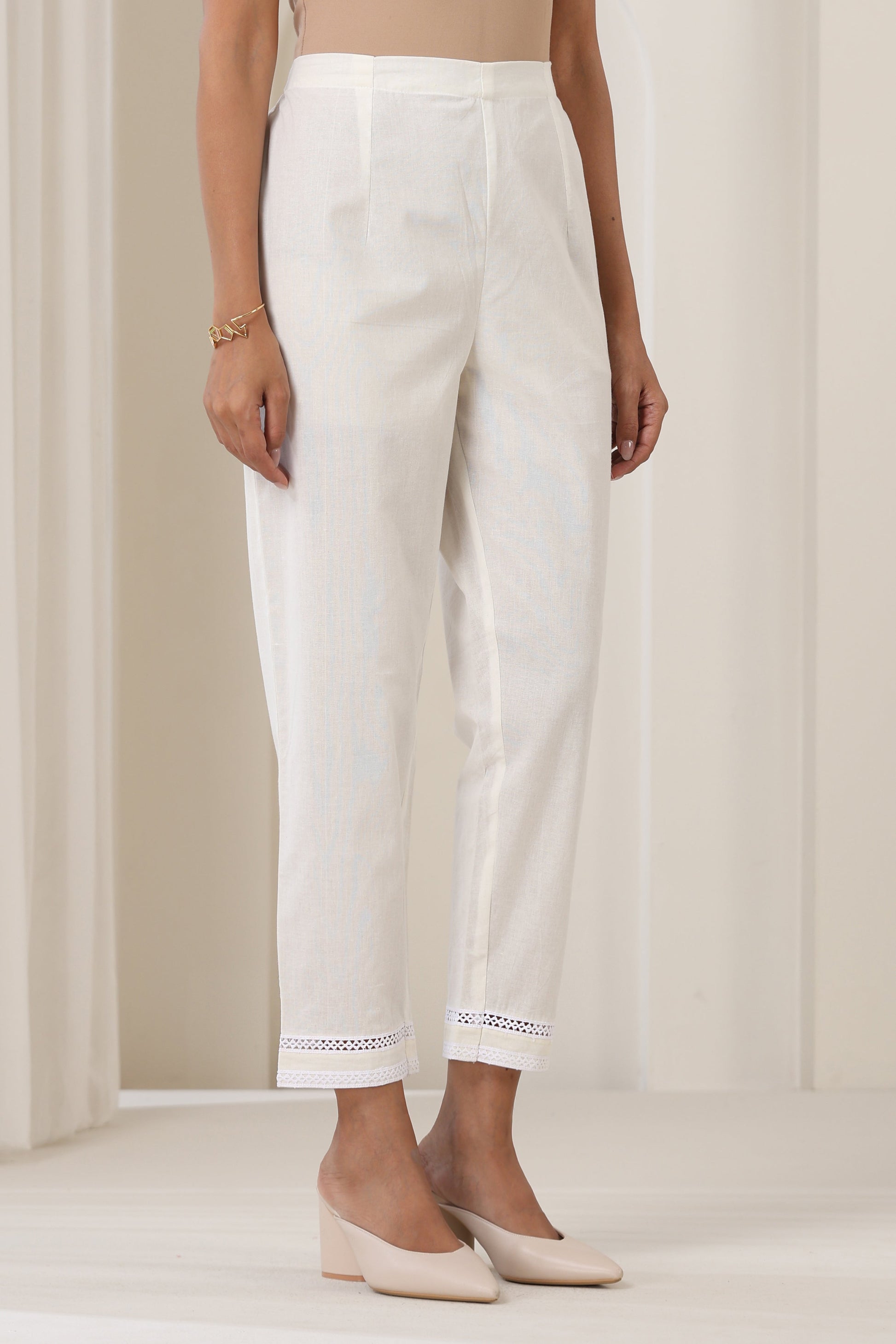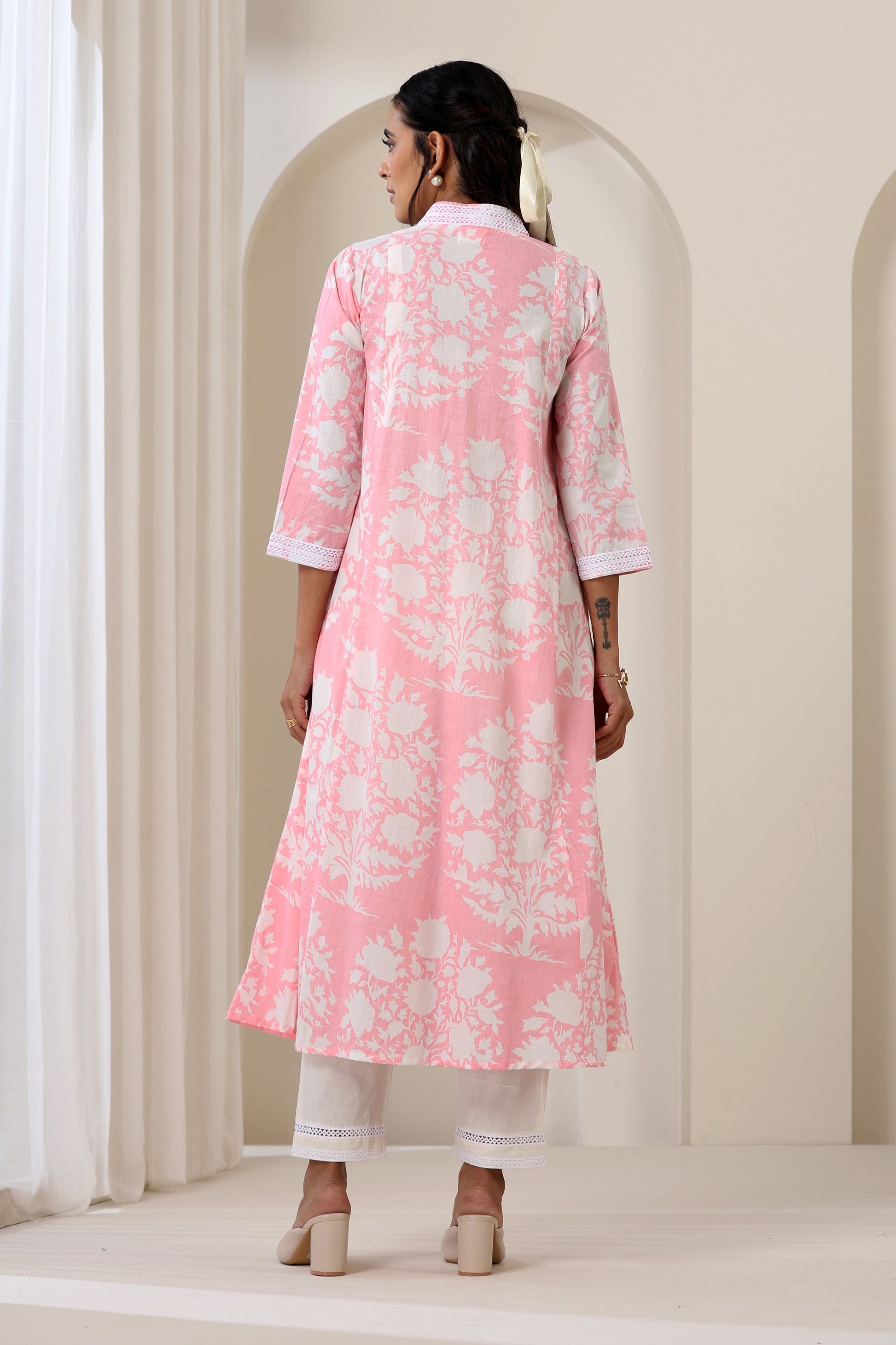 The Pink Audrey Kurta Set is handcrafted in the softest cotton fabric and comes as a comfy yet stylish two piece set, perfect for an outing in the summer. It comprises of an A-line gathered kurta with attractive lace detailing on the neckline, kalis and cuffs and it additionally has pockets for comfort. The look is completed with white pants with matching lace detailing.