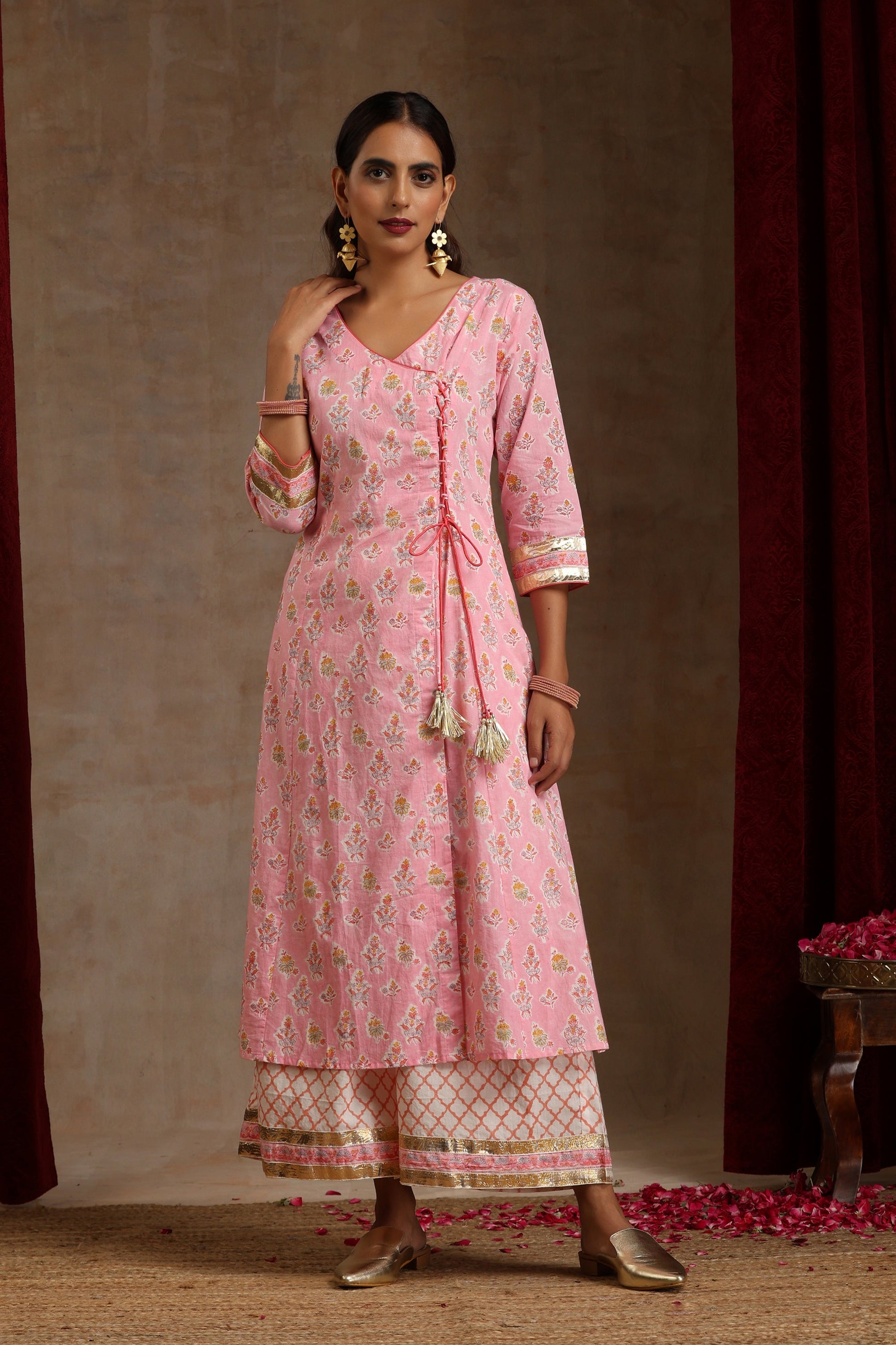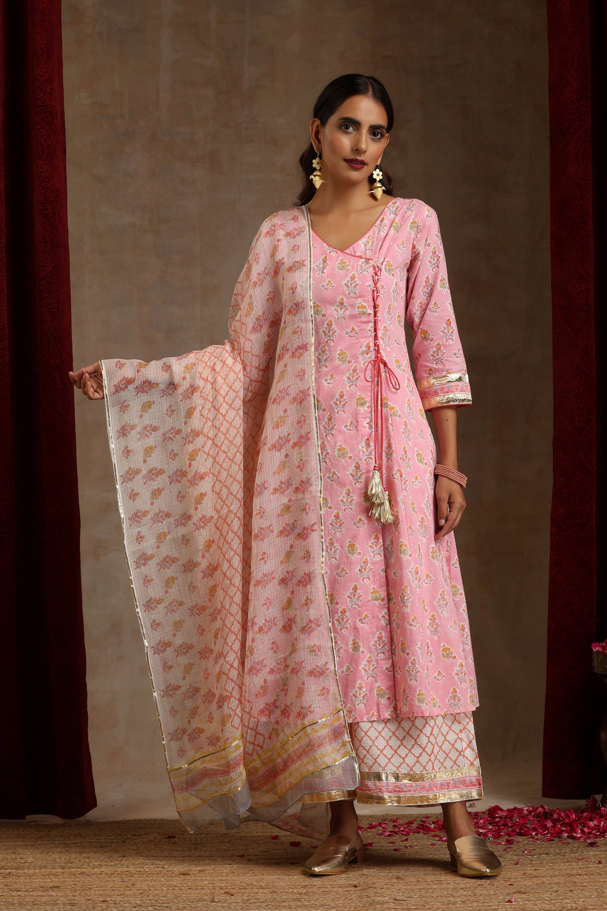 Graced with pleasing hand blockprinted floral motifs, our Pink Dahlia Angrakha Set showcases a soothing colour palette. Adorned with charming handmade gota and pearl bead tassels, the kurta is paired with wide palazzo pants enhanced with gold gota, making the outfit festive yet elegant. The look is completed a whimsical kota doria dupatta with dainty gota details.