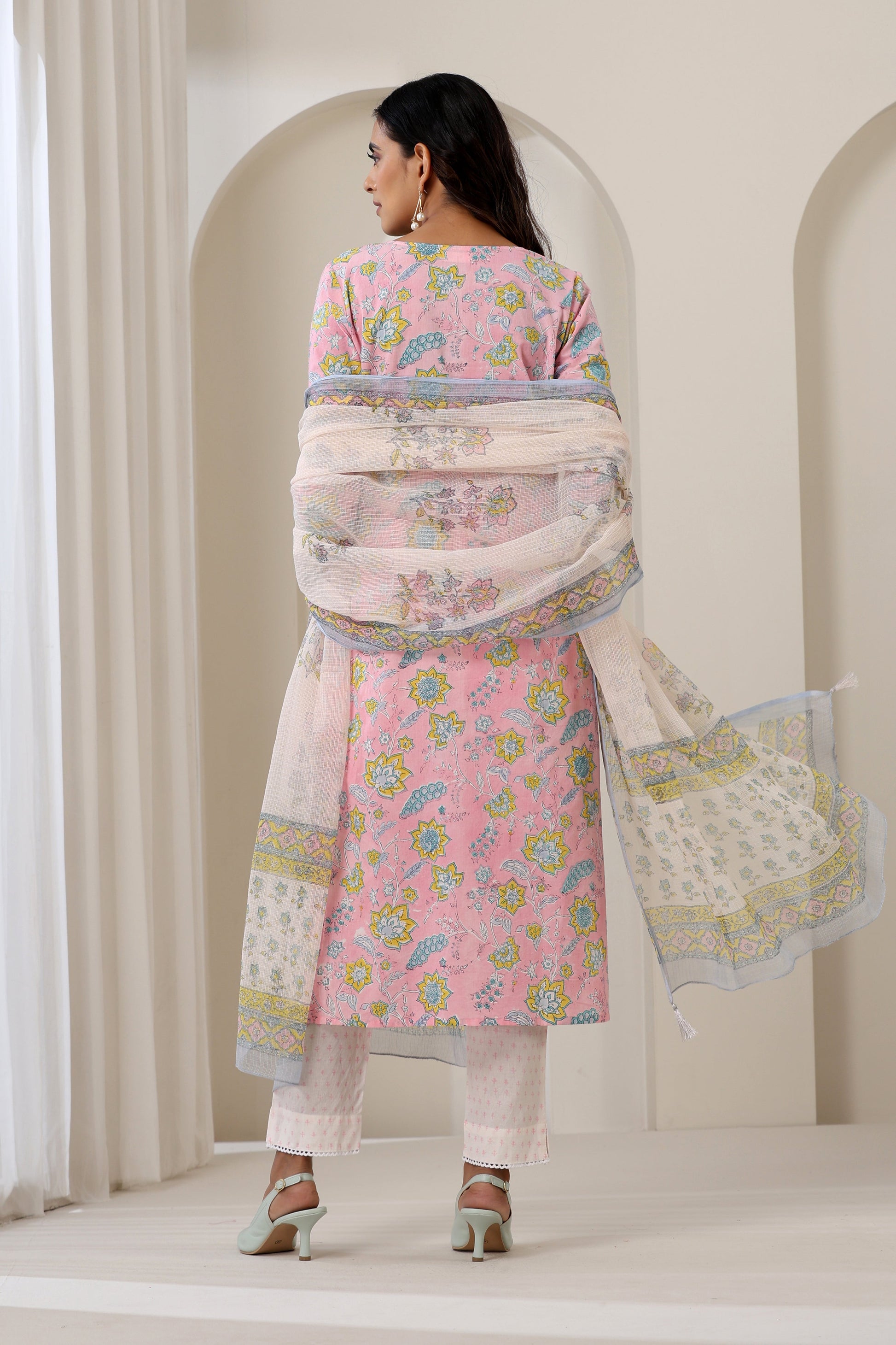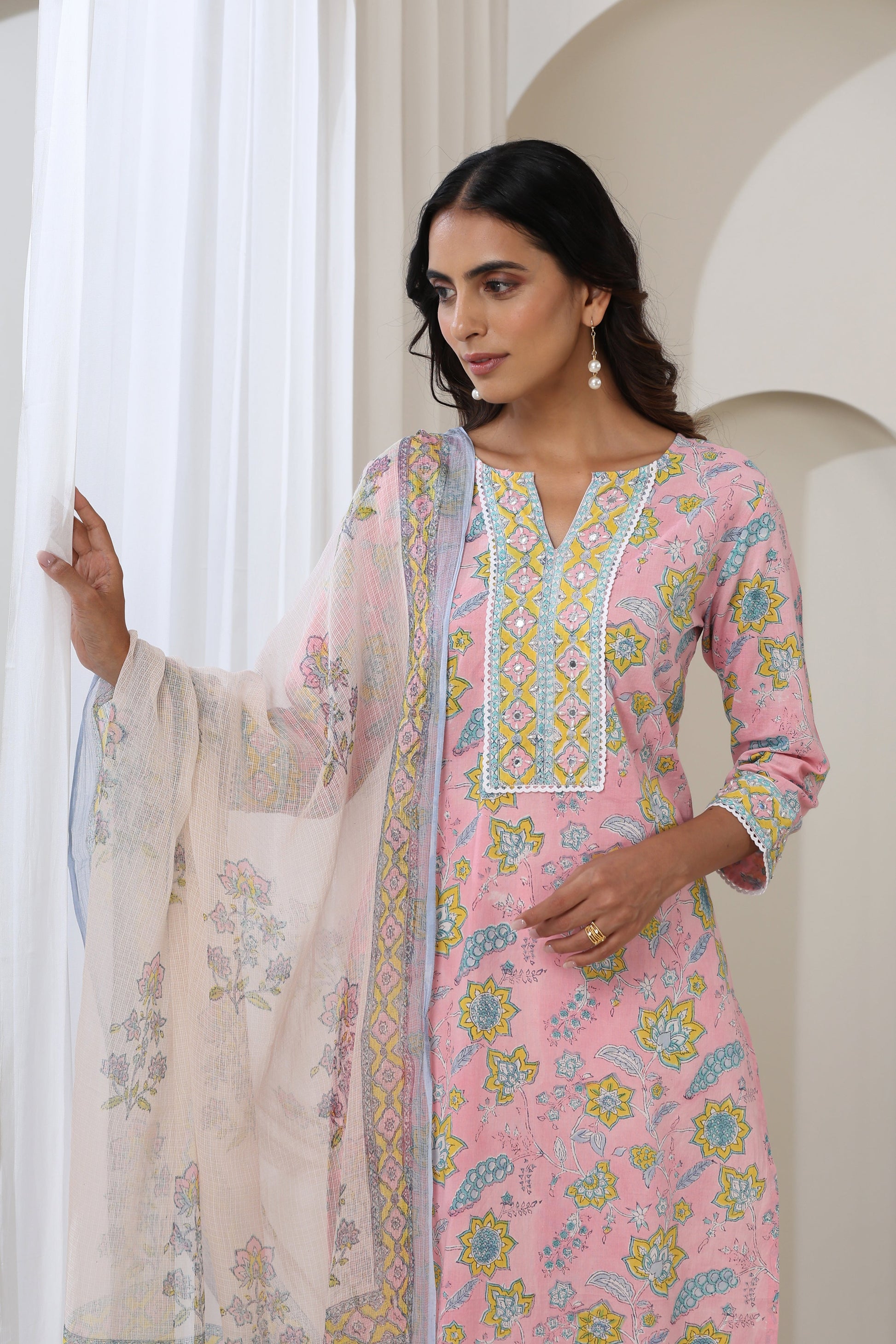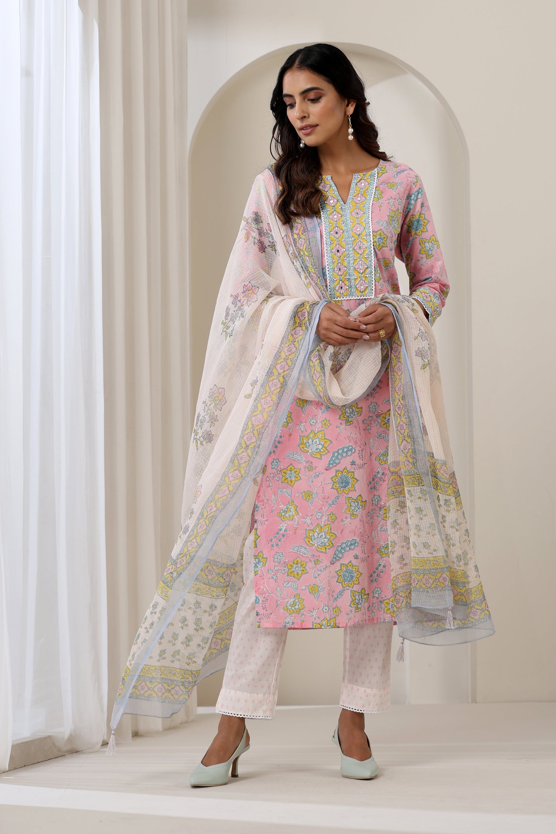 A perfect fit for your summer wardrobe, our Pink Orchid Embroidered Kurta Set showcases a fascinating hand-block printed floral jaal over a serene pink colour. Handcrafted with intricacy, this soft cotton kurta comes embellished with detailed mirror, pearl, and sequin hand embroidery work along the neckline and cuffs. It is further accentuated with lace detailing that adds to the charm. Pair it with contrasting pants and a whimsical Kota Doria dupatta with silver tassels!
