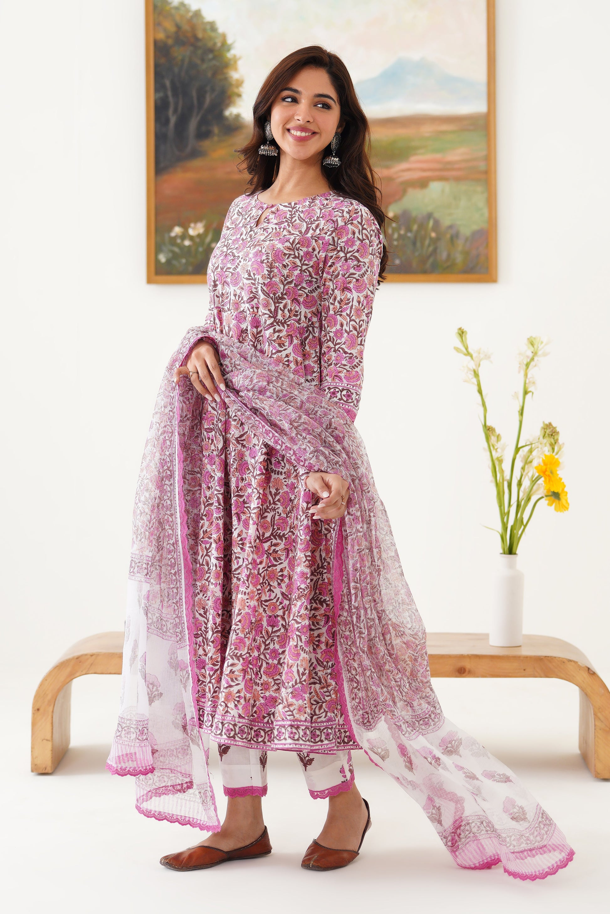 The Pink Penelope Anarkali Set showcases a dainty hand block-printed floral pattern against serene white, making it the perfect addition to your spring-summer wardrobe. Expertly handcrafted in soft cotton fabric, it comes with beautiful lace detailing on the cuffs, pants and all around the dupatta. It is paired with matching straight motif pants and a whimsical kota doria dupatta!