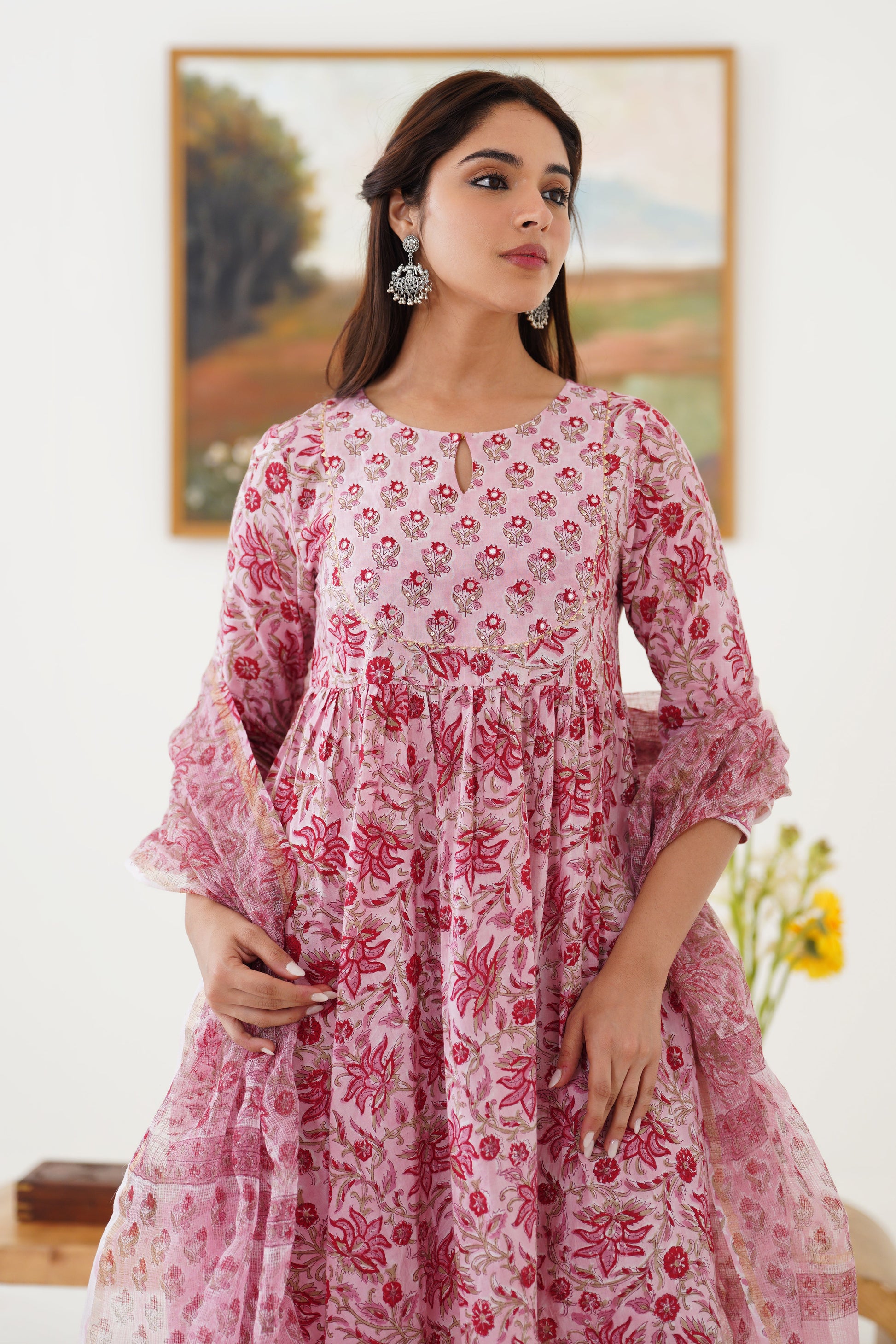 Showcasing a striking hand-block printed floral pattern, our Pink Petunia Embroidered Anarkali Set comes in a soothing pink colour. Handcrafted in the softest cotton fabric, this anarkali kurta comes embellished with intricate mirror and sequin hand embroidery work on the yoke and gold gota detailing on the cuffs and hem for added charm. The look is completed with matching straight pants and a whimsical Kota Doria dupatta.