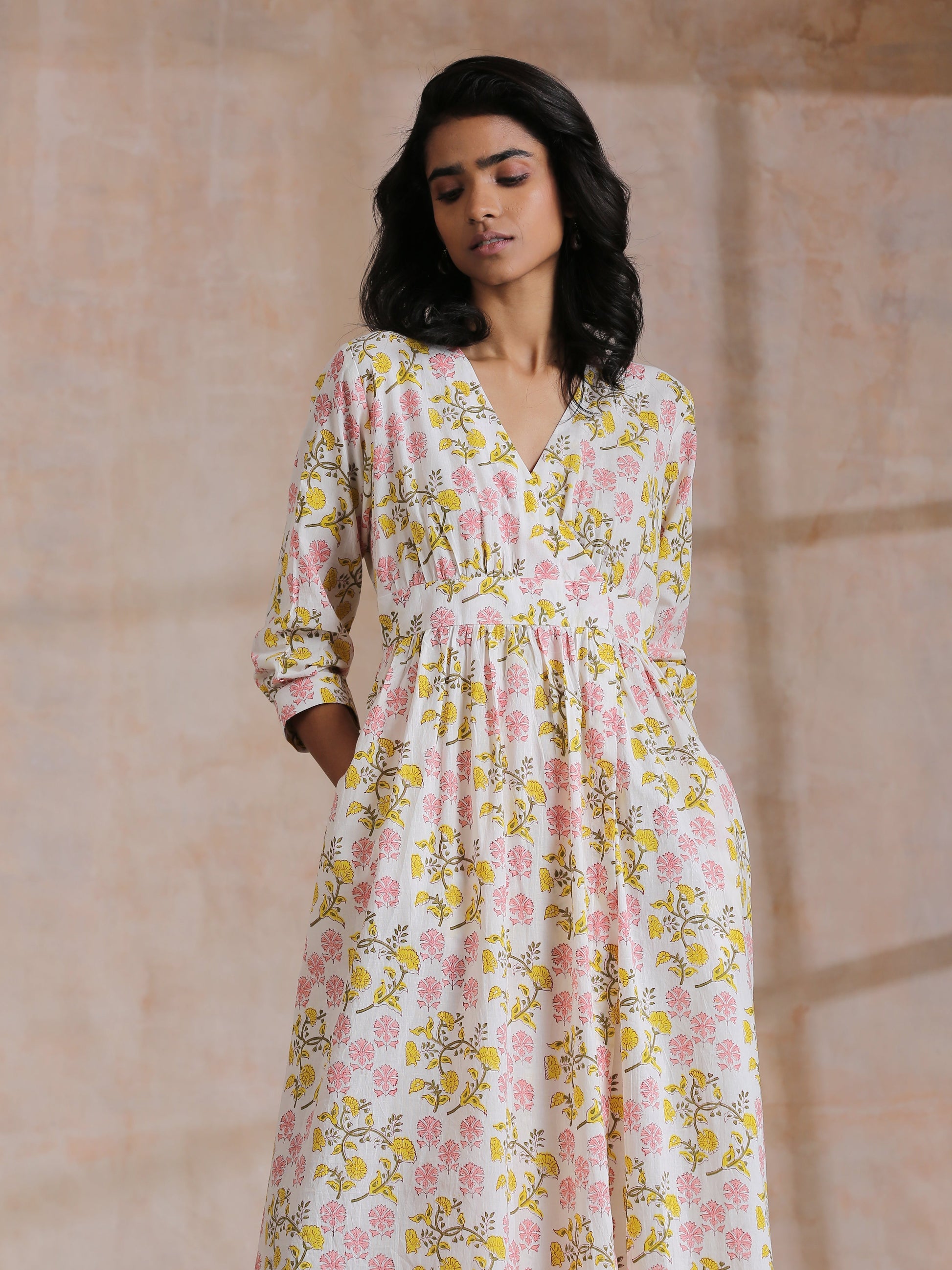 Pink Yellow Floral On White Block Print Cotton Wrap Dress