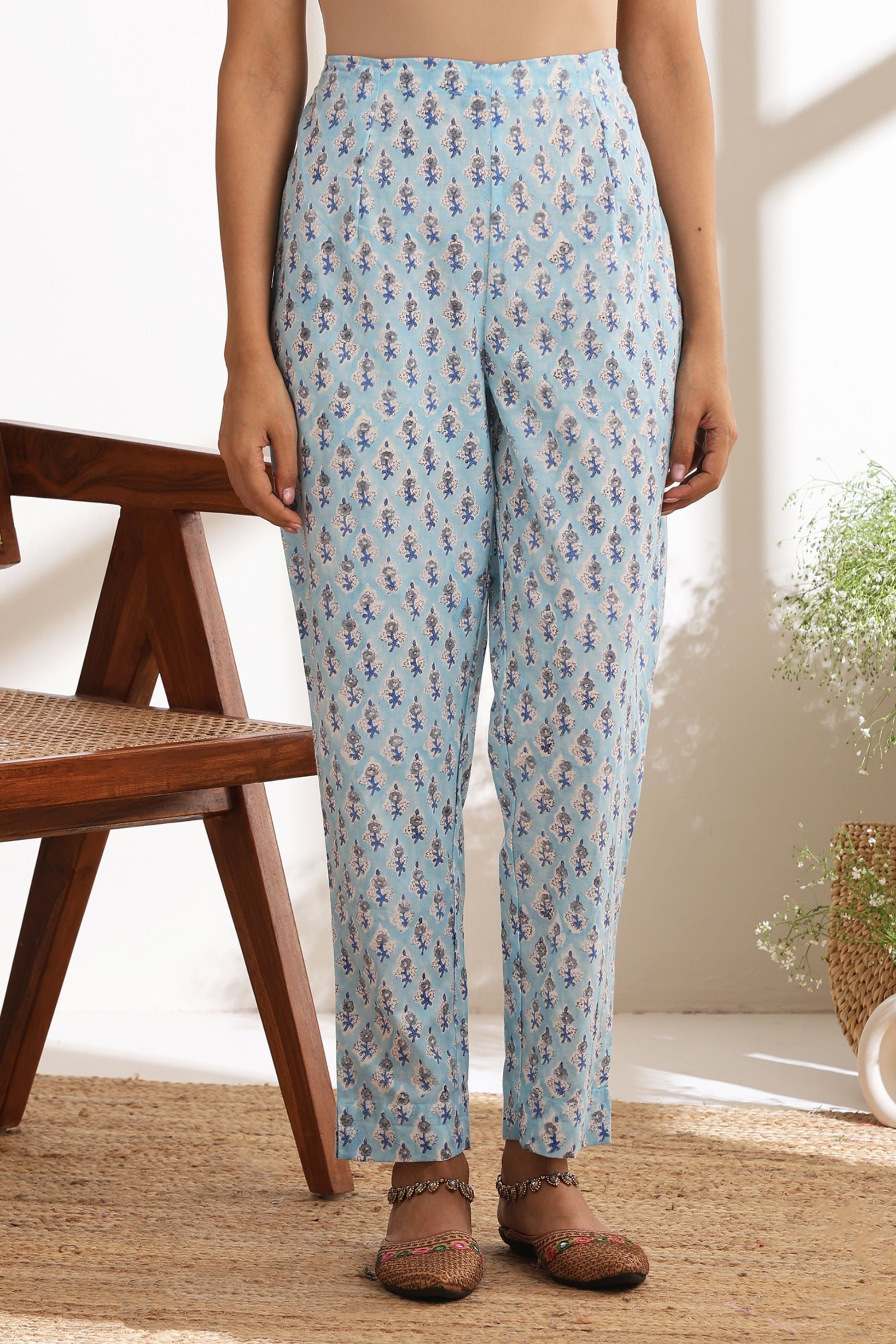 Showcasing a striking hand block printed floral pattern, our Powder Blue Anarkali Set comes in a soothing blue shade. Handcrafted in the softest cotton fabric, this anarkali kurta comes embellished with intricate sequin hand embroidery work on the yoke and silver gota detailing on the cuffs and hem for added charm. The look is completed with matching straight pants and a whimsical kota doria dupatta.