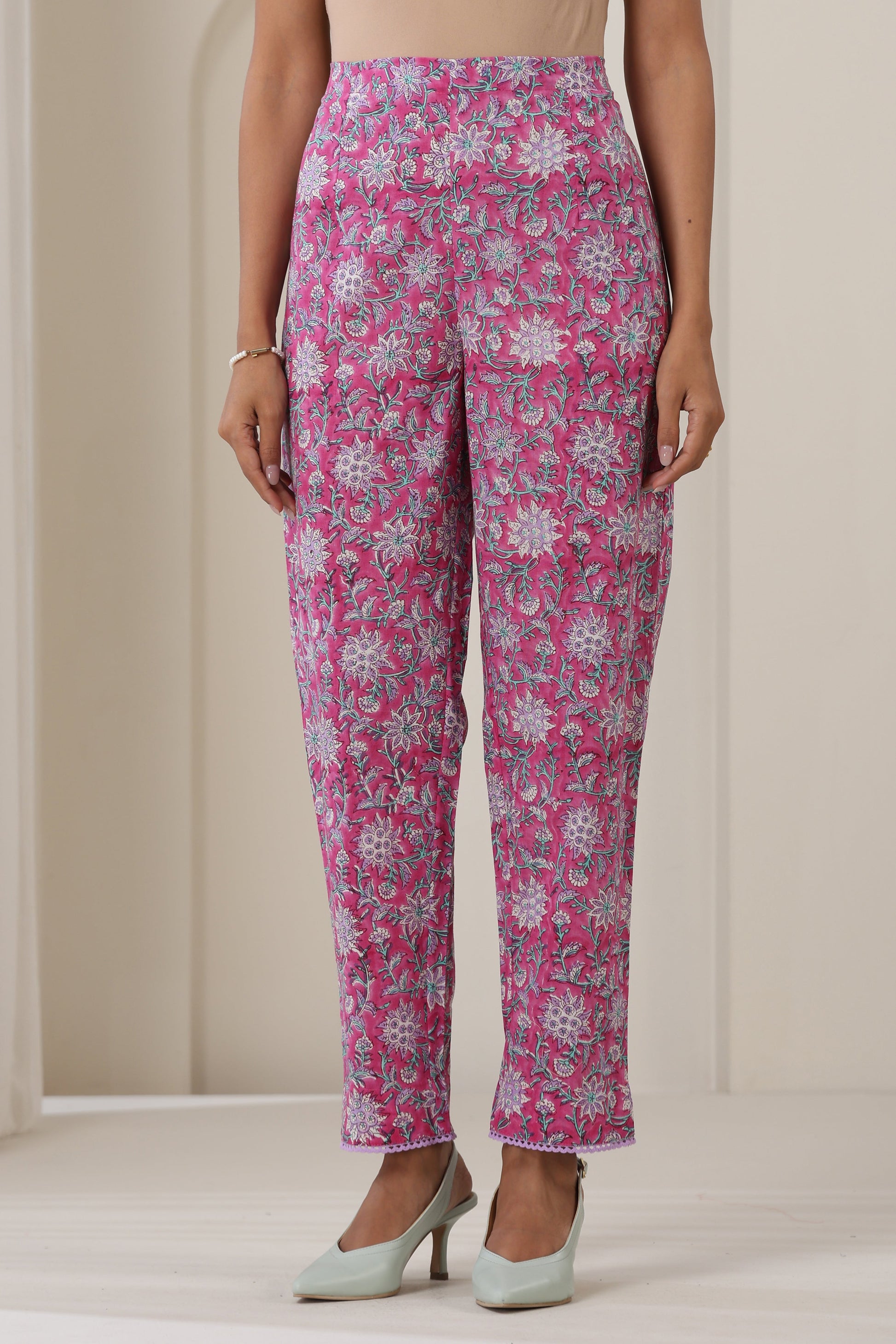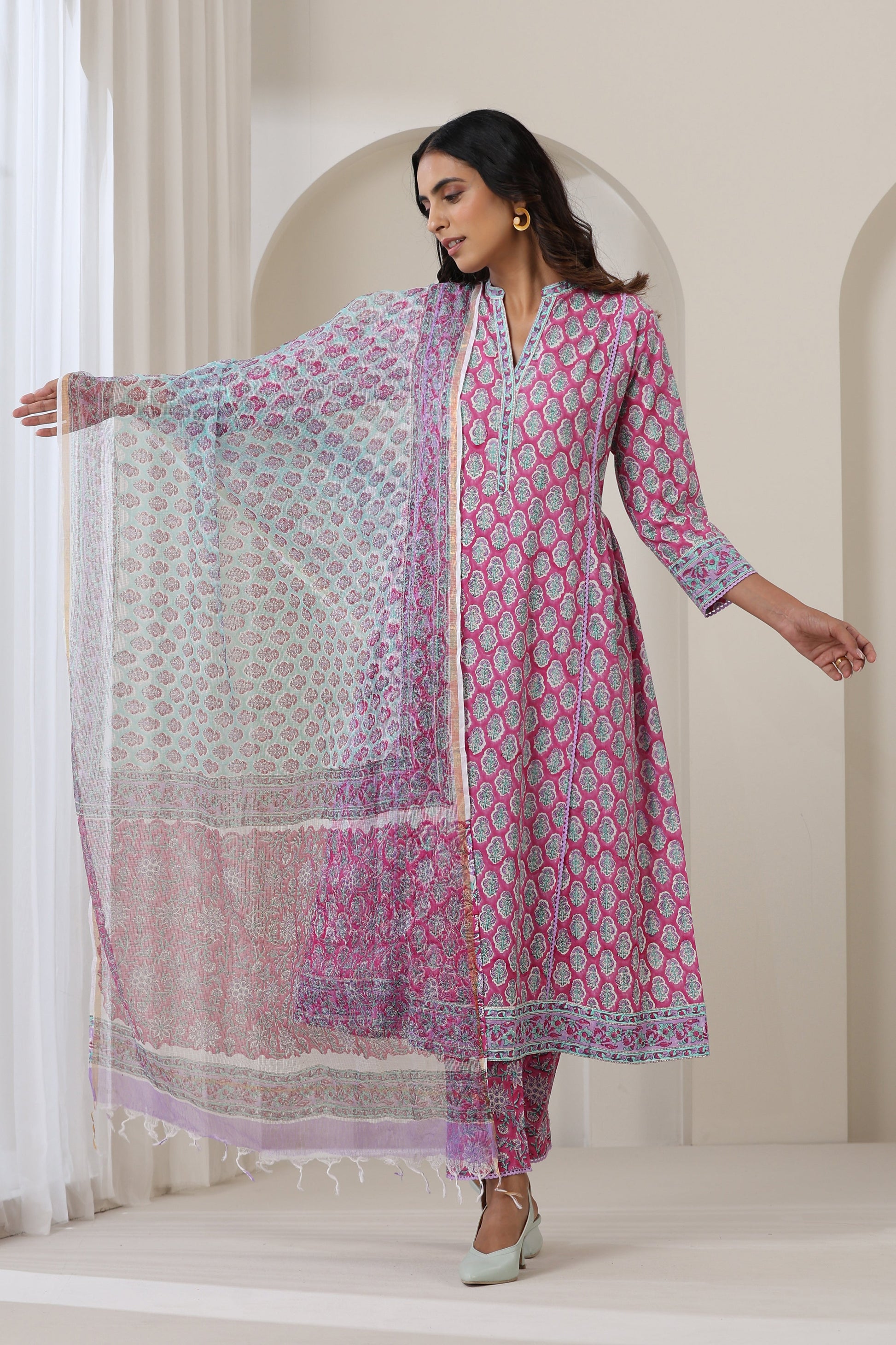 The Purple Aster Gathered Kurta Set is graced with pleasing hand block printed lavender floral motifs against a striking berry colour. Expertly handcrafted in soft cotton fabric, this gorgeous kurta comes in an A line silhouette with side gathers that accentuate the waist beautifully. The outfit is further enhanced with purple lace detailing along the kalis, cuffs and pants. The look is completed with matching jaal straight pants and a contrasting aquamarine kota doria dupatta!