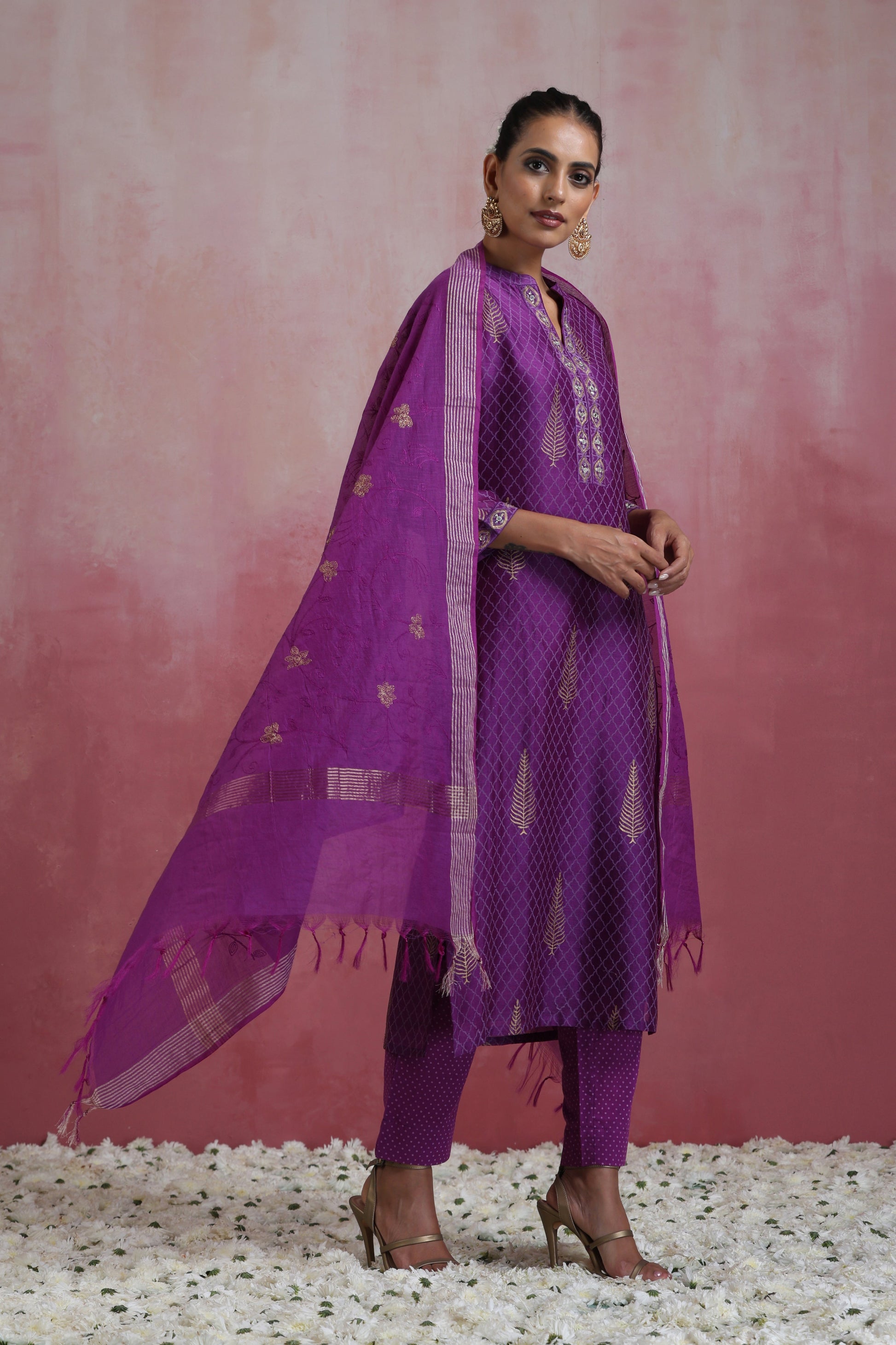 Our Purple Merlin Embroidered Chanderi Kurta Set is graced with pleasing hand-block printed gold khadi motifs against a striking purple colour on lush chanderi fabric, making it an ideal outfit for the festive season. Adorned with charming sequin and mirror hand embroidery on the neckline and cuffs, this kurta set is a sure shot headturner! The look is completed with a unique gold zari and thread embroidered chanderi dupatta and matching straight pants.