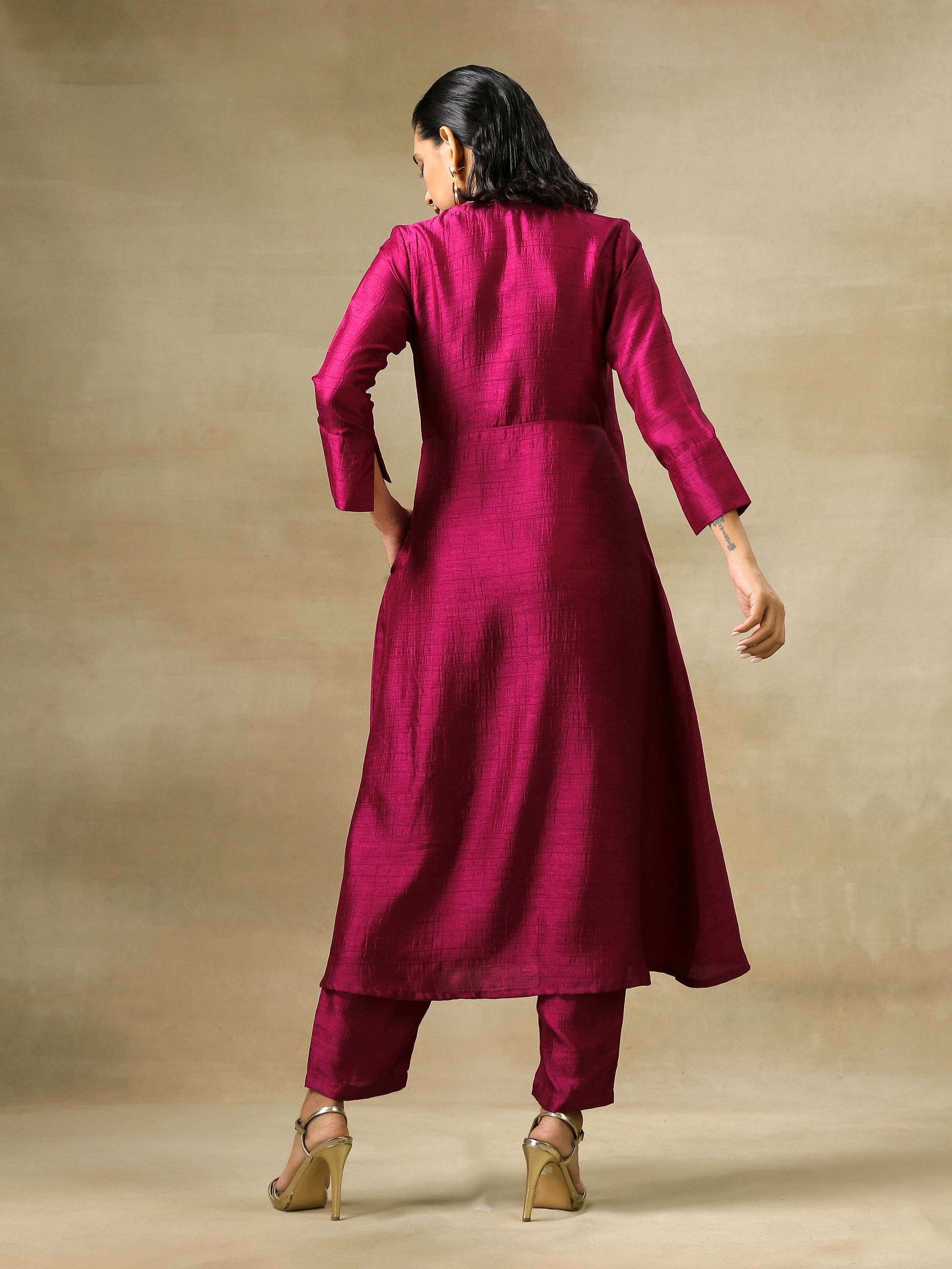- Purple silk-blend angrakha kurta set with v-neck and cuff details in the sleeves. It has pockets on both the sides. Paired with purple pair of pants. Color and cut will stand out in every Festive Occasion.