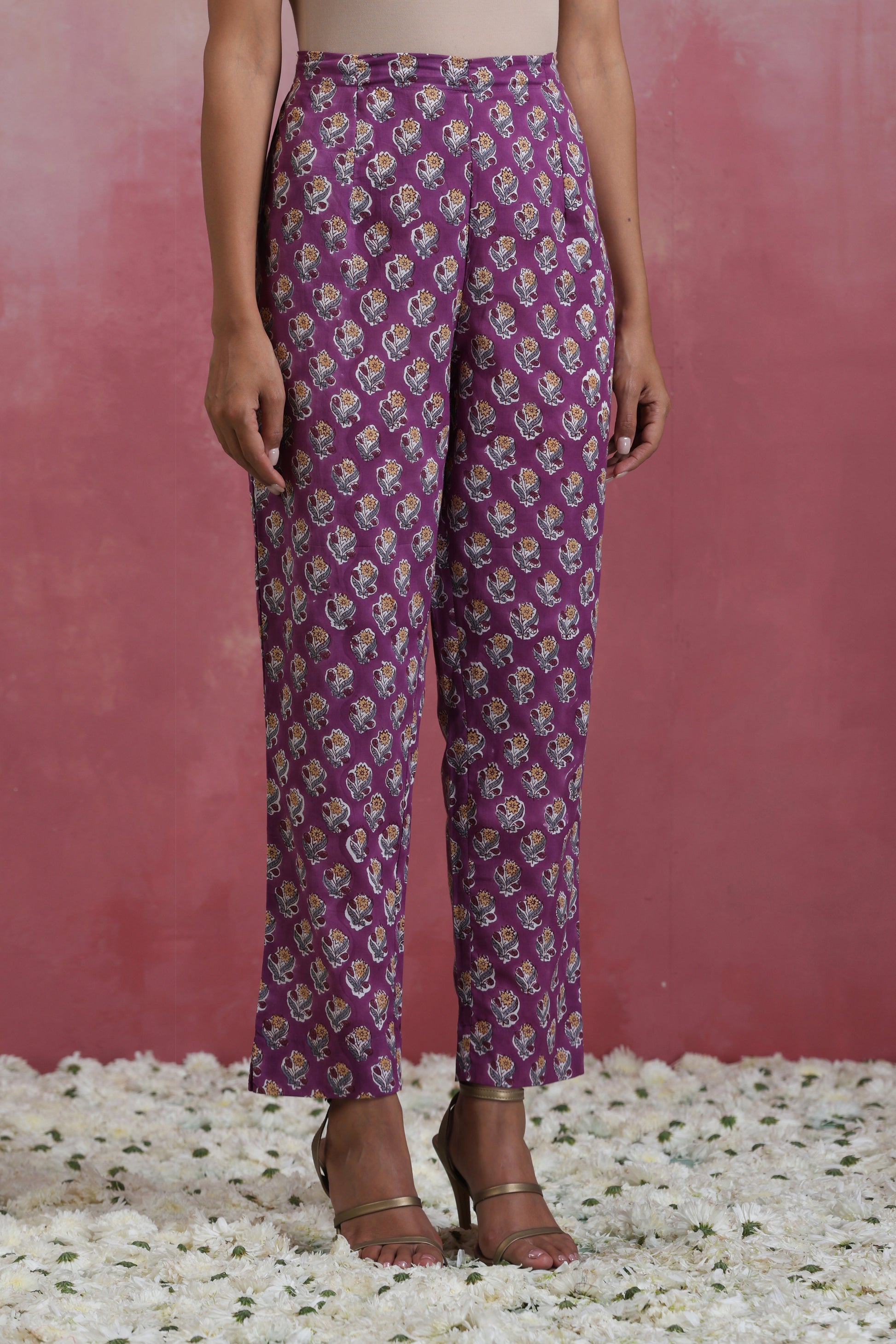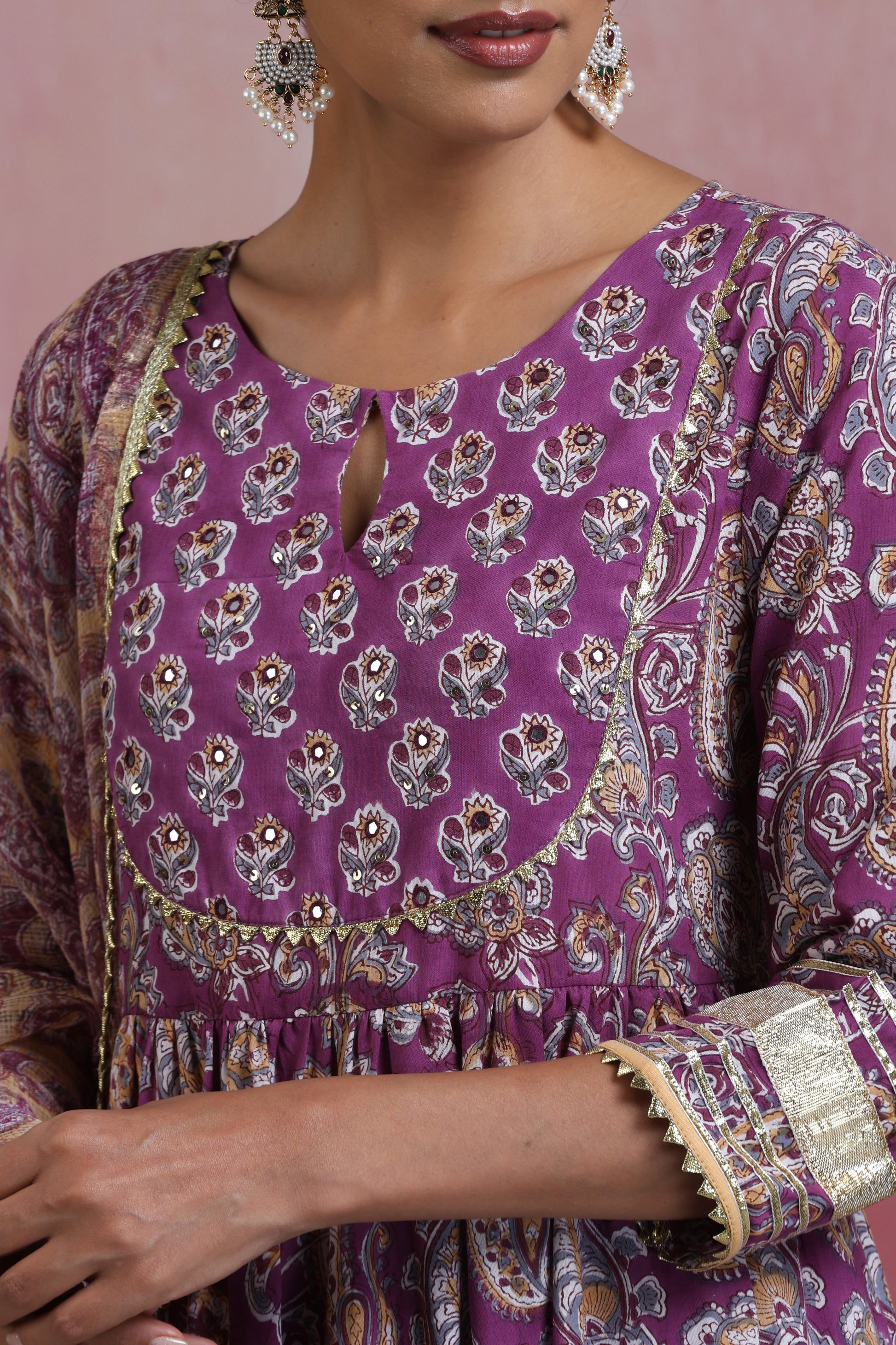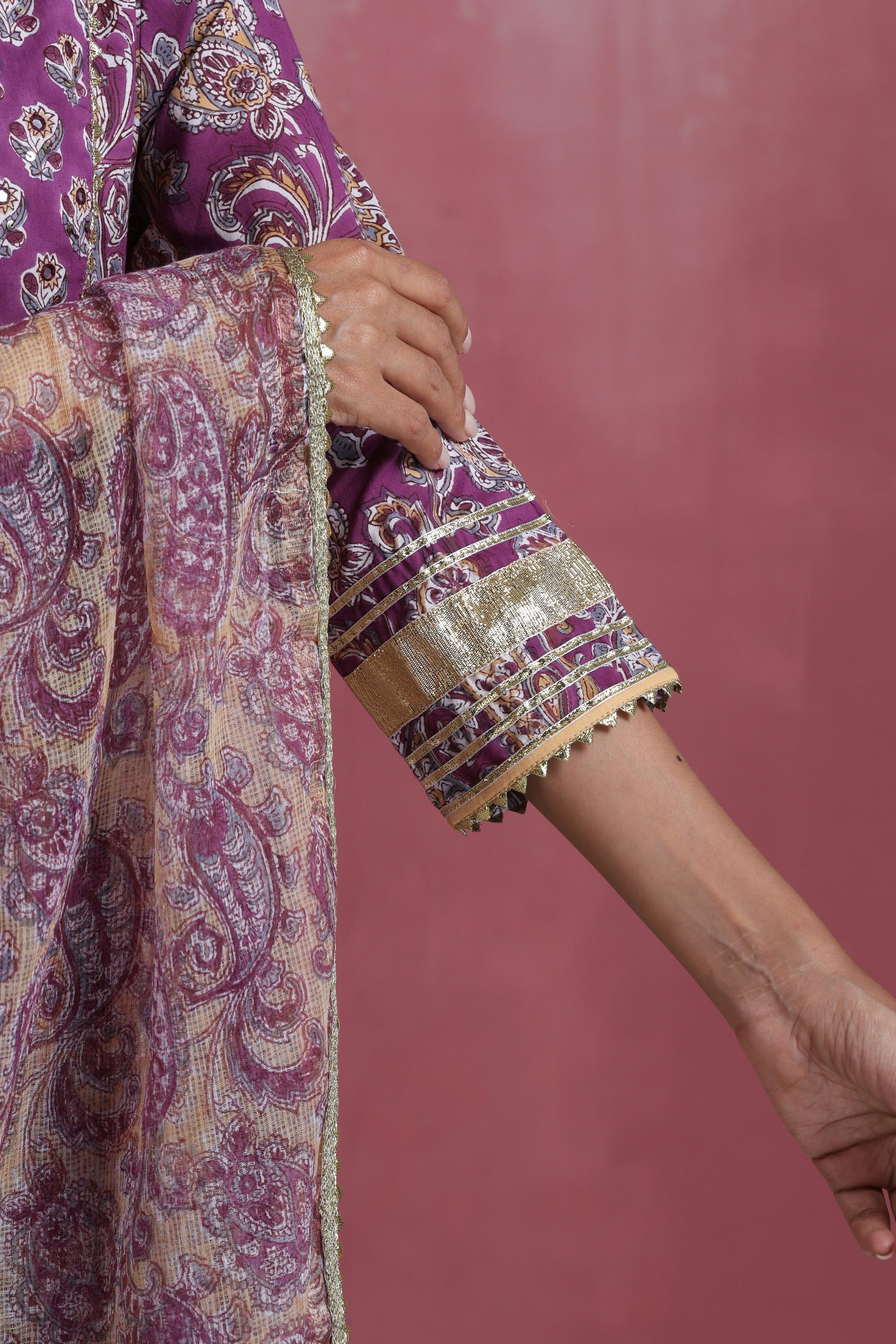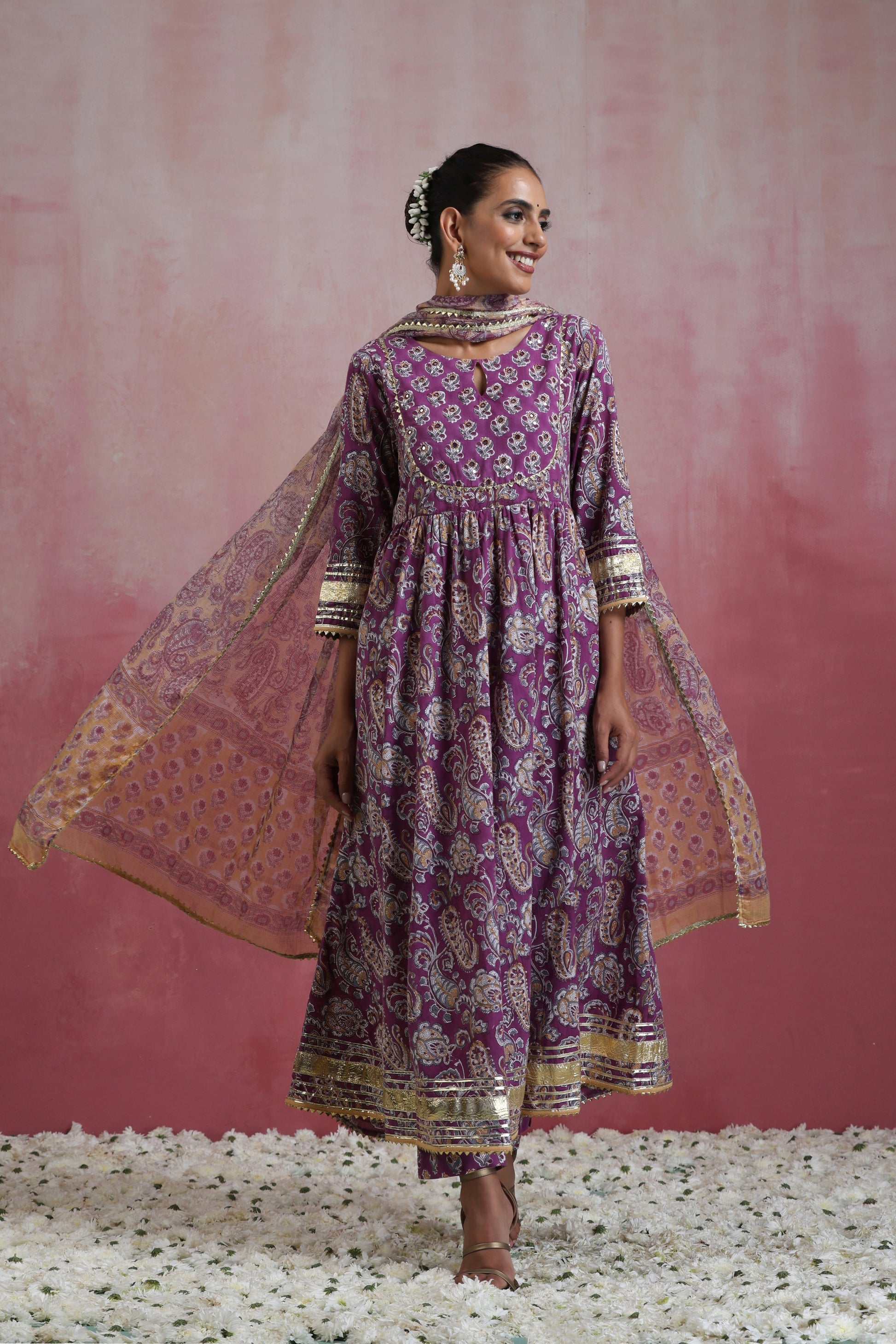 Showcasing a striking hand-block printed paisley floral pattern, our Purple Zairah Embroidered Anarkali Set comes in a rich violet colour. The kurta comes embellished with an intricate mirror and sequin hand embroidery work on the yoke and gold gota detailing on the cuffs and hem for added charm. The look is completed with straight pants and a whimsical Kota Doria dupatta with matching gold lace detailing, making it an ideal outfit for the upcoming festivities!