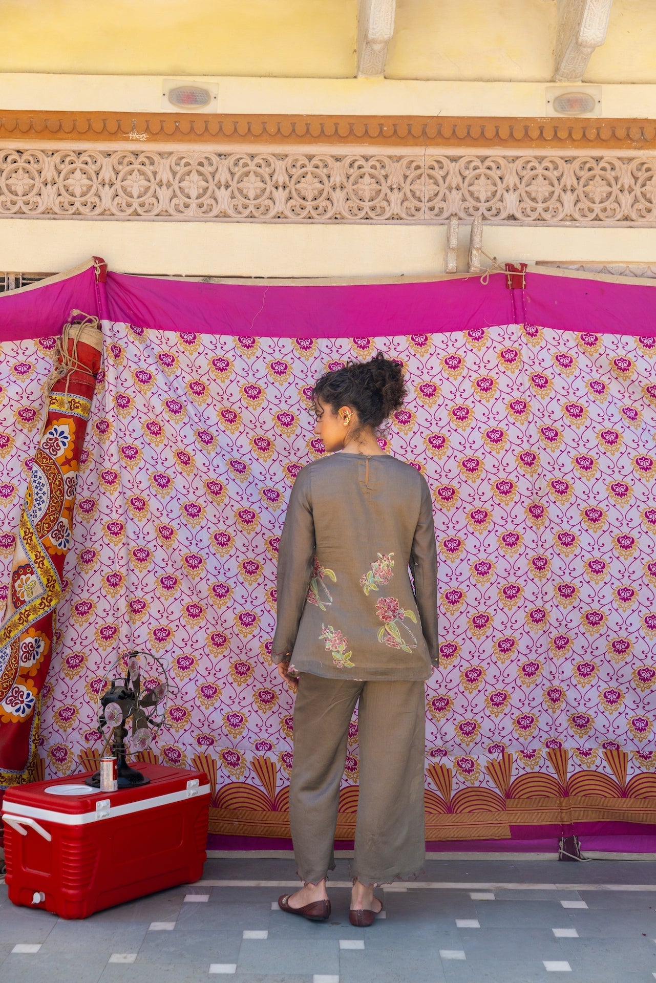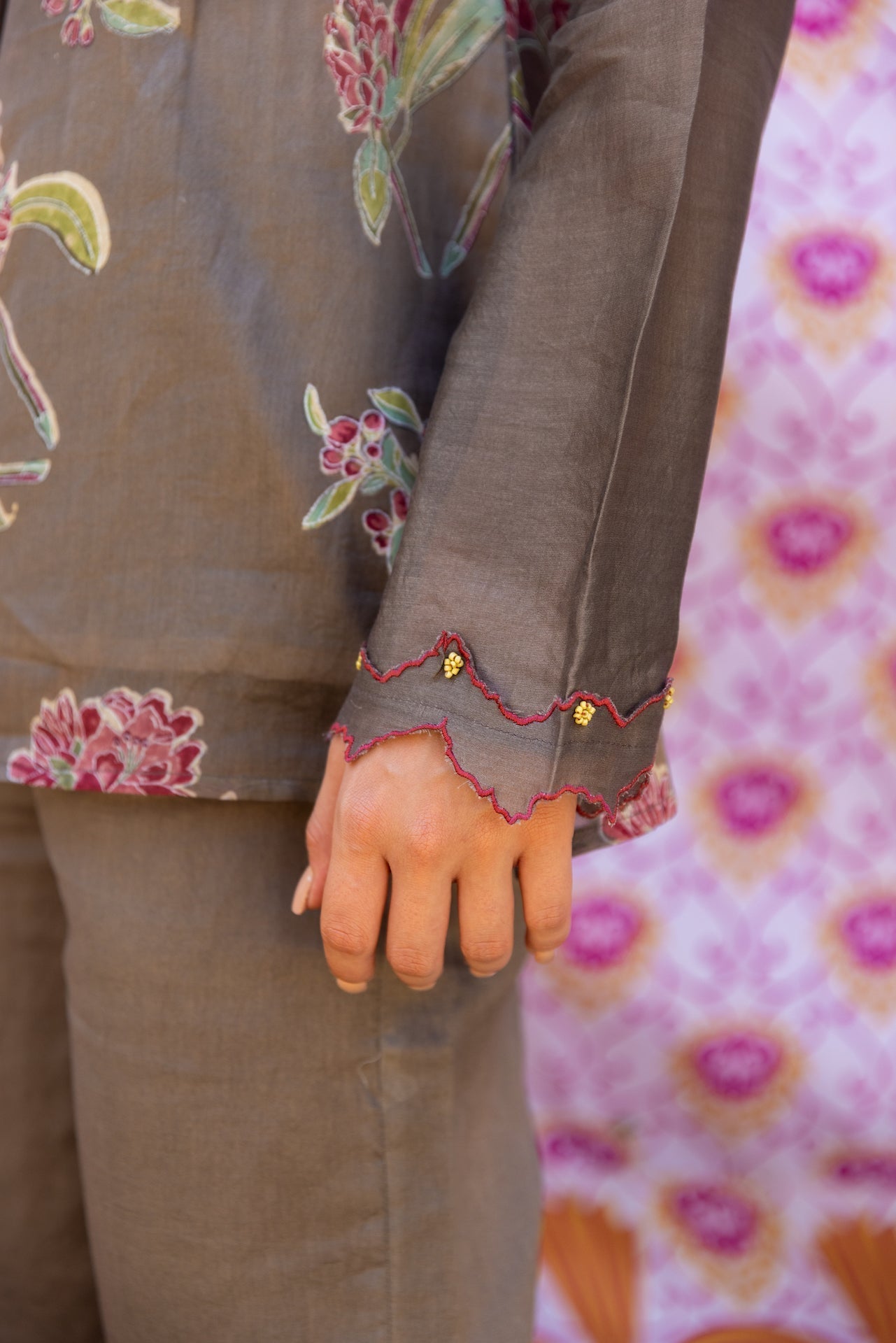 In serene Grey Chanderi, the Raina set blends a round neck and full sleeves with a relaxed silhouette. Subtle print work adds softness to the polished finish. Perfect for day-to-evening plans. Sleeves