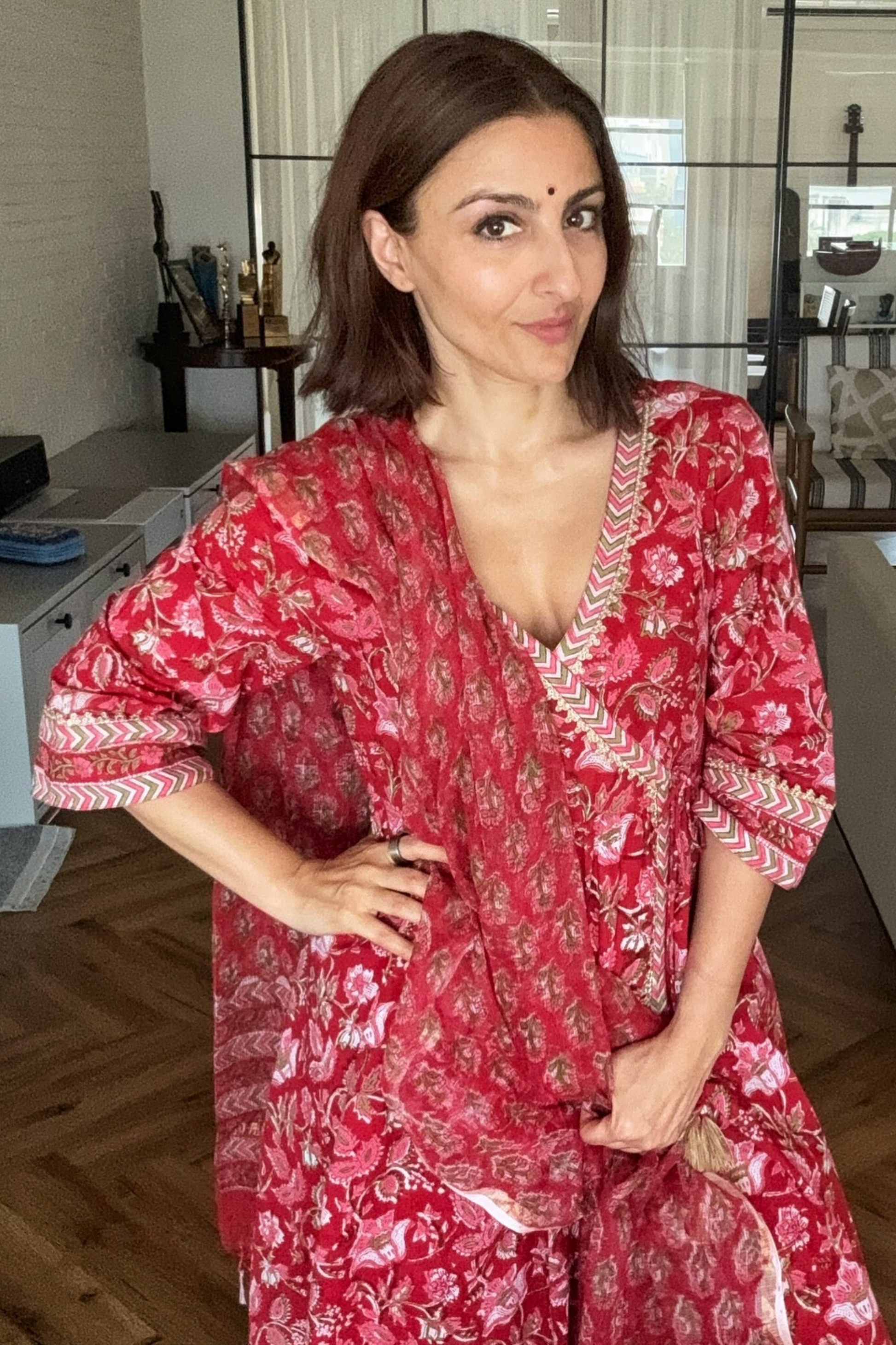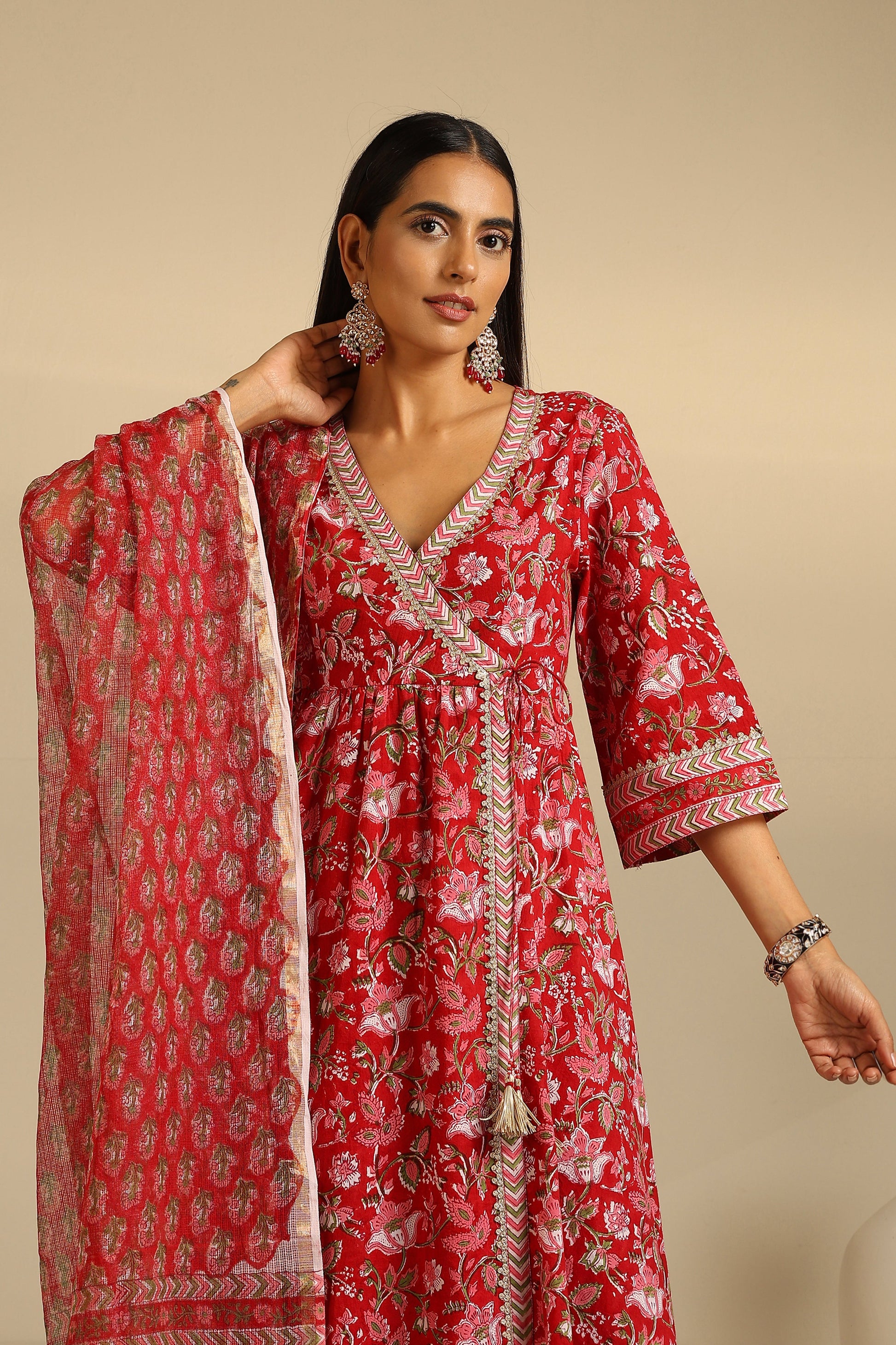 Showcasing a striking floral pattern, our Red Sapphire Anarkali Set comes in an attractive crimson color. Handcrafted in the softest cotton fabric, this angrakha kurta is adorned with the prettiest gold lace and enhanced with exclusive handmade bead and gota tassels for added charm. The look is completed with motif palazzo pants with matching lace detailing and a whimsical Kota doria dupatta, making it ideal for summer festivities.