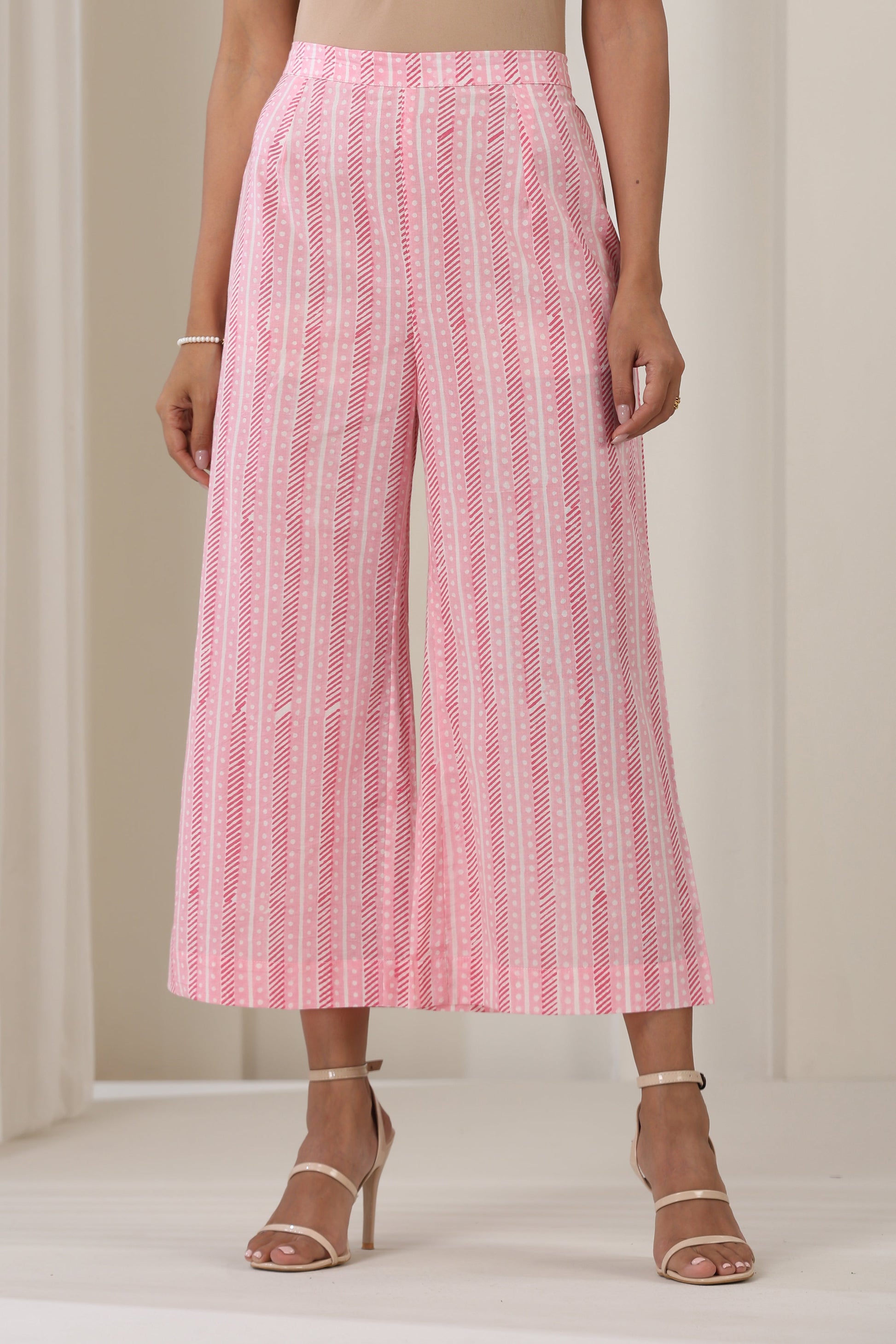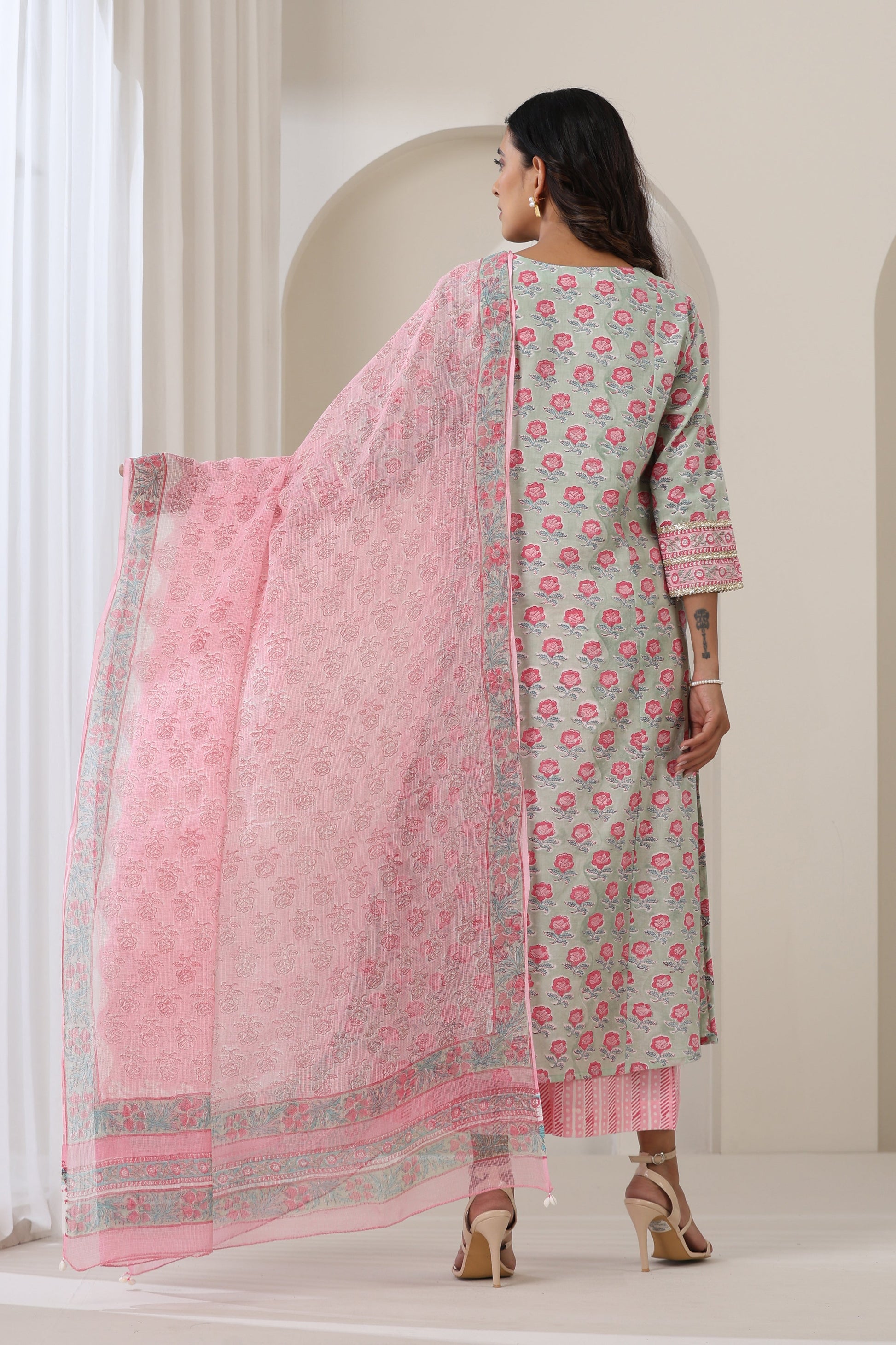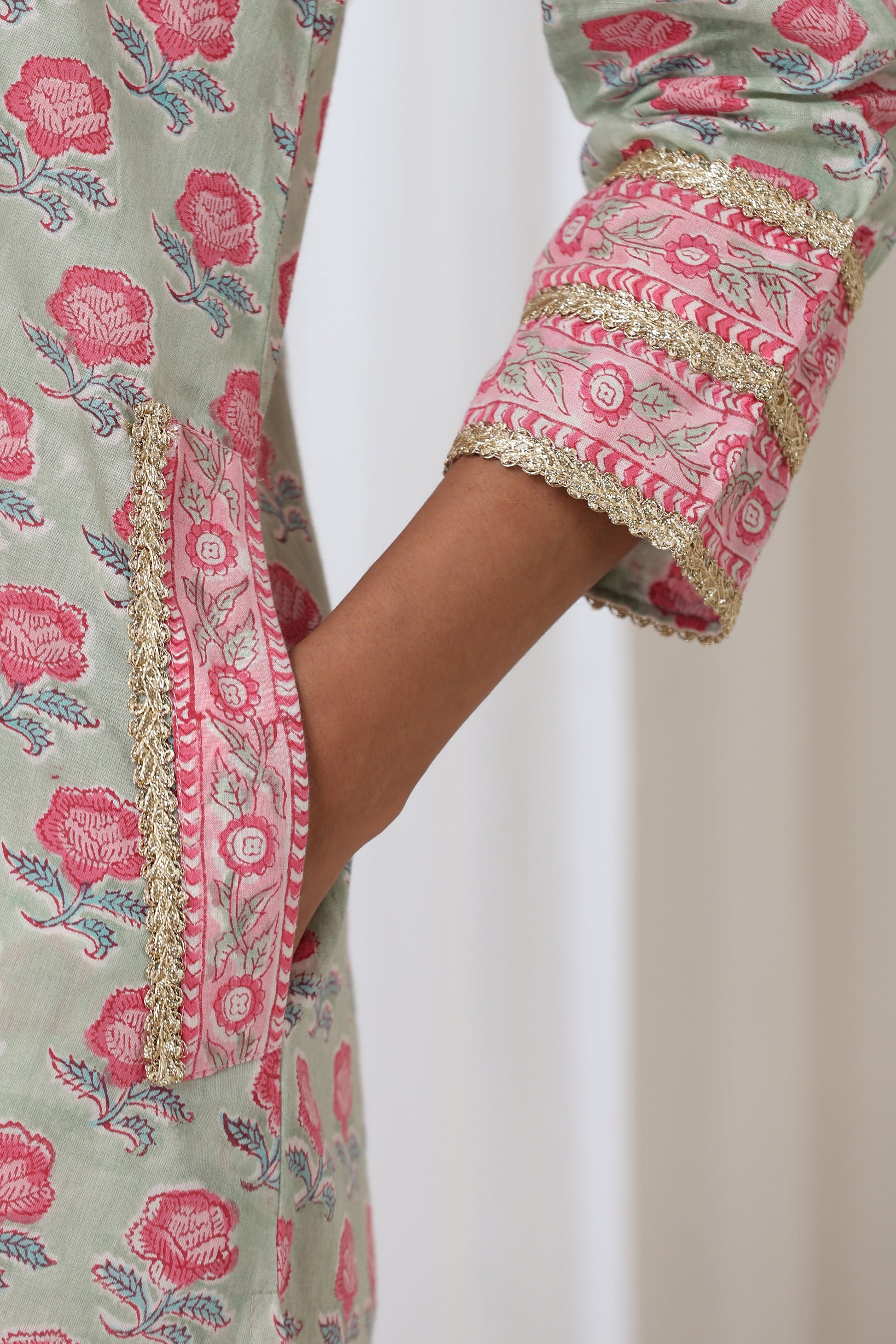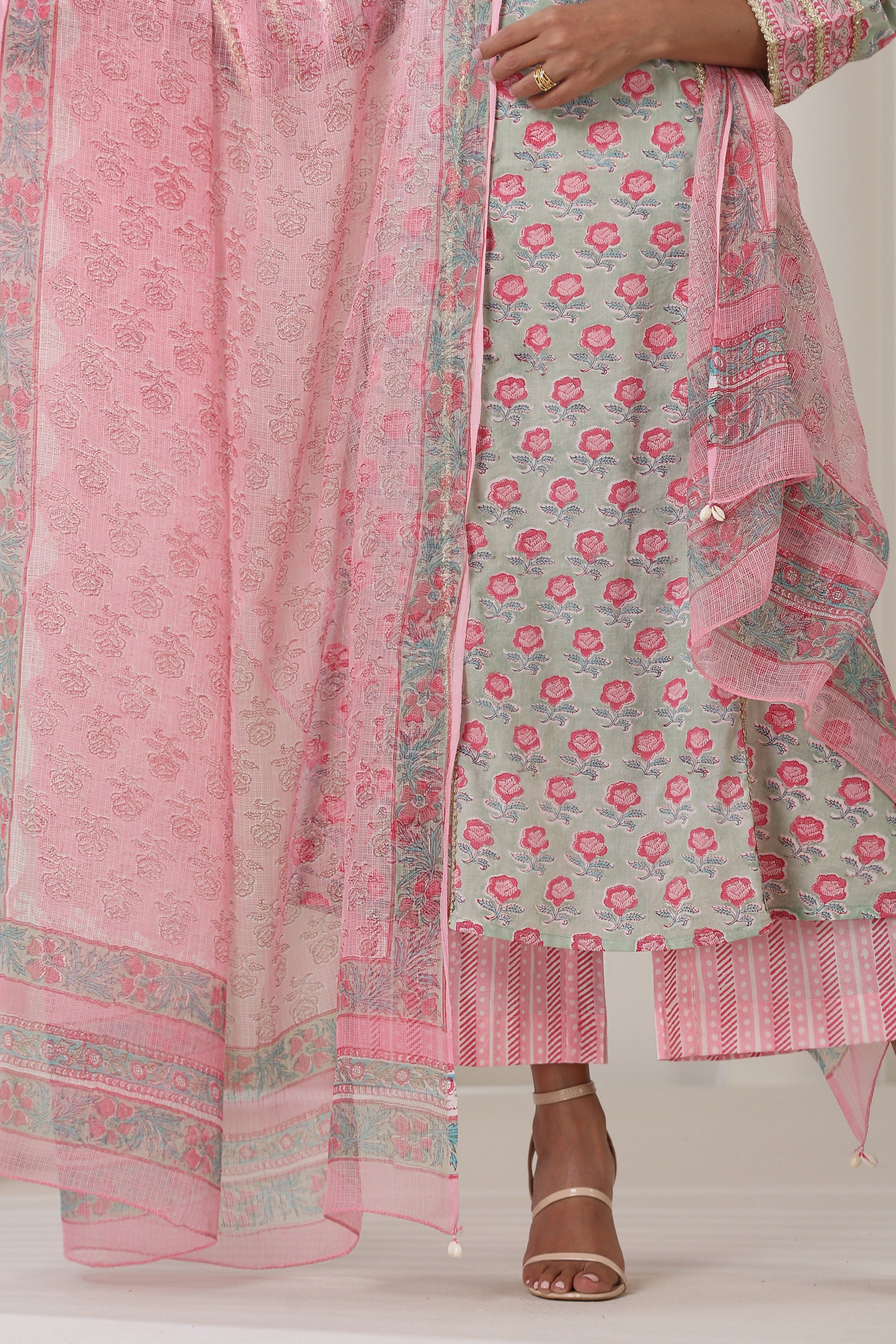 Our Serene Green Kurta Set is graced with pleasing hand-block printed pink floral motifs against a soothing green colour. Adorned with charming gold braided lace, this set with statement pockets and the comfiest palazzos is a sure-shot head turner. Team it with the whimsical contrasting pink Kota Doria dupatta enhanced with shell detailing, to complete your look!