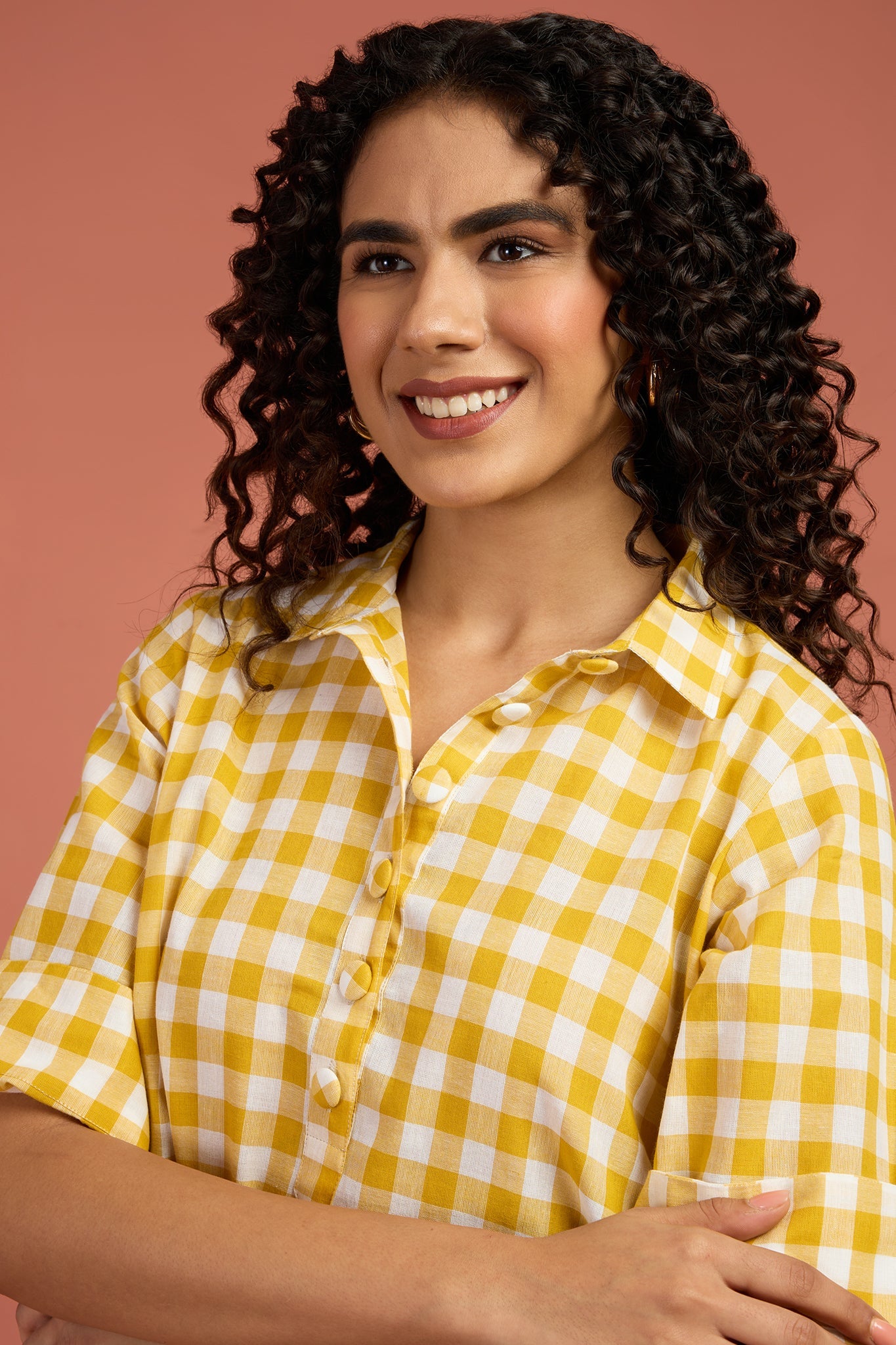 Maati Craft Gulabi Sunlit Grid Cotton Boho Collar Dress